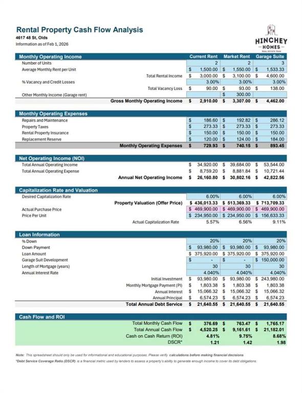 Investors will appreciate the long-term optionality. The site carries higher-density zoning (historically R3, now consolidated into the Town’s Mixed Use framework), supporting future redevelopment or added density where approved. Current rents are below market, offering a straightforward path to increased cash return, and the approved garage suite adds a second lever (see attached cash flow scenarios). Finally, Olds has announced a proposed 1 GW “Synapse” data centre development, a meaningful demand catalyst to watch as it progresses.