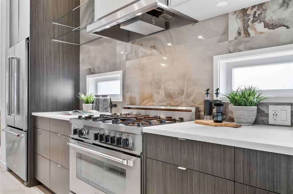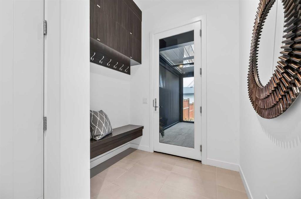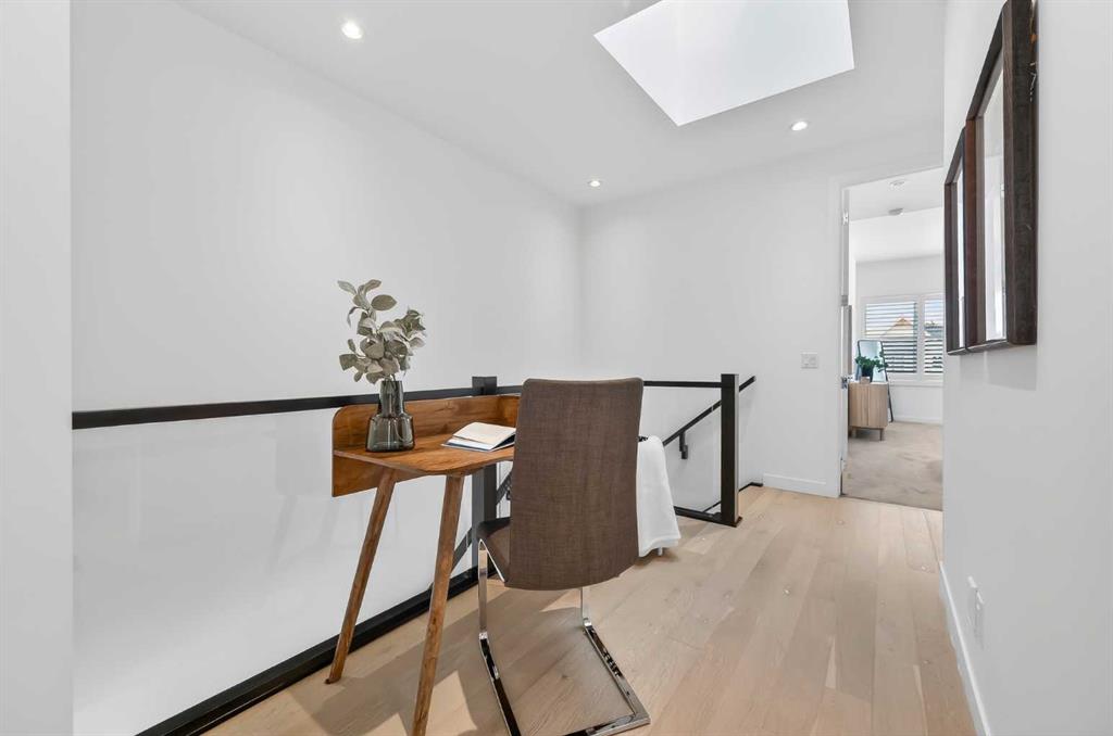 The chef-inspired kitchen is the centrepiece of the home, showcasing a remarkable 16-foot two-toned quartz island with feature lighting above. Premium stainless steel Italian appliances include a 5-burner F.lli Bertazzoni gas range, complemented by a porcelain tile backsplash and unique lower window detailing beneath the cabinetry—an uncommon and thoughtful design element that enhances natural light. The kitchen flows seamlessly into the living room, where a gas fireplace with bookmatched marble porcelain tile creates a warm and sophisticated focal point. Double sliding doors open to a truly standout outdoor retreat. A professionally installed Suncoast enclosure—valued at over $53,000—creates a year-round oasis complete with built-in electric heaters, a gas-assisted fireplace, and generous seating space. Ideal for entertaining or relaxing, this space extends your living area in every season. A spacious mudroom with built-in cabinetry and a stylish powder room complete the main level. Upstairs, hardwood flooring continues throughout, leading to an open workspace enhanced by a large skylight. The upper laundry room is well-equipped with a sink, quartz countertops, and ample cabinetry. Two spacious bedrooms and a beautifully finished full bathroom with quartz surfaces and a fully tiled tub/shower complete this level.