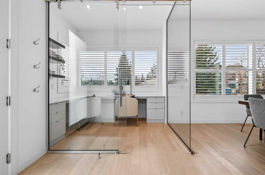 A private corner entrance welcomes you into a bright, open main floor highlighted by soaring 10-foot ceilings and wide-plank white oak engineered hardwood. At the front, a striking glass-enclosed office framed by south-facing windows creates a light-filled workspace. The adjacent formal dining area is anchored by a statement glass globe chandelier, perfect for entertaining.
