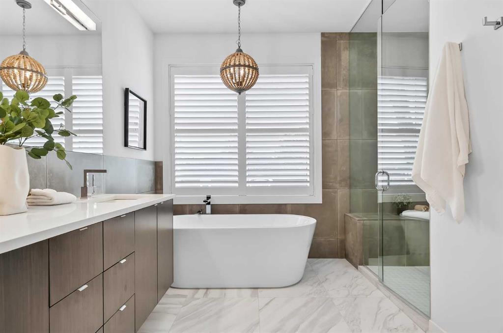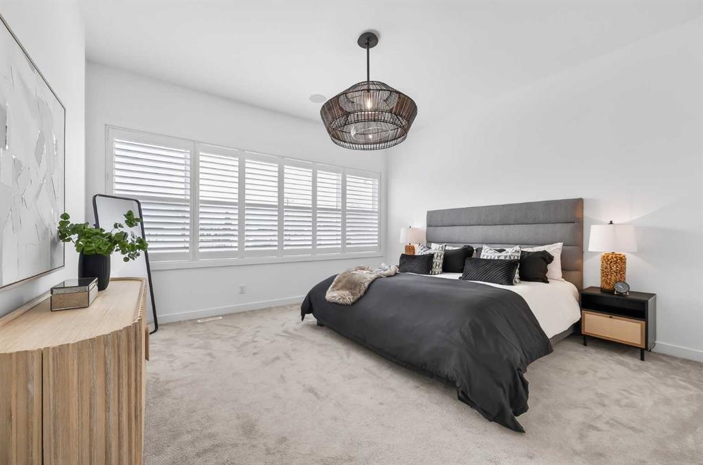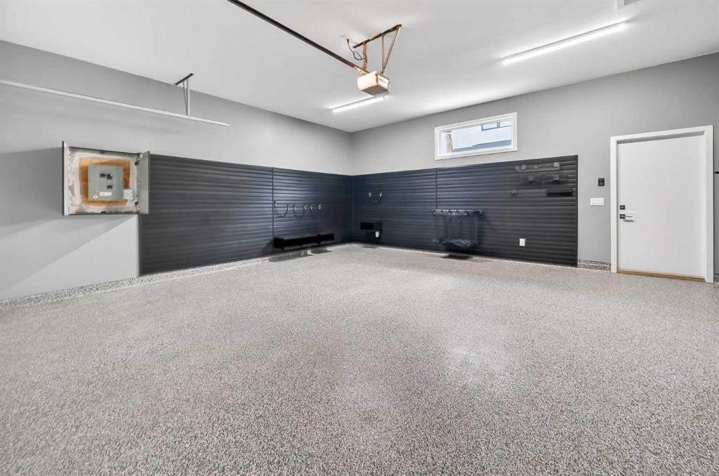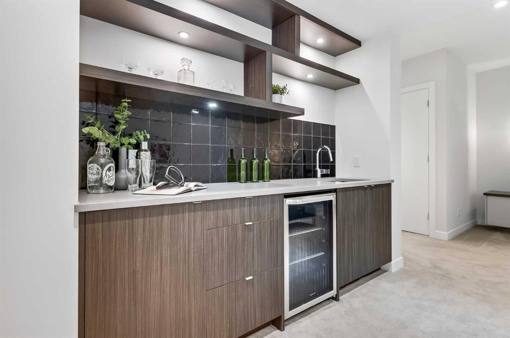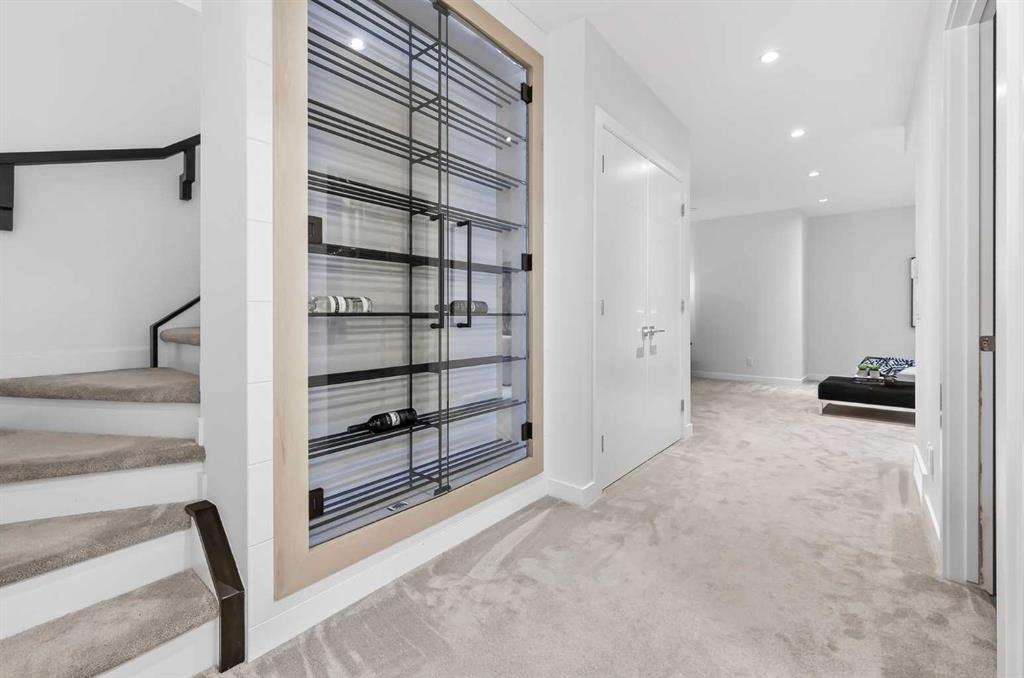 The primary suite is a private retreat, featuring 10-foot ceilings, large windows, and a statement chandelier. A generous walk-in closet provides exceptional storage, while the spa-inspired 5-piece ensuite offers quartz countertops, Calacatta-style tile, a fully tiled glass rain shower, and a luxurious soaker tub. The fully developed basement is designed for comfort and entertaining, complete with in-floor heating and plush carpeting. A large recreation and theatre area is complemented by a built-in wet bar with quartz countertops, custom cabinetry, and a bar fridge. A custom wine feature with integrated seating adds a unique touch. This level also includes a spacious guest bedroom with a walk-in closet and a modern 3-piece bathroom with a floating quartz vanity and fully tiled glass shower. The double detached garage is fully finished with built-in storage and a durable polyaspartic decorative chip floor system. Priced to sell!