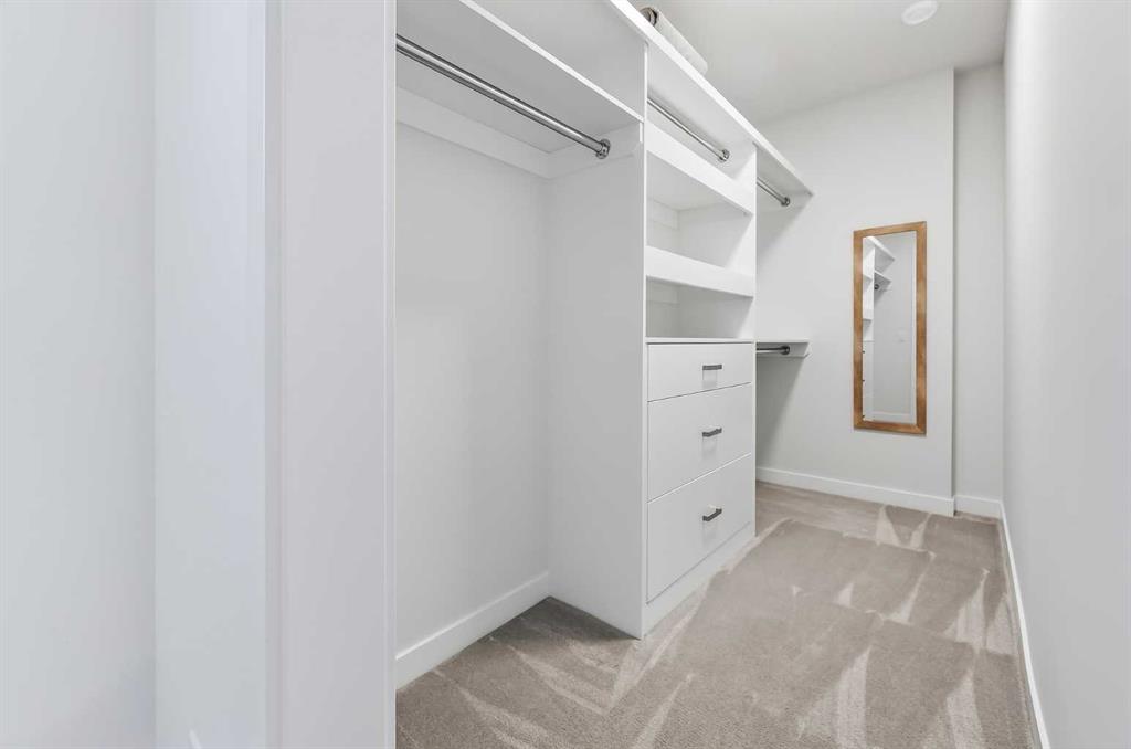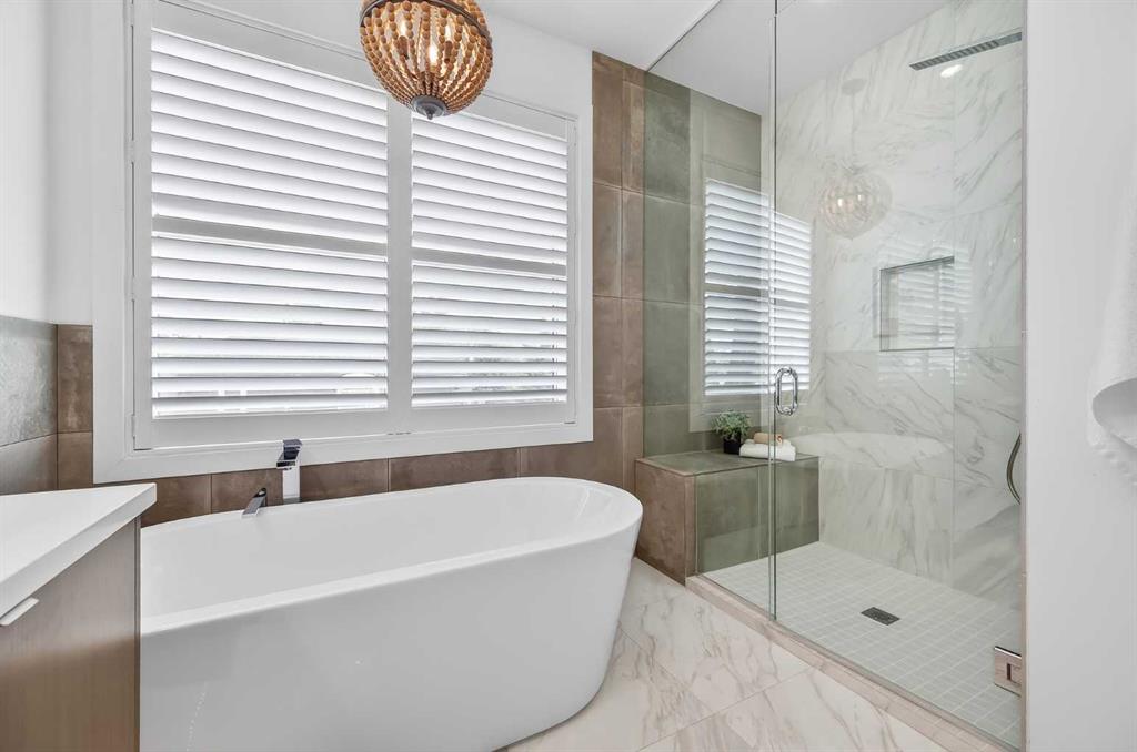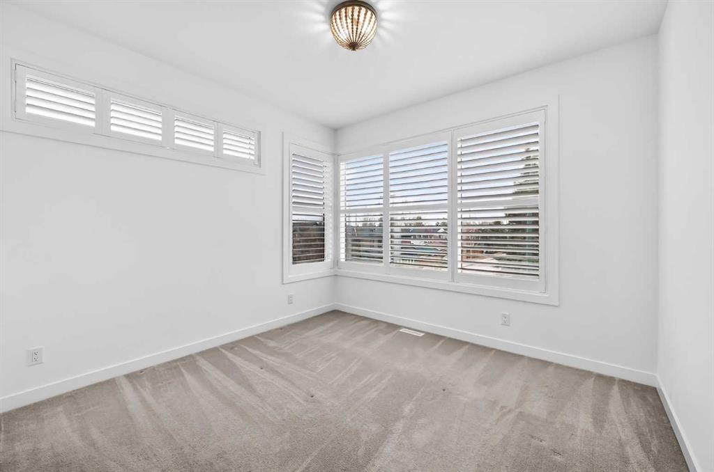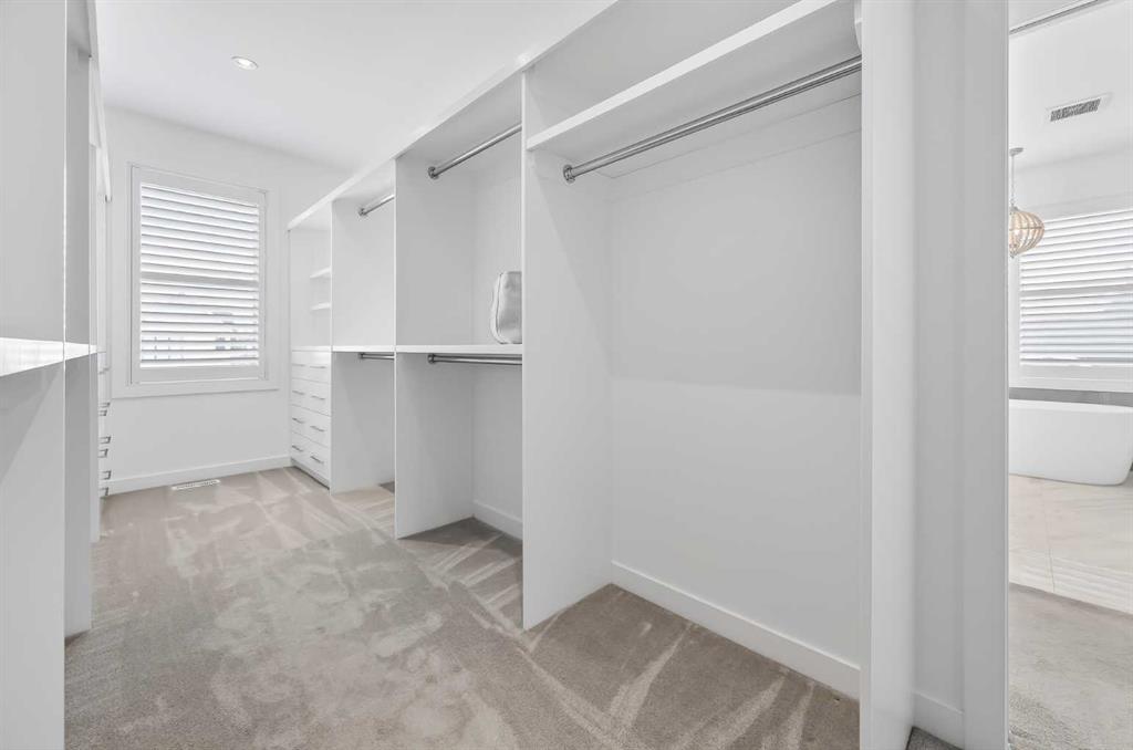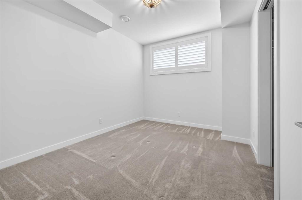 The primary suite is a private retreat, featuring 10-foot ceilings, large windows, and a statement chandelier. A generous walk-in closet provides exceptional storage, while the spa-inspired 5-piece ensuite offers quartz countertops, Calacatta-style tile, a fully tiled glass rain shower, and a luxurious soaker tub. The fully developed basement is designed for comfort and entertaining, complete with in-floor heating and plush carpeting. A large recreation and theatre area is complemented by a built-in wet bar with quartz countertops, custom cabinetry, and a bar fridge. A custom wine feature with integrated seating adds a unique touch. This level also includes a spacious guest bedroom with a walk-in closet and a modern 3-piece bathroom with a floating quartz vanity and fully tiled glass shower. The double detached garage is fully finished with built-in storage and a durable polyaspartic decorative chip floor system. Priced to sell!