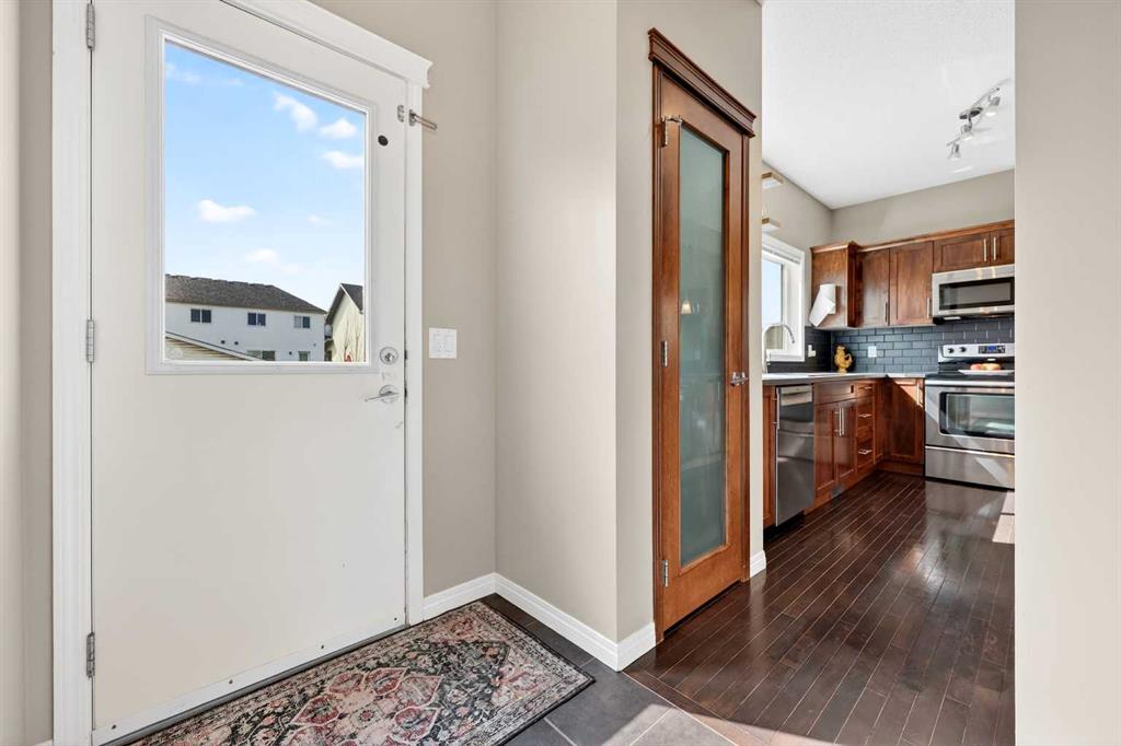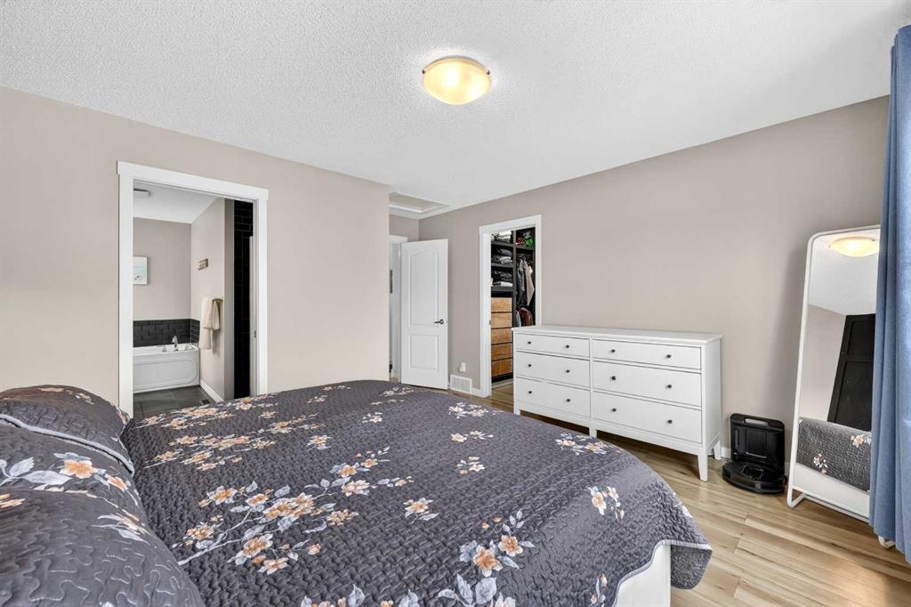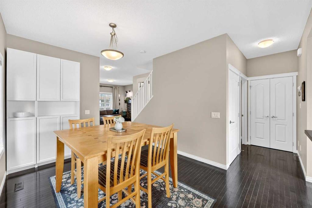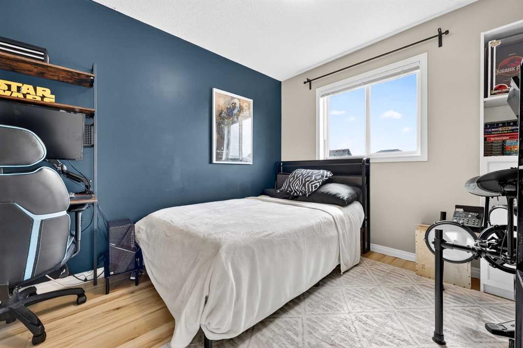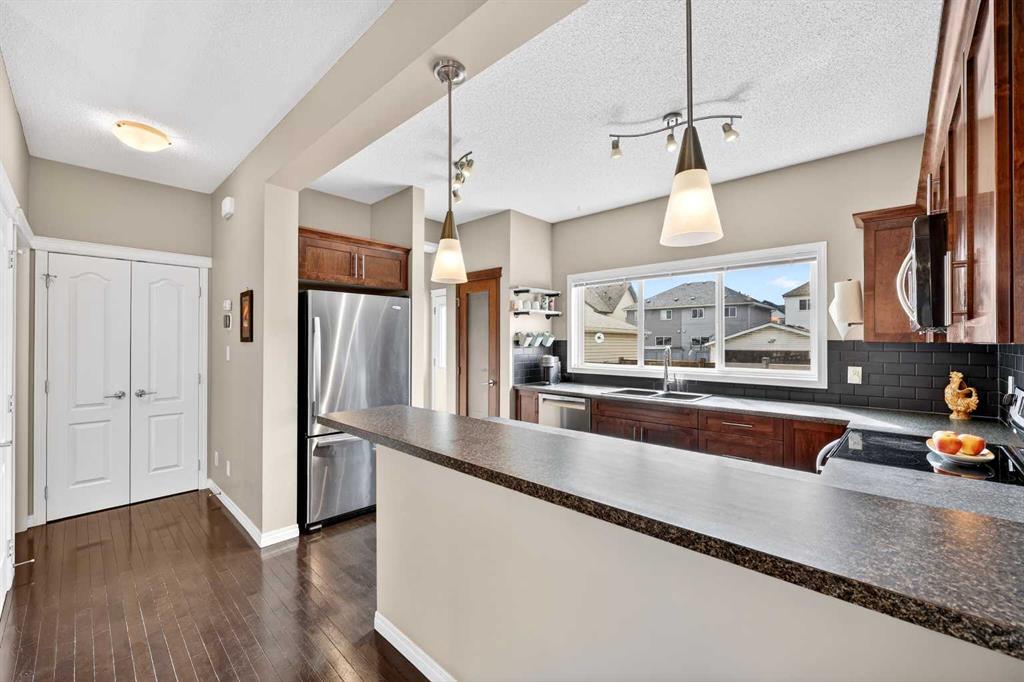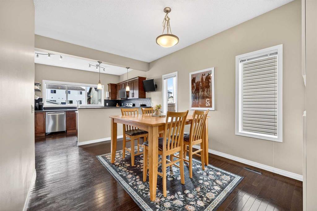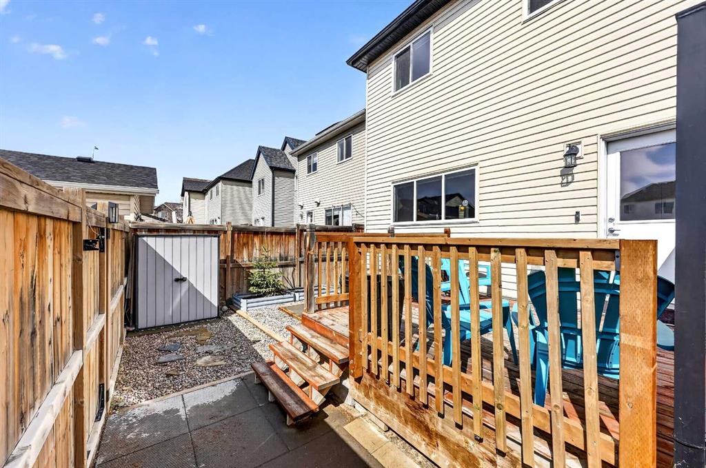 Welcome to exceptional value in Copperfield. This beautifully maintained single-family home offers outstanding curb appeal, highlighted by a charming covered front porch. Step inside to a bright, open-concept main floor filled with natural light and finished with gleaming hardwood throughout. The inviting living room features a cozy gas fireplace and flows seamlessly into the dining area and kitchen—perfect for both everyday living and entertaining. The kitchen overlooks the sunny, south-facing backyard, complete with a deck and hot tub, creating an ideal outdoor retreat. Stainless steel appliances and a spacious pantry add both style and functionality. The main floor also includes a dedicated office space—perfect for working from home—as well as a convenient two-piece powder room. Upstairs, the spacious primary suite comfortably accommodates a king-sized bed and features a walk-in closet and a well-appointed ensuite with dual vanities, a soaker tub, and a separate shower. Two additional bedrooms, a full bathroom, and the convenience of an upper-level laundry room complete the upper floor. The home also features central air conditioning. The unfinished basement offers excellent potential, with a rough-in for a future bathroom—ready for your personal touch. Ideally located just minutes from Deerfoot Trail and Stoney Trail, and close to shopping, dining, and amenities. A rear parking pad provides space for a future garage. Call your favourite realtor today to schedule a showing.
