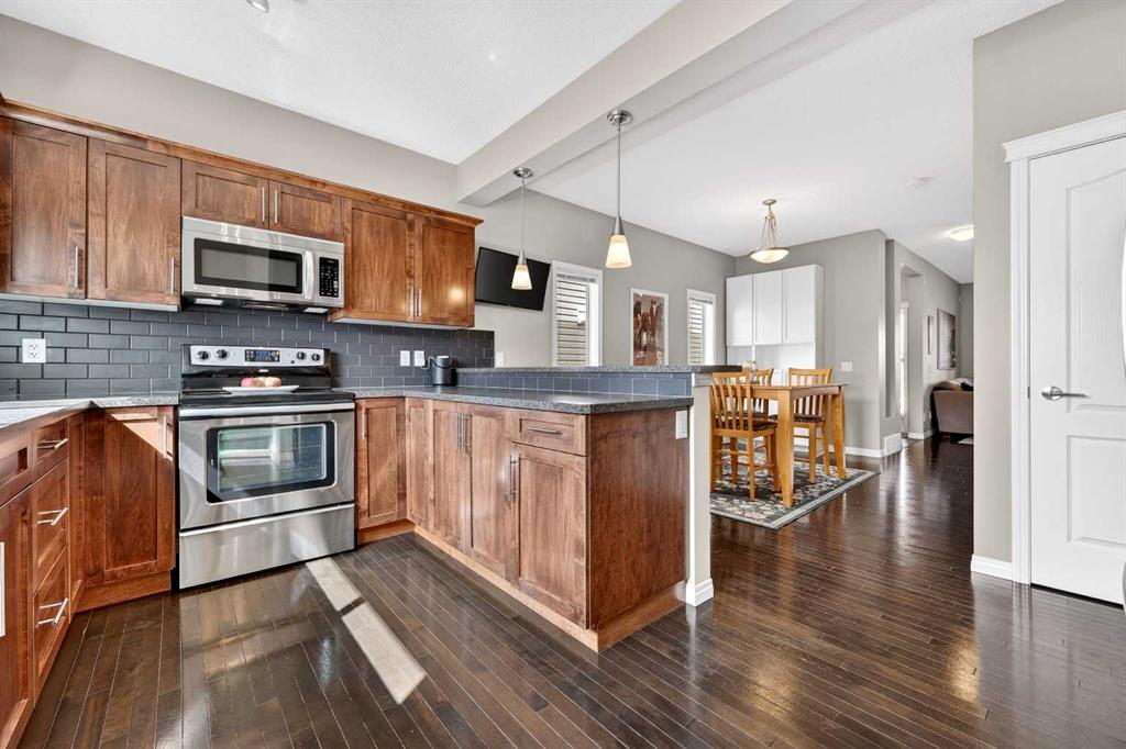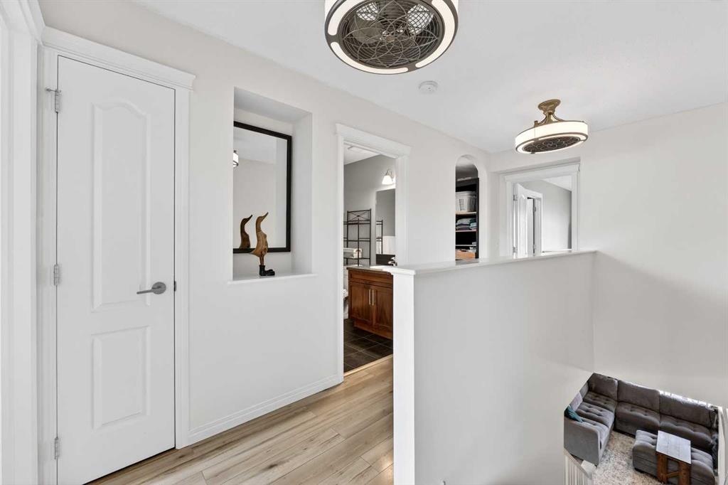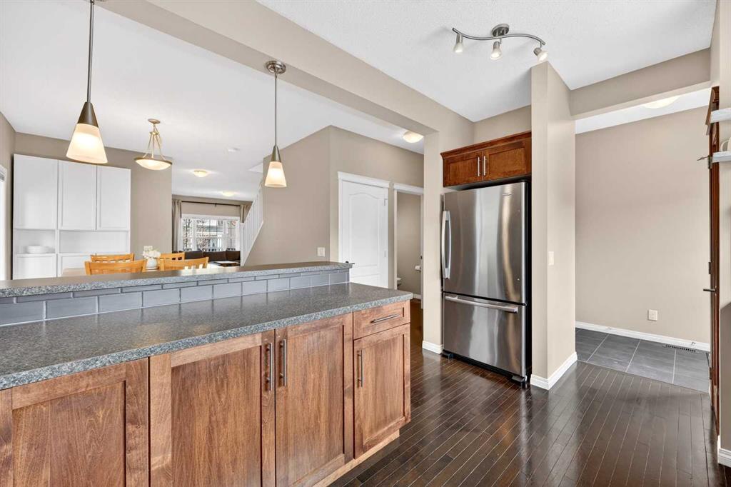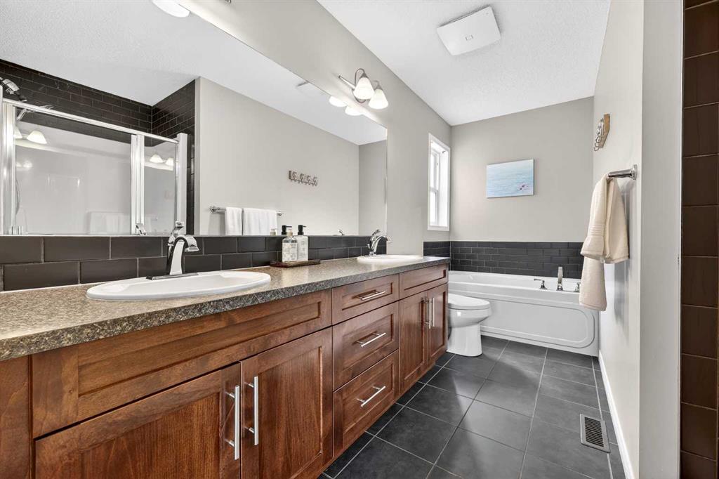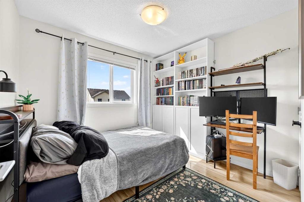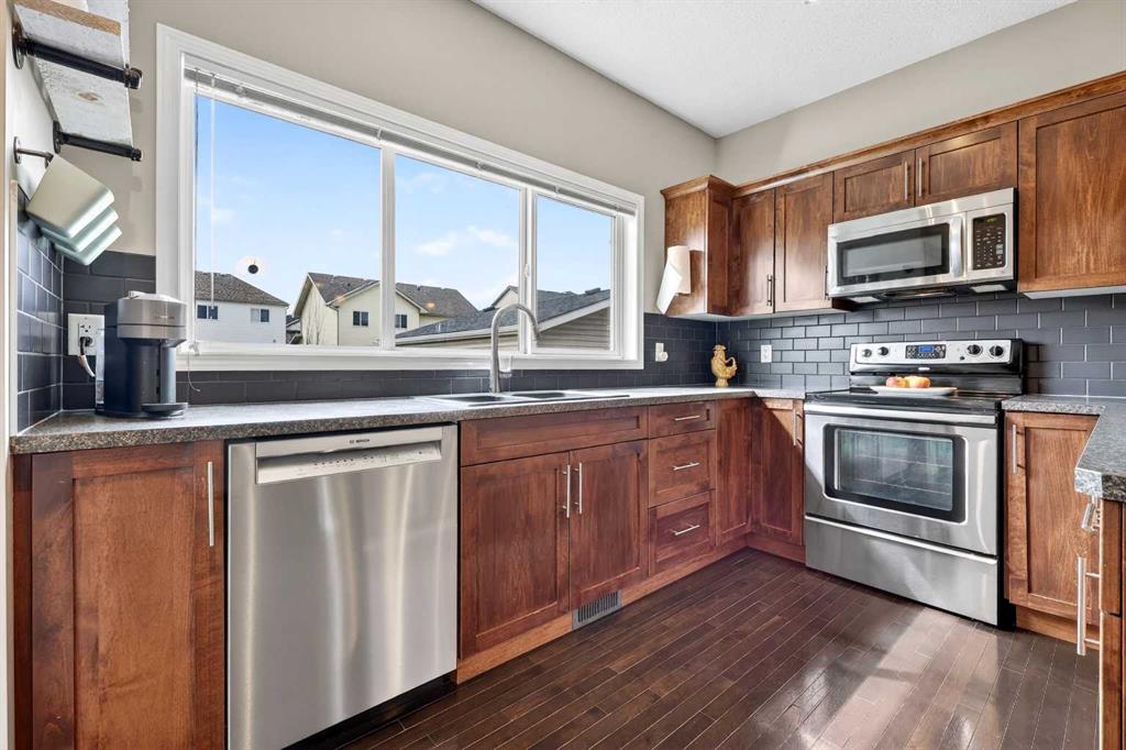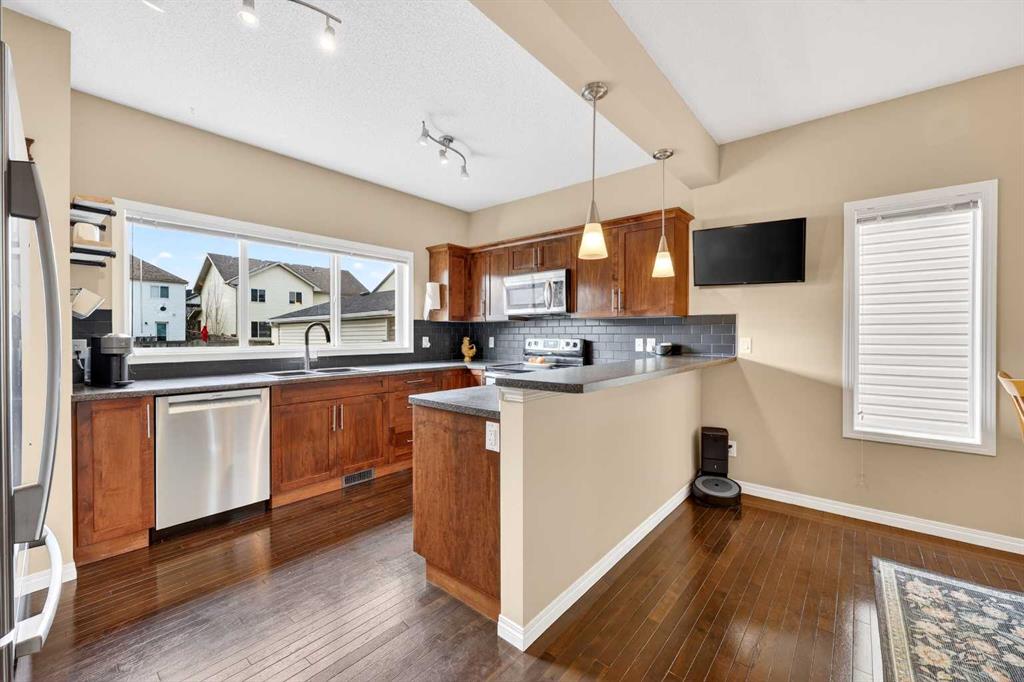 Welcome to exceptional value in Copperfield. This beautifully maintained single-family home offers outstanding curb appeal, highlighted by a charming covered front porch. Step inside to a bright, open-concept main floor filled with natural light and finished with gleaming hardwood throughout. The inviting living room features a cozy gas fireplace and flows seamlessly into the dining area and kitchen—perfect for both everyday living and entertaining. The kitchen overlooks the sunny, south-facing backyard, complete with a deck and hot tub, creating an ideal outdoor retreat. Stainless steel appliances and a spacious pantry add both style and functionality. The main floor also includes a dedicated office space—perfect for working from home—as well as a convenient two-piece powder room. Upstairs, the spacious primary suite comfortably accommodates a king-sized bed and features a walk-in closet and a well-appointed ensuite with dual vanities, a soaker tub, and a separate shower. Two additional bedrooms, a full bathroom, and the convenience of an upper-level laundry room complete the upper floor. The home also features central air conditioning. The unfinished basement offers excellent potential, with a rough-in for a future bathroom—ready for your personal touch. Ideally located just minutes from Deerfoot Trail and Stoney Trail, and close to shopping, dining, and amenities. A rear parking pad provides space for a future garage. Call your favourite realtor today to schedule a showing.