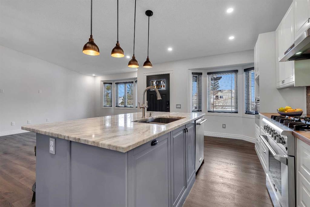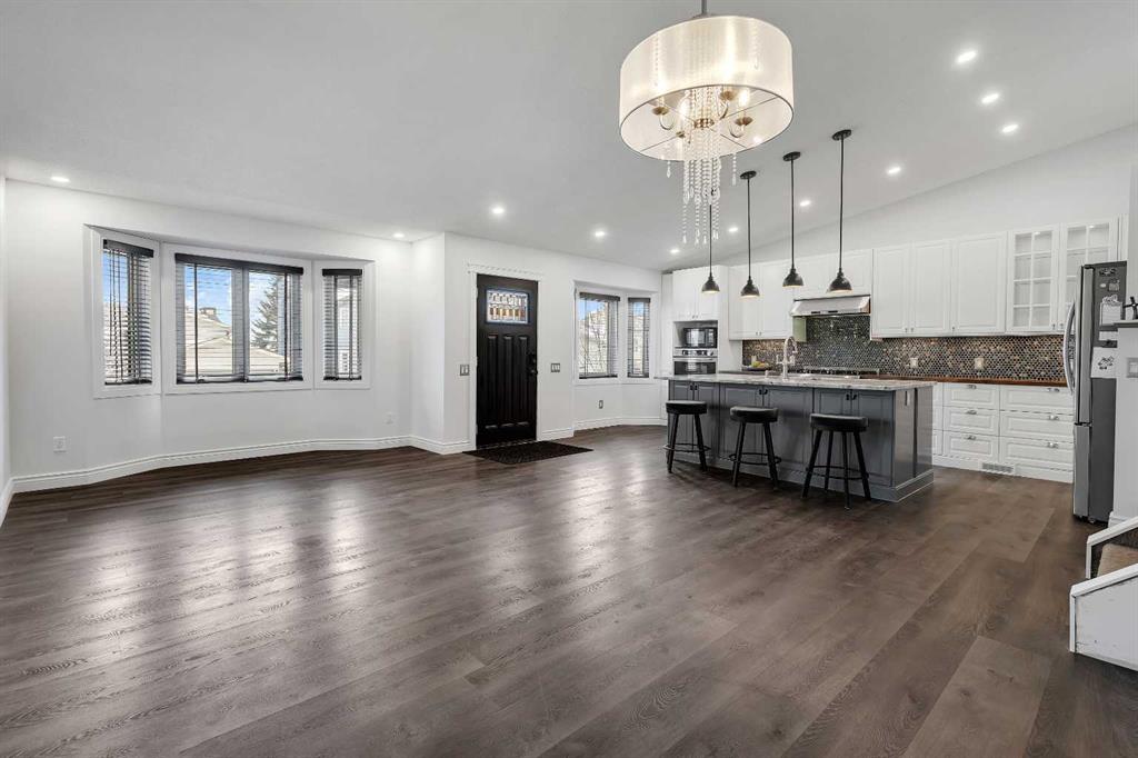 Fantastic opportunity to own a detached air conditioned home in the heart of MacEwan, featuring a sunny west-facing backyard and located kitty-corner to a large green space and playground just across the back alley. Renovations have been started, now it’s your chance to complete the dream and add your own finishing touches. The updates begin the moment you arrive, with an inviting multi-level front deck and beautifully added side yard space enhancing the home’s curb appeal. Step inside to soaring vaulted ceilings and a stunning, fully upgraded kitchen that spans the length of the room. No detail has been overlooked: gleaming white cabinetry with tiled backsplash, a double-depth gray accent island with extra storage and seating, butcher block countertops complemented by stone on the island, and thoughtful extras like a garbage/recycling drawer, under counter lighting, pot filler, soap dispenser, and lazy Susan. The impressive six-piece stainless steel appliance package includes a 6-burner gas stove with oven, separate electric wall oven, microwave, refrigerator with water and ice dispenser, built-in dishwasher, and hood fan. Rich laminate flooring flows through the open dining and living area, adding warmth and drama to the space. Upstairs, the primary bedroom offers a private 4-piece ensuite and an organized closet system. Two additional bedrooms and another 4-piece bath complete this level. The third walk-out level features a spacious family room with a cozy wood-burning fireplace and an additional 3-piece bath, perfect for entertaining or relaxing. The fourth level provides a versatile recreation, hobby, or office space, along with a sizeable laundry room (check out the washing machine with its separate delicate wash drawer). Thanks to the home’s unique design, you’ll also appreciate the expansive crawl space storage. Outside, enjoy an oversized double detached garage plus a separately gated RV parking stall, while still maintaining generous yard space. With easy access to the green space and playground just across the alley, this property combines location, potential, and lifestyle. A rare opportunity to finish a beautifully started renovation and make it truly your own.