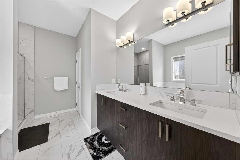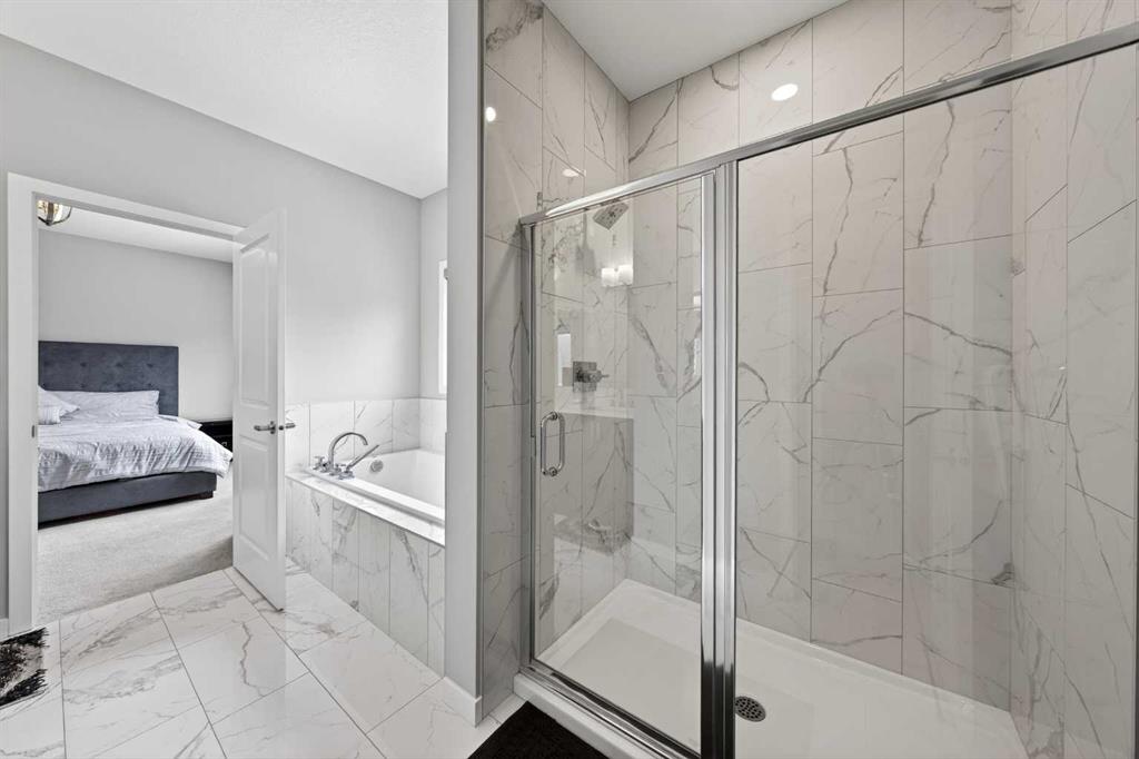 The upper level features a well-proportioned Bonus room, ideal for creating your own relaxing family space. This level offers 4 bedrooms, including two with private ensuites and walk-in closets. The Primary bedroom provides a comfortable retreat with a spa-inspired 5-piece ensuite featuring a double vanity with quartz countertops, a soaker tub, and a tiled standing shower. Another bedroom, filled with natural light from three west-facing windows, also includes its own 4-piece ensuite and walk-in closet. Two additional well-sized bedrooms, a 4-piece bathroom, and a convenient upper-level Laundry room complete this floor.
