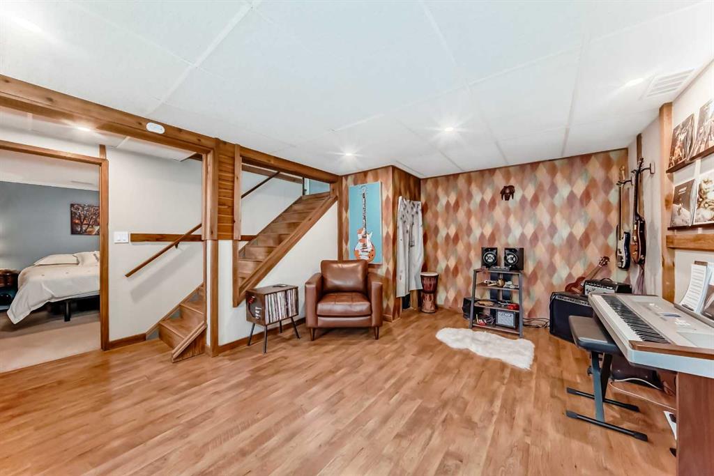 The backyard is designed for enjoying Calgary’s summer months. Step out onto the large deck and relax in your private hot tub, creating the perfect space for gatherings with friends and family. Pebbled aggregate walkways, lush grass, garden areas, and mature trees surrounding the yard provide privacy and a peaceful atmosphere. The raised yard and retaining wall add character while creating a secluded outdoor retreat.