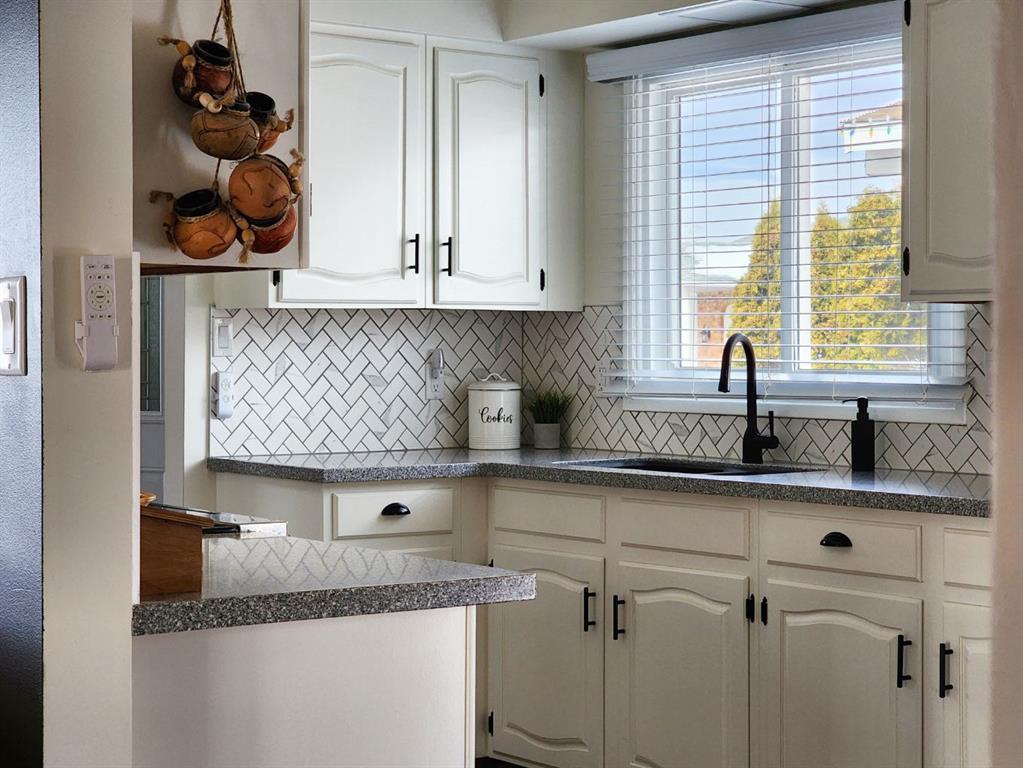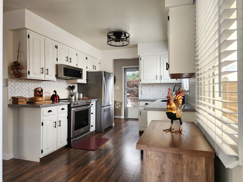 Off the dining space, patio doors open to a covered, enclosed, south-facing sunroom—perfect for relaxing and enjoying natural light year-round. The adjacent kitchen has been beautifully renovated with upgraded appliances, modern fixtures, a stylish backsplash, and durable Corian countertops. The cabinetry has been professionally refinished, blending both elegance and practicality.