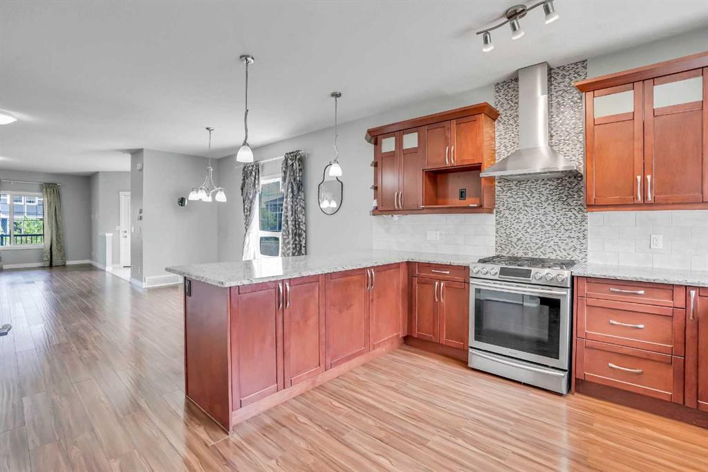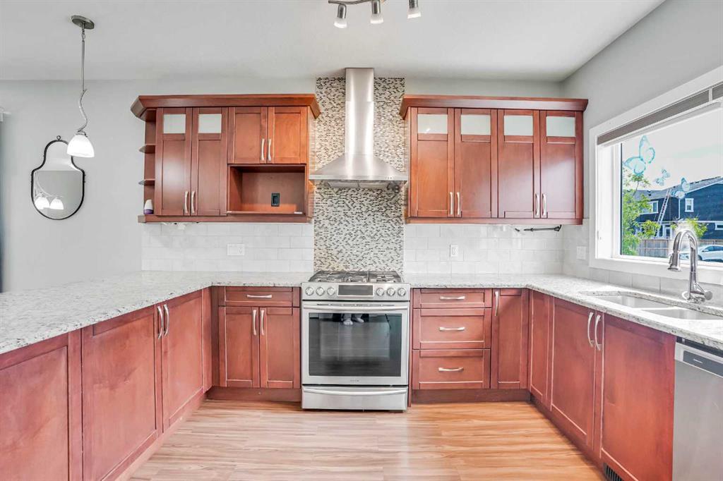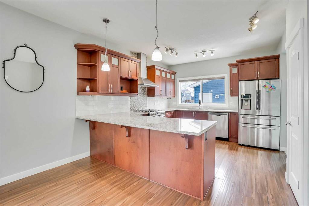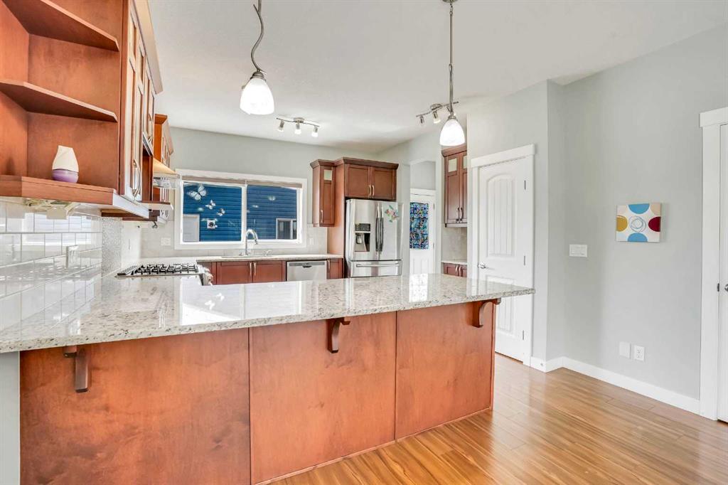 LOCATION!!! LOCATION!!!! Location!!! Welcome to Meticulously kept 2015 Built EAST FACING 1,865 Sq Ft SINGLE FAMILY DETACHED HOME including OVERSIZED DOUBLE Detached Garage with Unfinished Basement in a most Desirable community of REDSTONE On A Corner Lot. The CURRENT ORIGINAL OWNERS had upgraded the home extensively like Laminate/Tile Flooring, 9’ Main ceiling, Stainless Steel Appliances, Maple Cabinets, Granite Countertops everywhere, Railing at Stairs, Central Air Conditioning, Front Porch, & Rear Deck with Concrete Patio. MAIN FLOOR invites you with an OPEN CONCEPT FLOOR PLAN having decent front foyer followed by Spacious Living Room, MODERN STYLE UPGRADED Kitchen with Large Dining space to entertain large family, Pantry room and 3pc FULL WASHROOM finishes the level. The KITCHEN IS HIGHLY UPDATED WITH FULL HEIGHT CABINETS, CHIMNEY HOOD FAN, GAS STOVE, BUILT IN MICROWAVE, elegant backsplash and large bright window. The UPSTAIRS you have a Large Master Bedroom with 3pc Ensuite & walk in closet, Other 3 Good size Bedrooms with closets, Separate Laundry Room. The HUGE UNFINISHED BASEMENT with Egress Windows is waiting for your creative ideas. THE WEST FACING BACKYARD with Deck and Concrete Patio facilitates the low maintenance landscaping makes it ideal for summer gatherings. Plus Having Sprinklers for Grass. OVERSIZED DOUBLE DETACHED GARAGE with a paved back alley makes it ideal for your convenient lifestyle. The lovely Home is Located on Quiet Street, while Few minutes walk/drive to TRANSIT, PARK, PLAYGROUND, Shopping Plaza -Sanja Punjab & Chalo Fresco & few Mins drive to YYC, major highways, Cross iron Mall. Ideal for Living or Investment purposes to increase your rental portfolio. Don’t Miss 3D Tour. Must Buy. Call Now your favourite realtor to schedule a viewing.