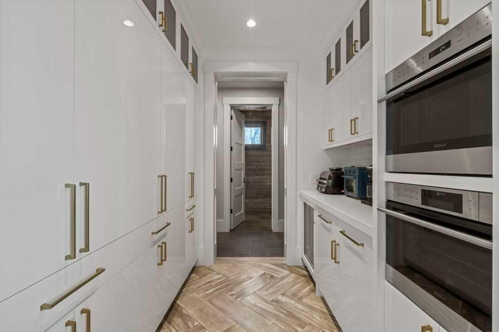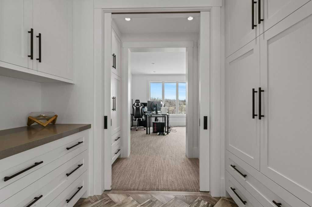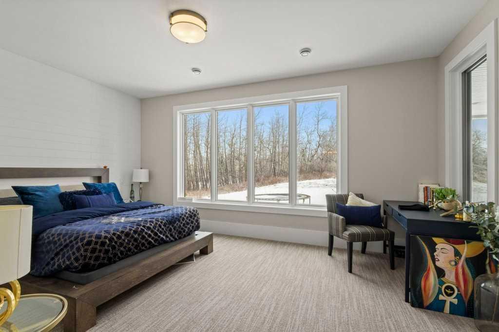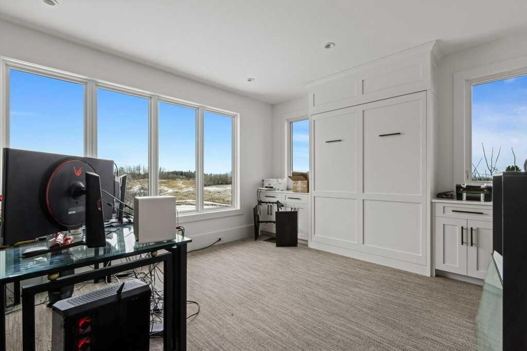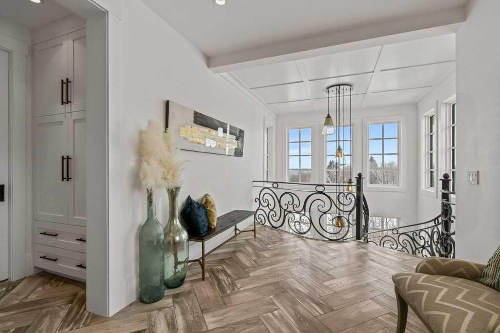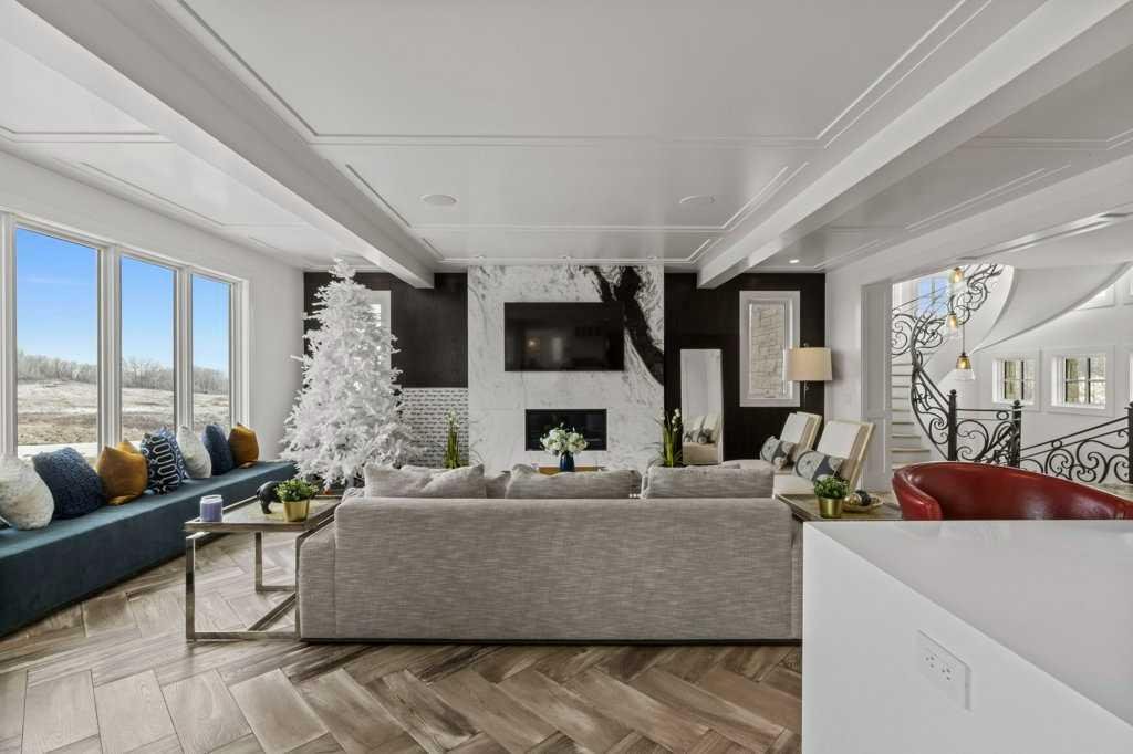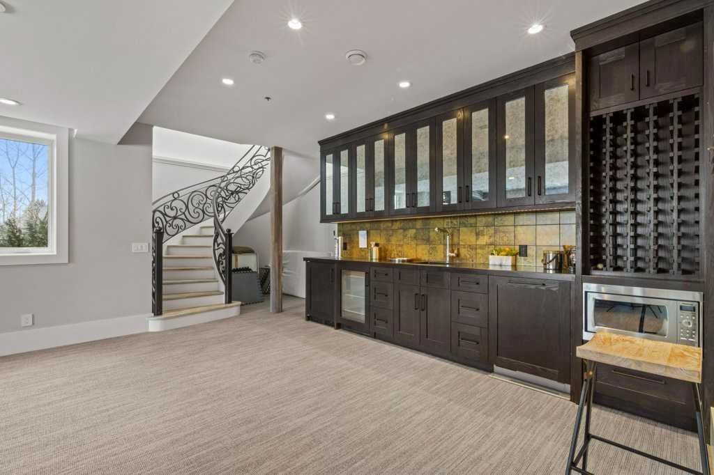 Welcome to The Vale, an architectural masterpiece by the renowned McKinley Masters. This one-owner, former show home represents a pinnacle of elegance, privacy, and superior craftsmanship. Situated within the prestigious Silverhorn community, the estate offers a perfect harmony of high-tech modern amenities and the tranquil beauty of Bearspaw’s rolling hills. From the moment you approach the elegant board-and-batten exterior—highlighted by full-bed sandstone, triple-glazed windows, and cedar garage doors—it is clear that every detail has been meticulously curated for the discerning homeowner. The grand entrance sets a tone of opulence, featuring a handcrafted front door with a forged iron canopy that opens into a foyer graced by a custom solid oak armoire. You are immediately captivated by the home’s crown jewel: an award-winning circular staircase with bespoke iron railings. The main floor flows effortlessly through an open-concept layout, where custom herringbone wood floors lead you to a Great Room anchored by a marble feature wall and a built-in gas fireplace. Large windows throughout the level ensure that the breathtaking views of the surrounding treed areas and hills are always the centerpiece of your living space. For the culinary enthusiast, the kitchen is a dream come true. It artfully blends traditional and modern finishes, featuring an oversized marble waterfall island and a secondary prep station that subtly defines the space. ?This kitchen is designed for both high-end catering and intimate family breakfasts. The adjacent formal dining room provides a sophisticated atmosphere for hosting, while the nearby powder room exudes warmth with its custom floating vanity and wood-paneled walls. The upper level is a sanctuary of comfort, characterized by barrel ceilings, accent lighting, and custom iron chandeliers. The master retreat is a true “spa-at-home” experience, featuring floor-to-ceiling windows, a cozy sitting area, and a pop-up TV. The ensuite melts away the stress of the day with heated floors and a cedar-clad walk-in closet. This level also includes ?t?hree additional ?bedrooms? with walk in closets and a family sized laundry room. Steps away the oversized main bathroom is a standout feature in itself, boasting double floating vanities and an impressive private custom shower area. The walk-out basement is a bright and cheerful entertainment hub, complete with a custom bar? and a media area with barn board detailing. Even the functional spaces of this home are extraordinary; the mechanical room is a masterpiece of engineering, connected by a private staircase to an oversized garage. This garage is unlike any other, featuring epoxy-coated heated floors, ample built-in cabinetry, and designer accents. Life in Silverhorn offers a unique blend of nature and technology. With 50% of the surrounding landscape protected, you can enjoy the serenity of untouched beauty just minutes from Calgary.