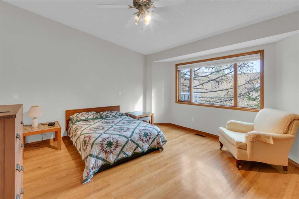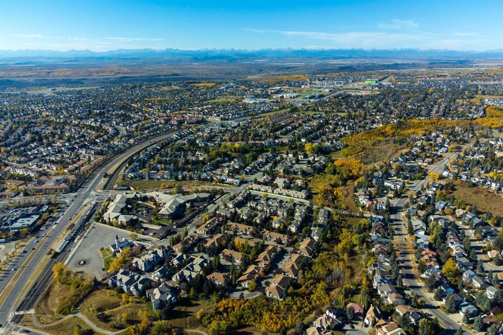 Over 2800 sq.ft. of developed living space in this exceptionally private, vaulted, walkout, villa style home in an amazing location! You will love the light airy feel of vaulted ceilings in the spacious main floor living, dining, kitchen, den/office, and bedroom areas. This surprisingly bright end unit walkout bungalow has sunlight spilling in all day from skylights plus large windows on 3 sides – south, west and east. Freshly painted in neutral designer colours throughout (Oct 2025) with vinyl plank flooring updates accenting hardwood floors in large functional living area with gas fireplace, dining and den areas. Enjoy sunrise coffees and cool evenings on the peaceful secluded and extended deck surrounded by birdsong in mature flowering trees. A big main level den or sitting room connected to a fresh white kitchen with a south facing box window which adds light to an already bright space. Generous walkout level family room with oversize windows and sliding doors to a private patio. Also features a large bedroom with adjacent full bath, plus 2 flex rooms and loads of storage. New HE furnace & HW tank, 2019. (NOTE: All the “Poly B” pipes have been replaced). Super convenient location – imagine walking literally just 1 block to Sunterra West Market Square, the L.R.T., coffee shops, pubs, and restaurants. Also close to natural ravine walking paths, dog parks & bike paths. Easy access to major commuting routes including Sarcee trail and the SW Ring Road. Click on 3D for interactive floorplans. NOTE This the end unit of a triplex. Just move in, relax, and enjoy your easy care, lock and leave lifestyle!