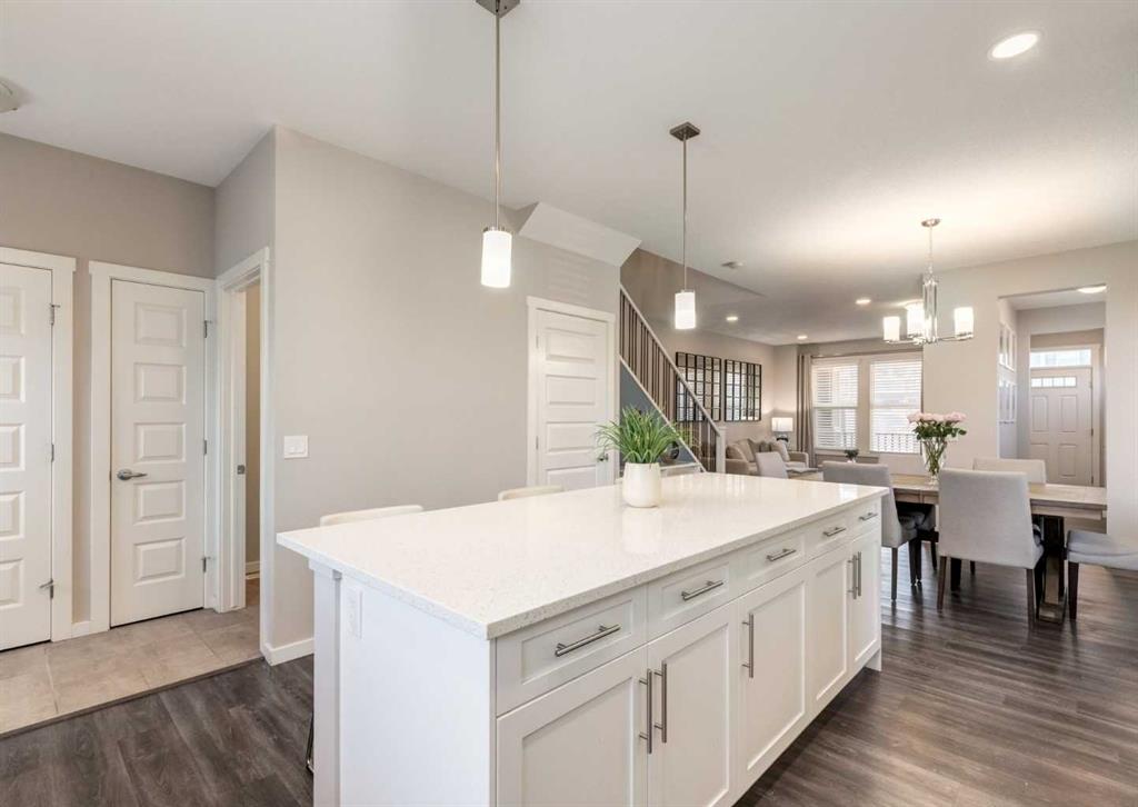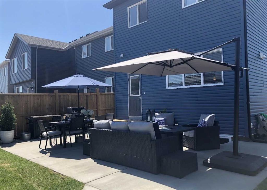 Welcome to this beautifully maintained 1,700 sq ft two-storey home offering 3 bedrooms and 2 ½ bathrooms, ideally situated on a large pie-shaped lot in the family-friendly community of Legacy. The open-concept main floor is thoughtfully designed for everyday living and entertaining, featuring a chef-inspired kitchen with a large center island topped with stone countertops, seating for several bar stools, stainless steel appliances, 42″ upper cabinets, and generous counter space, all flowing seamlessly into a spacious dining area that easily accommodates a full-size table for hosting family and friends. The inviting living room is anchored by a stylish electric fireplace, while a versatile flex space offers the perfect setup for a home office, study nook, or craft room. A convenient 2-piece powder room & large mud room completes the level. Upstairs, you’ll find three well-sized bedrooms including a primary retreat with a walk-in closet and luxurious 5-piece ensuite, along with a 4-piece main bath and upper-level laundry with stacked washer and dryer. The unfinished basement provides excellent potential for future development with two large windows and a bathroom rough-in already in place, and central air conditioning ensures maximum comfort throughout the summer months. Outside, enjoy the expansive backyard with a concrete patio, a double detached garage, and an oversized parking pad ideal for extra vehicles or RV storage, all just steps from schools, parks, pathways, and the growing selection of shops and restaurants that make this community such a sought-after place to call home.