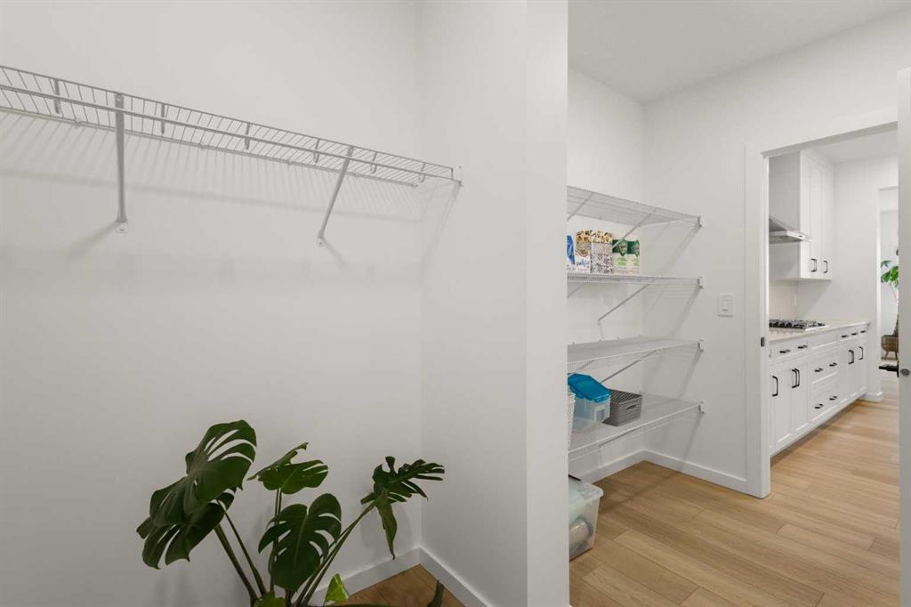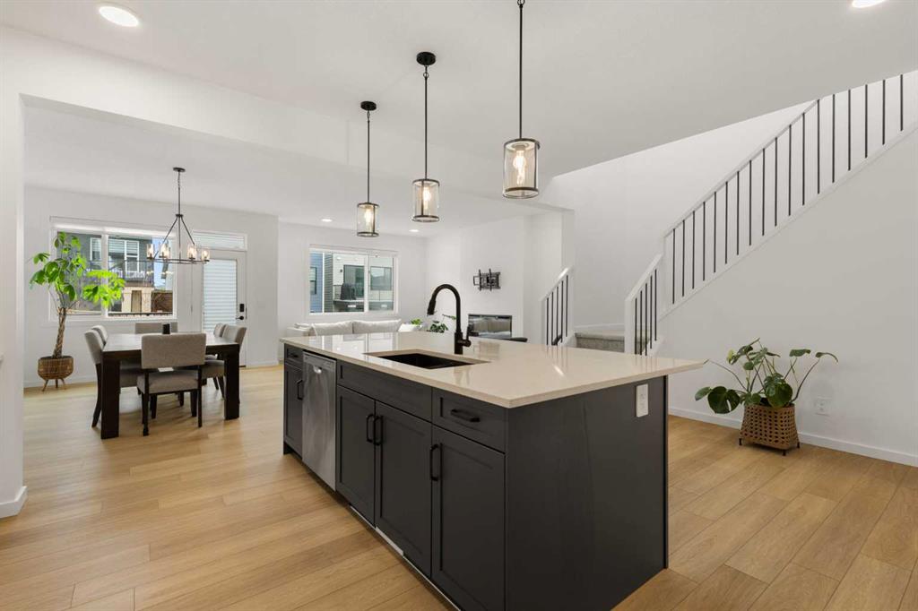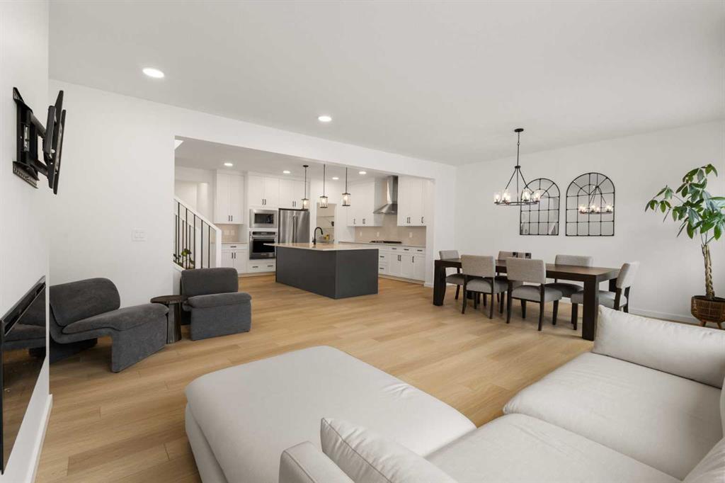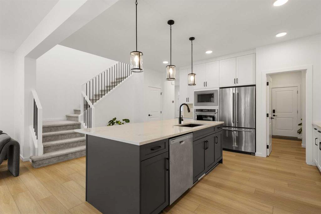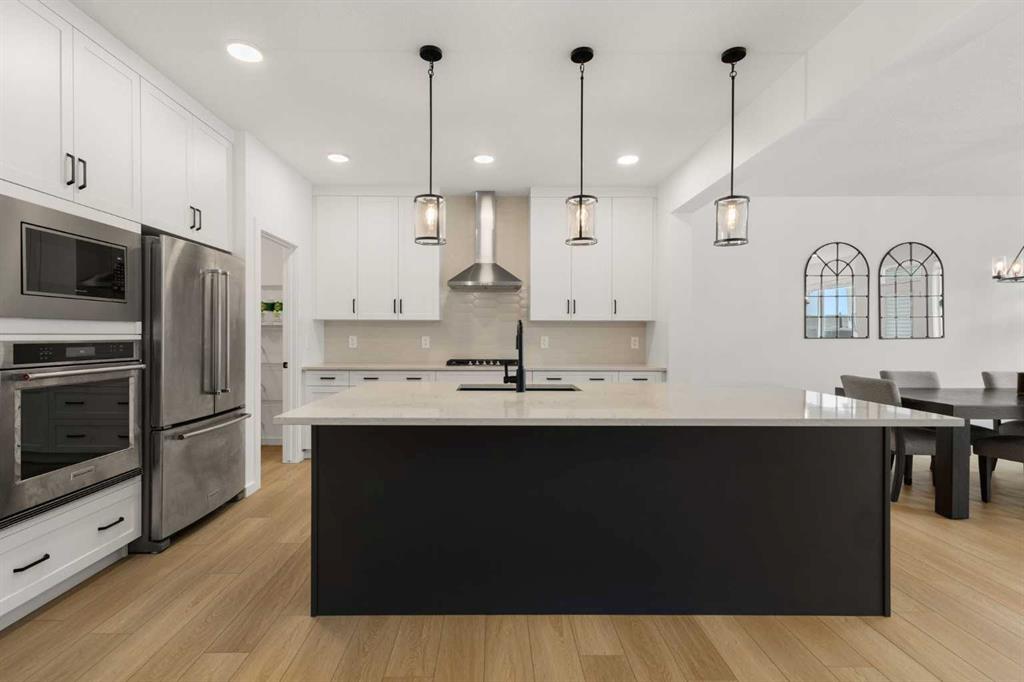 Welcome to 50 Royston Terrace NW in Rockland Park, a 2024-built home offering a clean modern design, thoughtful functionality, and a bright, open main floor layout. The kitchen is a true focal point of the home, featuring a large central island with an expansive quartz countertop, offering excellent prep space, storage, and casual seating potential. The space is further enhanced by two-tone cabinetry, stainless steel appliances, built-in microwave and wall oven, gas cooktop, chimney-style hood fan, walk-in pantry, matte black hardware, pendant lighting, and recessed ceiling lights. The white upper cabinetry keeps the kitchen bright and timeless, while the darker island and lower cabinetry add contrast and a clean contemporary feel.