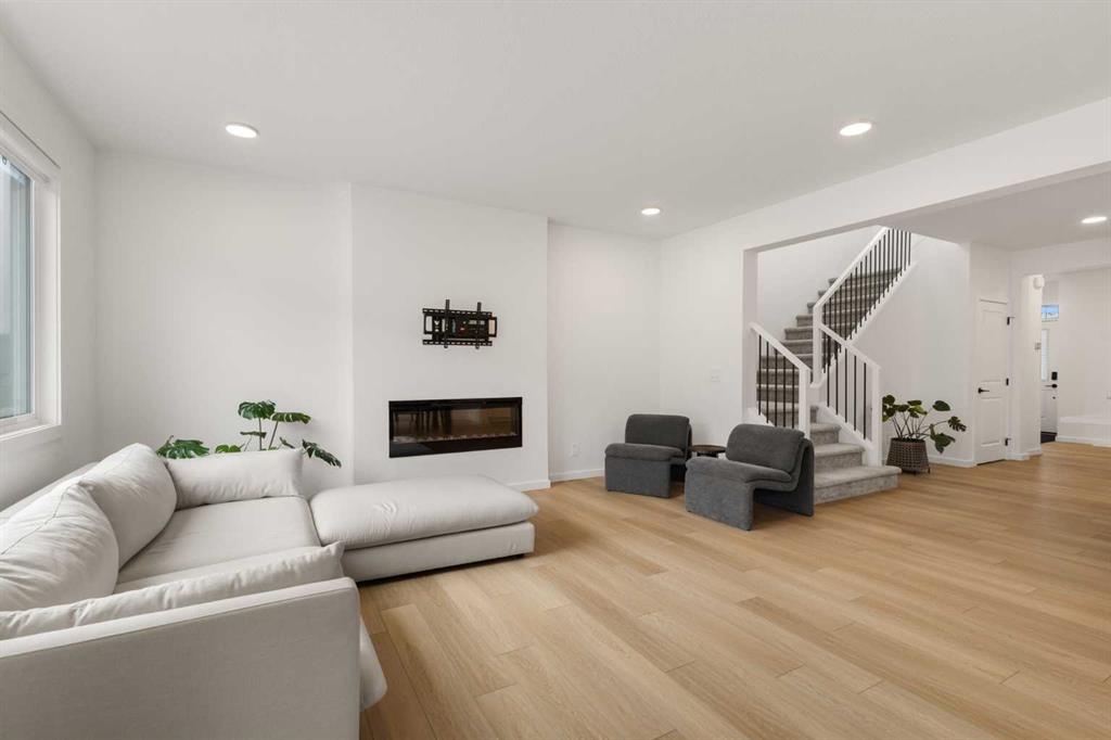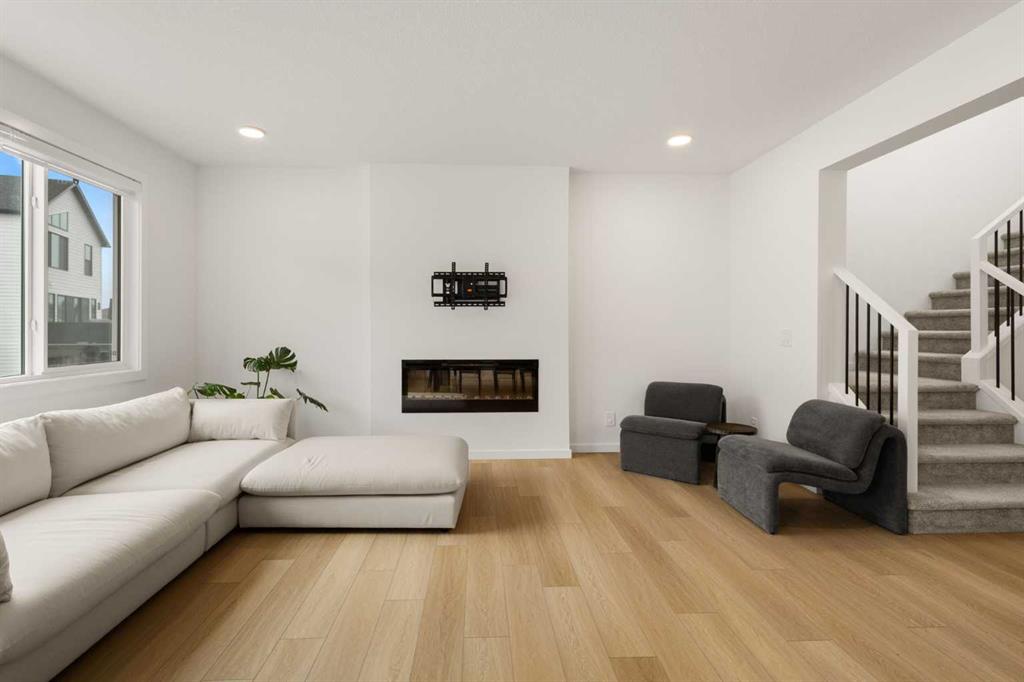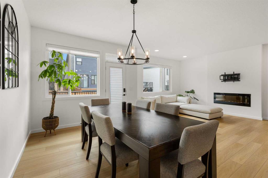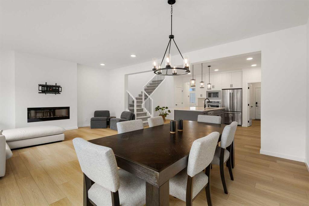 The kitchen connects naturally with the dining and living areas, creating an easy flow for daily use, family time, and entertaining. The dining area is comfortably sized for a large table, while the living room is anchored by a modern fireplace and surrounded by large windows that bring in natural light. A practical mudroom, walk-in pantry, 2-piece bath, and attached double garage support everyday convenience and help keep the main floor organized.
