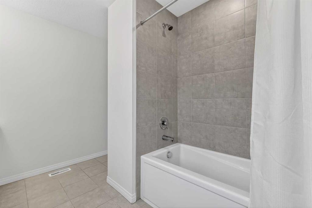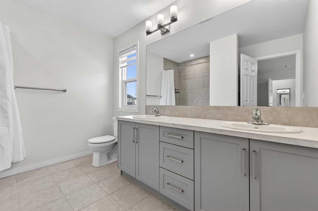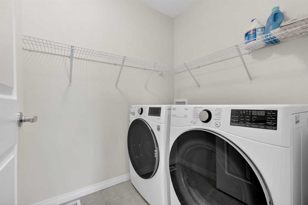 Upstairs, you’ll find a spacious laundry room with LG washer/dryer and shelving, a large linen closet, and three generous bedrooms. The primary suite includes a west-facing balcony with Duradek, a massive walk-in closet, and a 5-piece ensuite with dual vanities and a fully tiled, floor-to-ceiling tub shower combo. A second 4-piece bath also features a tiled tub shower combo and full-sized vanity.