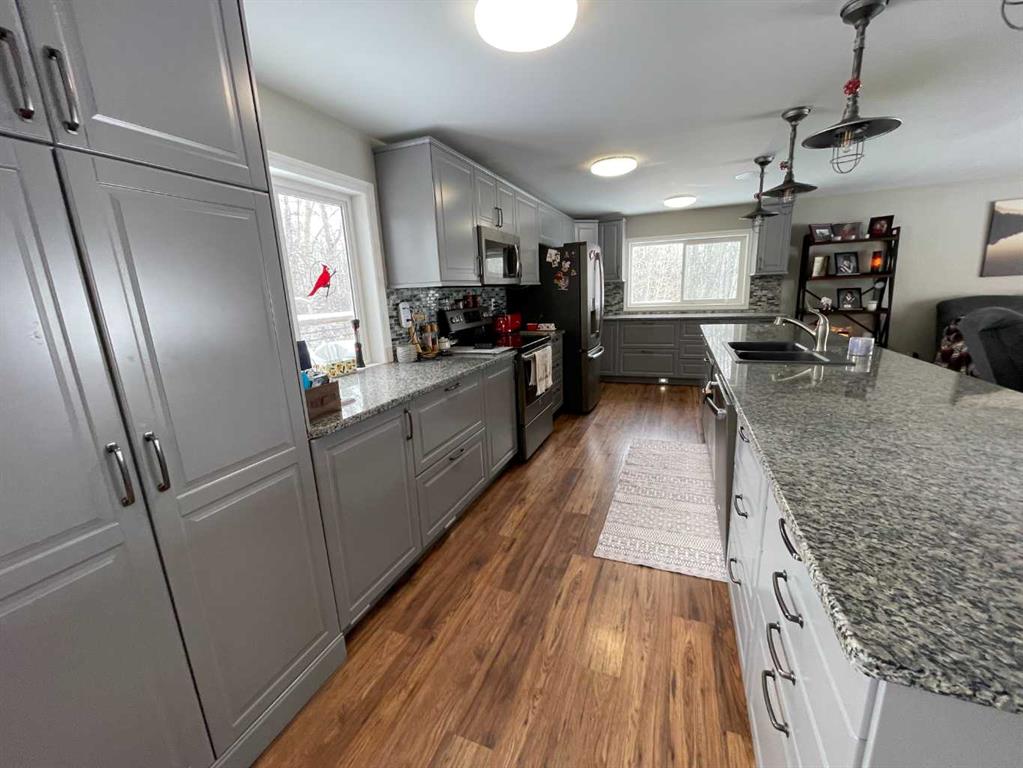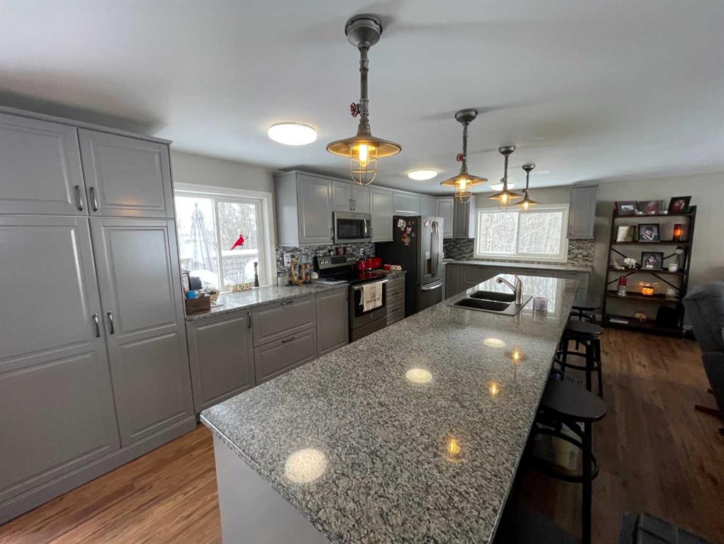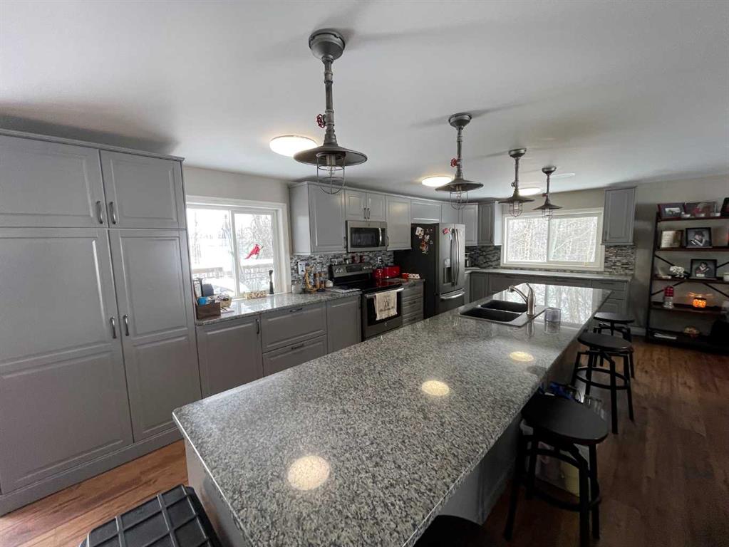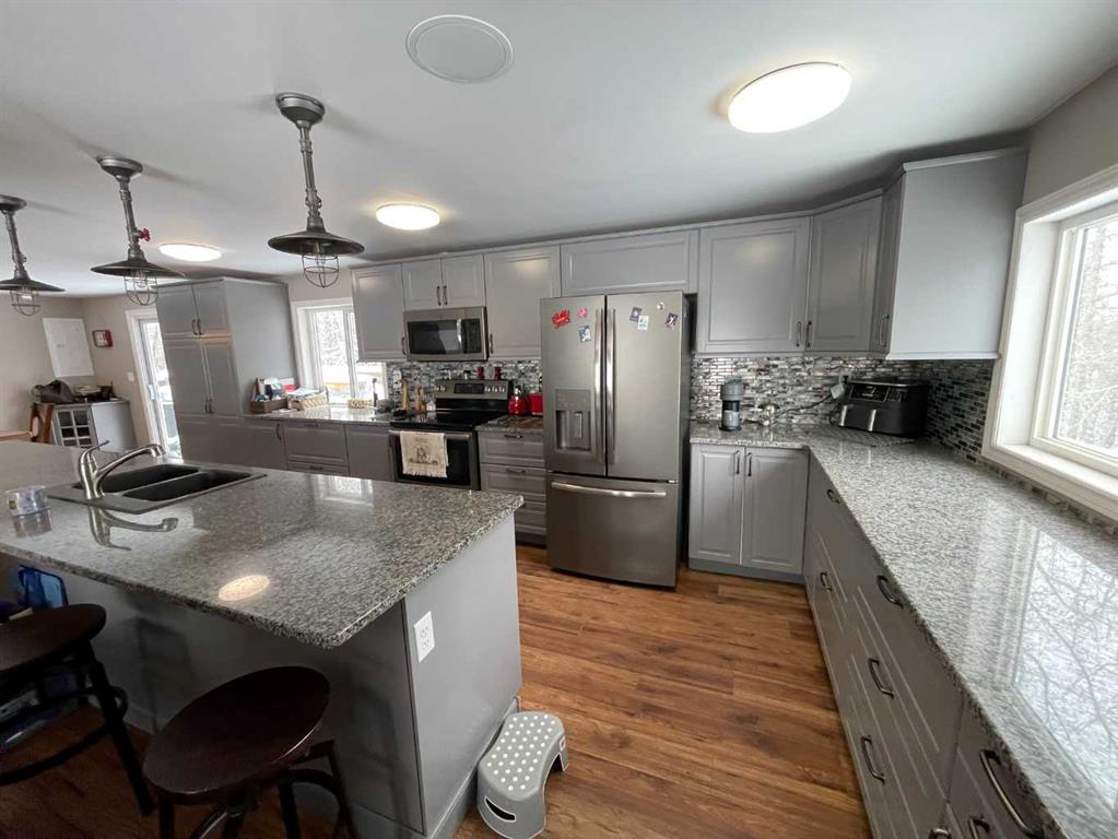 Here is a rare opportunity to purchase an acreage within the town of Didsbury that has many possibilities depending on what you are looking for. The upgraded bungalow has a spacious and open layout. The adjoining living room and kitchen are absolutely huge. The updated kitchen features stainless steel appliances, plenty of cabinets and granite countertops and features a massive island with sink and eating bar. The dining area is conveniently located next to the kitchen and has patio doors to the large rear deck. Both main floor bathrooms have been updated and the 4 piece bath boasts a 6′ jetted tub. The primary suite has a huge walk-in closet and a convenient 3 piece ensuite bath. Downstairs you’ll find a large family room with wood burning stove, a games room area, 2 more bedrooms, the laundry and a 3 piece bath. Many renovations in recent years include newer vinyl windows and upgrades to plumbing and electrical along the way as well as a newer high efficiency furnace and newer hot water tank. There are 2 wells on the property, one for the house and smaller shop and a newer one drilled in 2013 that supplies the newer shop. The septic tank and field services the house and smaller shop. The newer shop has its own septic tank. The 40 X 80 shop was built in 2013, has infloor and radiant overhead heat, a 3 piece bath, and a kitchenette. The 32 X 48 shop has overhead heat and an upgraded 2 piece bathroom. The cozy little home-office building is 15 X 19’6 and features electric heat; a nice little retreat to get some paperwork done or would make a great craft room. Great commercial and/or home based business potential! All of this on 4.5 acres of well treed land, a mountain view and a short walk to downtown Didsbury!