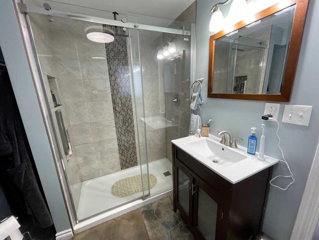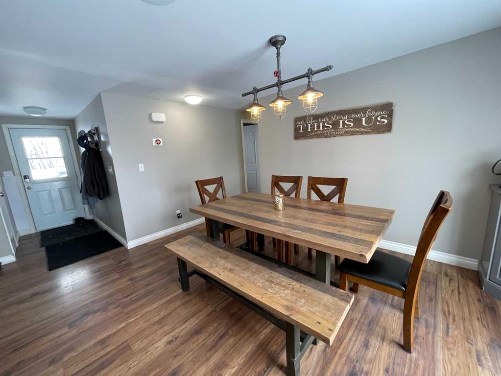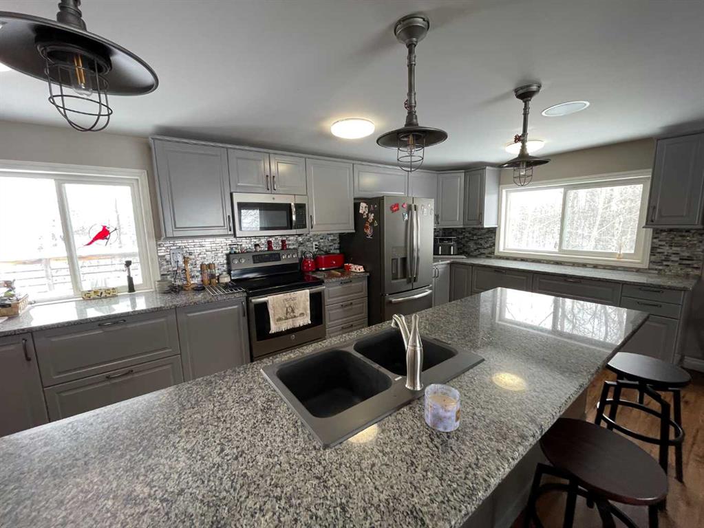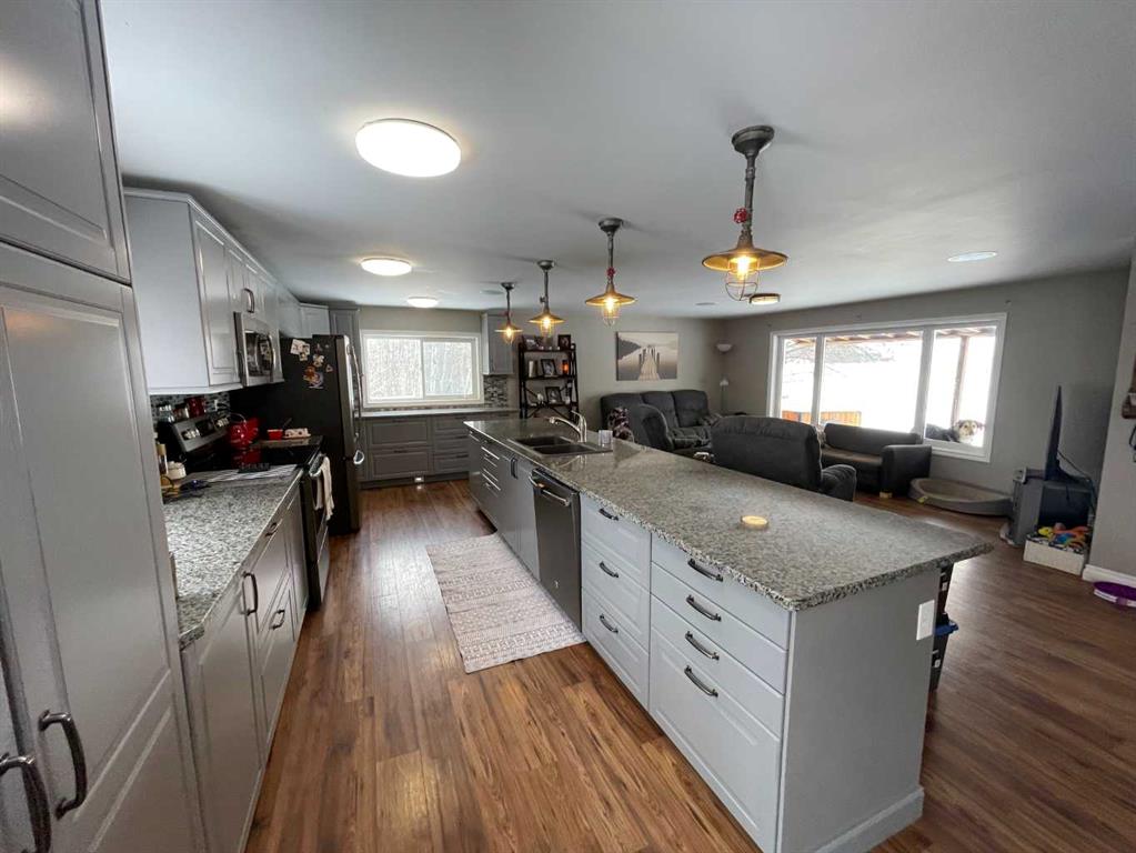 Here is a rare opportunity to purchase an acreage within the town of Didsbury that has many possibilities depending on what you are looking for. The upgraded bungalow has a spacious and open layout. The adjoining living room and kitchen are absolutely huge. The updated kitchen features stainless steel appliances, plenty of cabinets and granite countertops and features a massive island with sink and eating bar. The dining area is conveniently located next to the kitchen and has patio doors to the large rear deck. Both main floor bathrooms have been updated and the 4 piece bath boasts a 6′ jetted tub. The primary suite has a huge walk-in closet and a convenient 3 piece ensuite bath. Downstairs you’ll find a large family room with wood burning stove, a games room area, 2 more bedrooms, the laundry and a 3 piece bath. Many renovations in recent years include newer vinyl windows and upgrades to plumbing and electrical along the way as well as a newer high efficiency furnace and newer hot water tank. There are 2 wells on the property, one for the house and smaller shop and a newer one drilled in 2013 that supplies the newer shop. The septic tank and field services the house and smaller shop. The newer shop has its own septic tank. The 40 X 80 shop was built in 2013, has infloor and radiant overhead heat, a 3 piece bath, and a kitchenette. The 32 X 48 shop has overhead heat and an upgraded 2 piece bathroom. The cozy little home-office building is 15 X 19’6 and features electric heat; a nice little retreat to get some paperwork done or would make a great craft room. Great commercial and/or home based business potential! All of this on 4.5 acres of well treed land, a mountain view and a short walk to downtown Didsbury!
