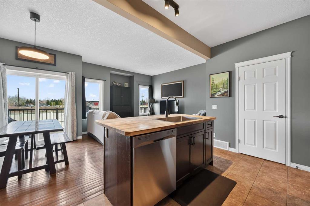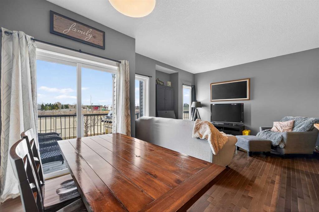 The adjacent dining and living areas are filled with natural light and flow seamlessly to the east-facing balcony, where you can enjoy peaceful views of Nose Creek Park and morning sun with added privacy and no rear neighbours. A convenient 2-piece powder room on the main level adds everyday functionality for guests.