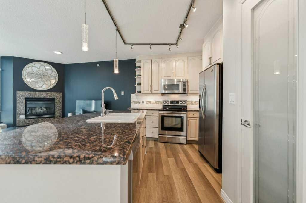 Welcome to one of Calgary’s finest and most prestigious luxury buildings the Point on the Bow. Immaculate perfection with this bright and upgraded condominium home with entertaining open floor plan and large south facing floor-to-ceiling windows providing an abundance of natural light. This meticulously well-maintained home was just freshly painted throughout and recently renovated with gorgeous hardwood flooring, 3 pce shower stall and upgraded air conditioning unit. Beautiful open kitchen with large eat-in Island, granite counter tops, stainless steel appliance package, large pantry and plenty of cupboard space. Spacious living and dining areas with gas fireplace and access to large covered balcony with nice views of the Bow River Ravine. Primary bedroom is very spacious with 2nd gas fireplace, walk-in closet, 4 pce ensuite bathroom, jetted soaker tub, shower stall and access to large balcony. Guest bedroom is a good size with corner office area, built-in shelving and double closets. 3 pce main bathroom with renovated shower stall is conveniently located next to guest bedroom. Comes with separate laundry room, washer/dryer stack, rough-in vacuum system, underground titled parking stall and secure storage locker room conveniently located in front of your parking stall close to the elevator! The location is extraordinary situated across from Peace Park on quiet cul-de-sac in West Eau Claire! The luxurious Point on the Bow has an incredible Tropical Atrium Lobby, first-class amenities, full-time concierge service and efficient onsite building manager. The Point Spa amenities include indoor pool, hot tub, fully equipped fitness room, private social lounge with full kitchen, south facing garden terrace with gas bbq, main floor library with billiard table and wet bar, underground visitor parking and fully-equipped car wash bay. The beautiful Tropical Atrium Lobby creates a lush natural garden oasis with extensive ledge stone planters and bridge, 2 impressive granite waterfalls with trickle creek ponds and comfortable seating areas. This amazing lifestyle opportunity can be yours with close proximity to the world-class pathway system, beautiful Prince’s Island Park, Bow River and Lagoon, Eau Claire Athletic Club, fine Dining and great Restaurants, Cafes and Pubs, Plus 15 Skywalk System, LRT & Transportation, Peace Bridge and just a short walk to Kensington Shops, Safeway and Calgary’s vibrant city center. Time to enjoy the ultimate in downtown urban living!