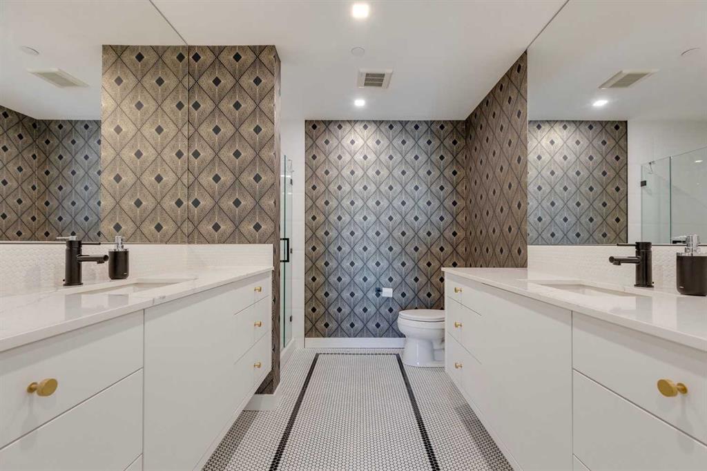 The chef-inspired kitchen serves as the heart of this home, showcasing super-matte finishes, striking brushed-gold hardware, and quartz countertops with a matching backsplash. High-end appliances, including a gas cooktop, wall oven, and a Fisher & Paykel integrated refrigerator, make meal prep a pleasure. A paneled dishwasher, soft-close custom cabinetry, under-cabinet lighting, and a convenient eating bar complete this elegant and functional space—perfect for both entertaining and everyday living.