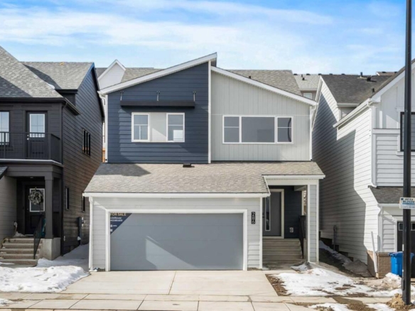 Welcome home to the Jade L — a beautifully upgraded laned home that combines modern design, thoughtful functionality, and refined finishes in the vibrant community of Lanark. Built by Sterling Homes Calgary, this residence showcases designer-curated interior selections and quality craftsmanship throughout, offering a truly move-in-ready experience. The main floor is bright and inviting, featuring wide-plank luxury vinyl flooring and an open-concept layout designed for both everyday living and entertaining. At the heart of the home, the chef-inspired kitchen impresses with quartz countertops, an oversized island with undermount sink, stainless steel appliances, sleek cabinetry with gold hardware, and a striking chimney-style hood fan. A fully equipped spice kitchen with gas range adds exceptional versatility and is a standout feature for home chefs. The living area is anchored by a contemporary electric fireplace with floor-to-ceiling tile, creating a warm and elegant focal point, while large windows flood the space with natural light. A main-floor bedroom and full bathroom provide ideal flexibility for guests, multigenerational living, or a private home office. Additional highlights include a walk-in pantry with built-in shelving, modern lighting, and clean-lined interior doors that enhance the home’s modern aesthetic. Upstairs, the thoughtfully designed layout continues with a vaulted-ceiling bonus room featuring a skylight, offering a bright and airy space perfect for family movie nights, a play area, or a quiet retreat. The primary suite is a true sanctuary, showcasing a spa-inspired 5-piece ensuite with dual sinks, a standalone soaker tub, a tiled shower, and a large window that fills the space with natural light. A spacious walk-in closet with custom wire shelving completes the retreat.
