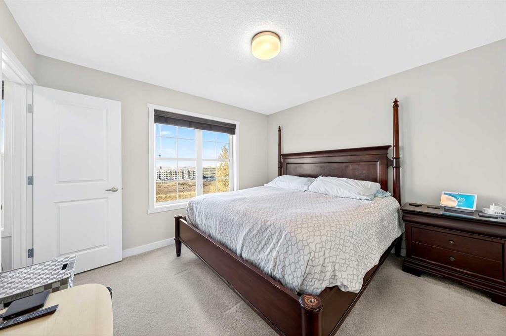 On the upper level, the Primary Bedroom offers a Walk-In Closet, 3-Piece Ensuite with a standing shower and seat, and a large window overlooking the Pond. Two additional Bedrooms, one with a Walk-In Closet, share a 4-Piece Bathroom, and the Upper-Level Laundry adds practicality.