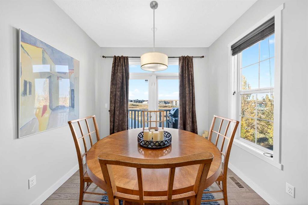 Step into the Main Floor with 9’ ceilings and gleaming hardwood floors throughout the Open-Concept Layout. The Kitchen showcases a Central Island, Raised Eating Bar with Quartz Countertops, Stainless Steel Appliances, plus a convenient Pantry. The Living Room includes a Juliet Balcony, while the Dining Area opens onto a Balcony with Gas Hookup, perfect for BBQs while enjoying serene Pond views. A Half Bath with Window completes the Main Level.