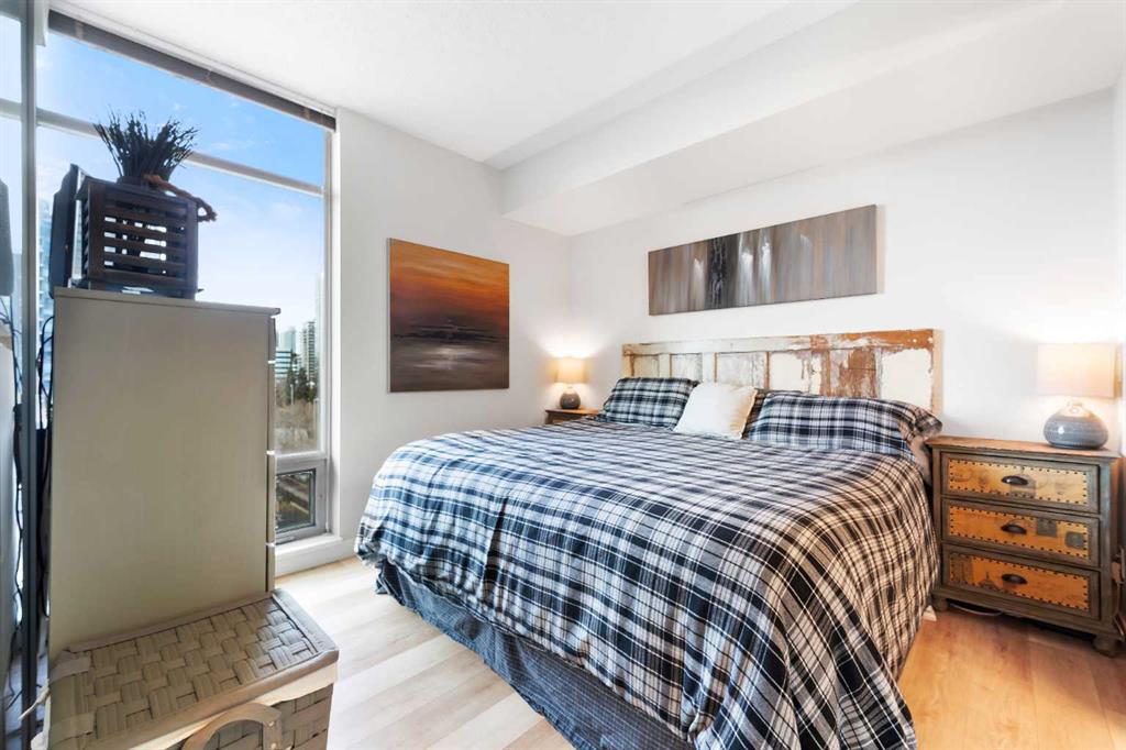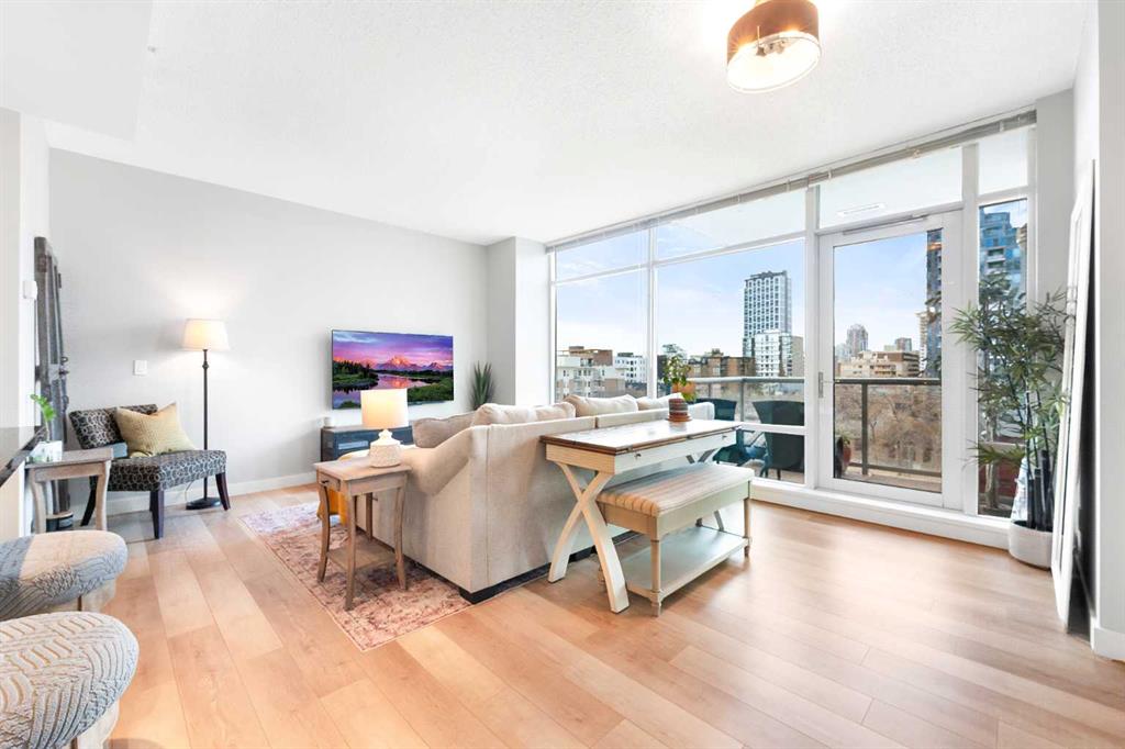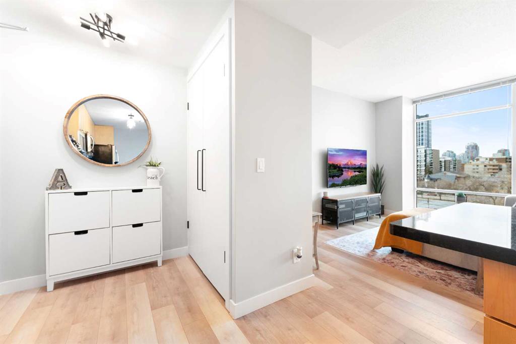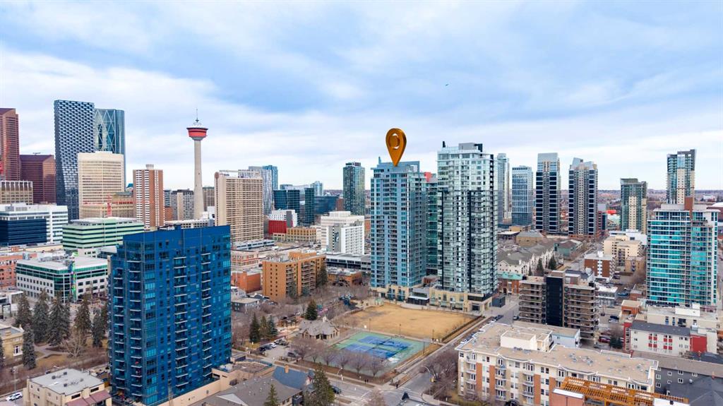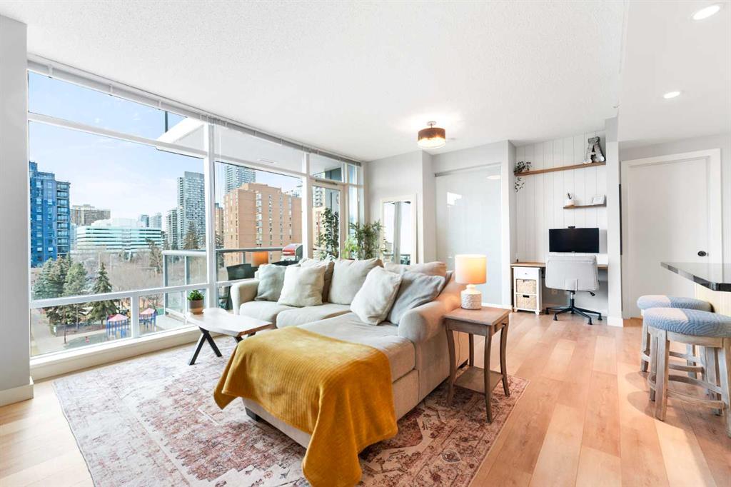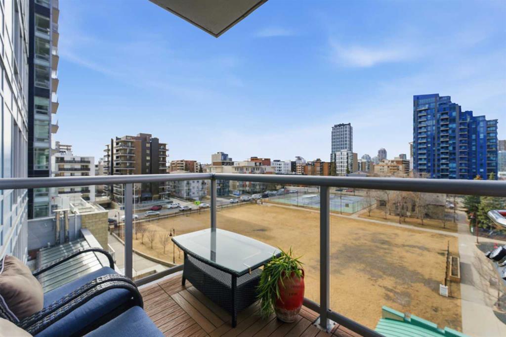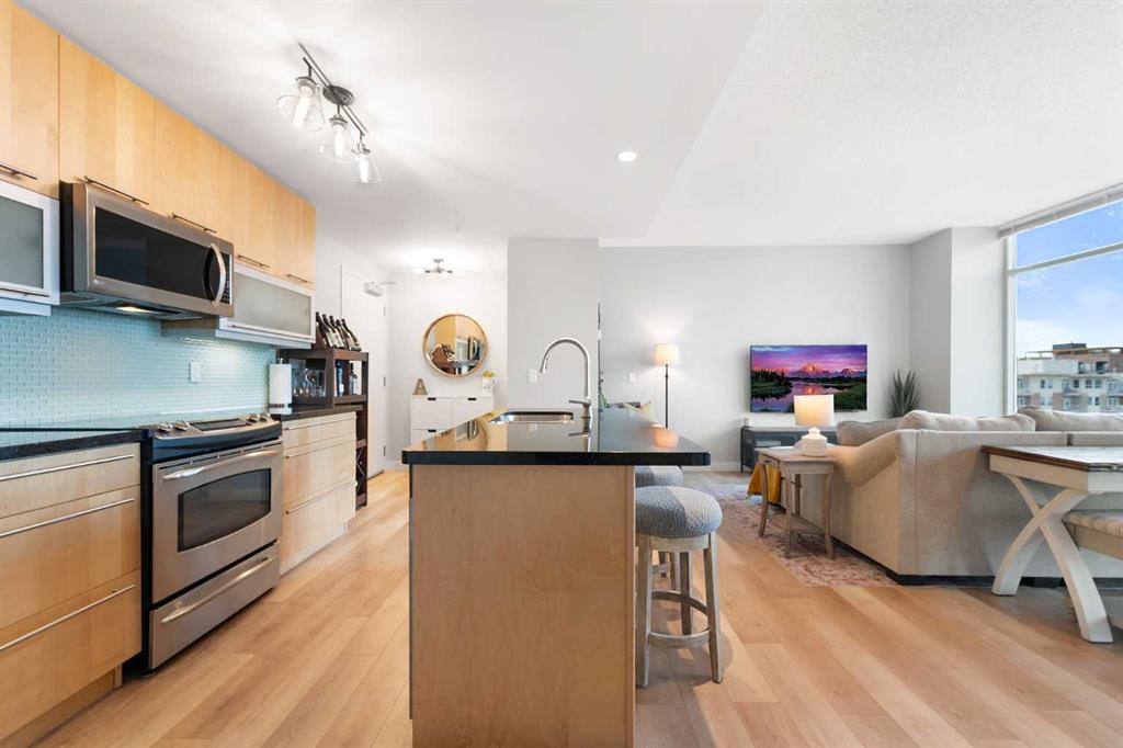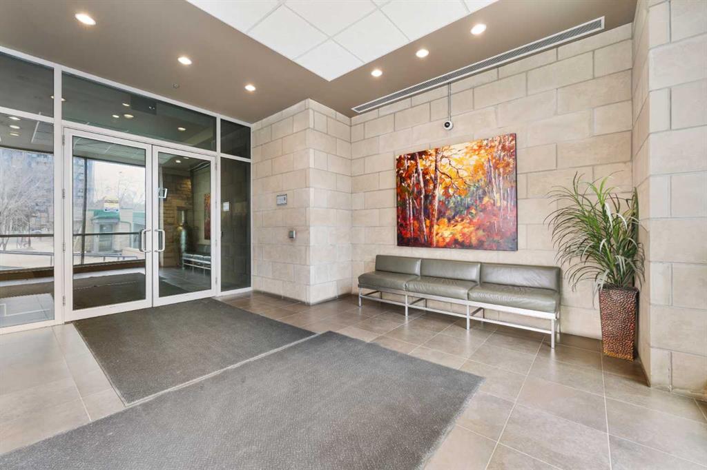 Experience vibrant inner-city living in this beautifully renovated 1 bedroom, 1 bathroom residence in Union Square, perfectly situated in Calgary’s sought-after Beltline. Offering a seamless blend of modern comfort and urban convenience, this west-facing unit showcases stunning park views and an unbeatable location backing directly onto Haultain Park—one of the few downtown residences to offer immediate access to green space and tennis courts. Recently refreshed with thoughtful upgrades throughout, the home features upgraded flooring, fresh contemporary paint, and stylish new lighting fixtures that create a bright and inviting atmosphere. The well-appointed kitchen is both functional and elegant, complete with sleek granite countertops, a spacious island, upgraded faucets, and a brand-new dishwasher—ideal for everyday living or entertaining guests. The open-concept layout flows effortlessly into the living area, where large windows fill the space with natural light and frame serene views of the park beyond. Designed with today’s lifestyle in mind, this unit includes a custom built-in workspace, perfect for working from home or staying organized. The bedroom offers comfort and practicality with upgraded closet doors and ample storage, while the bathroom has been enhanced with new faucets and updated fixtures, providing a clean, modern feel. Enjoy the convenience of in-suite laundry, adding ease to your daily routine. Step outside to your private balcony, finished with durable composite deck tiles, creating a welcoming outdoor retreat to relax and enjoy the west-facing exposure and peaceful surroundings. This exceptional offering also includes one titled underground parking stall and an assigned storage locker, ensuring secure parking and additional space for your belongings. Union Square is known for its contemporary design and unbeatable location above First Street Market, placing some of Calgary’s best dining, coffee shops, boutiques, and pubs right at your doorstep. Located on vibrant 1st Street SW, you’ll enjoy the energy of city living while still having direct access to green space just steps away. Whether you’re a professional, investor, or first-time buyer, this move-in-ready home delivers the perfect balance of style, comfort, and location in one of Calgary’s most dynamic communities. Don’t miss your opportunity to live in a beautifully updated unit with park-side living in the heart of the Beltline.
