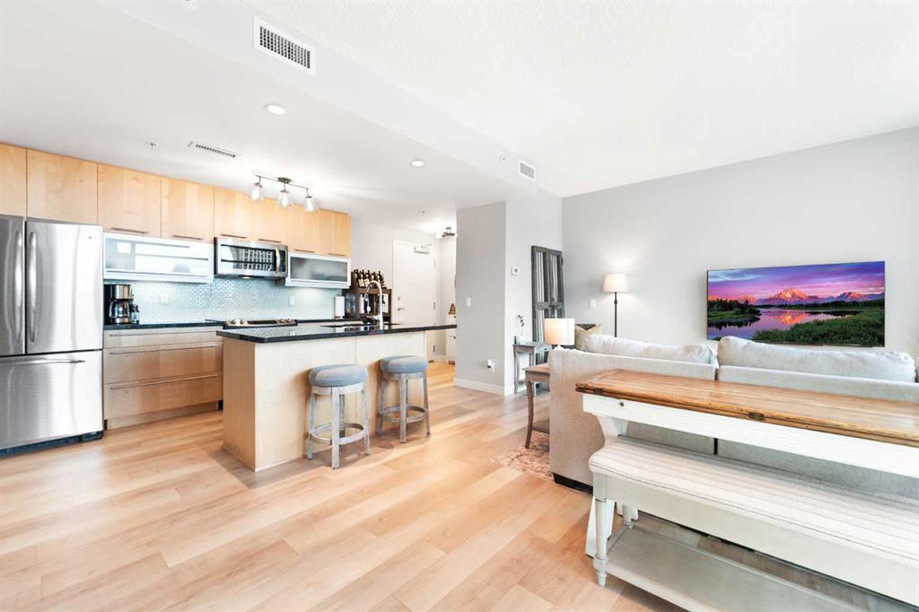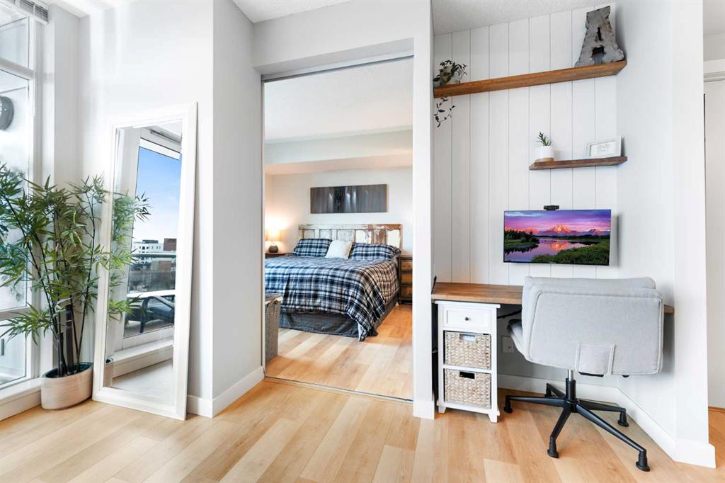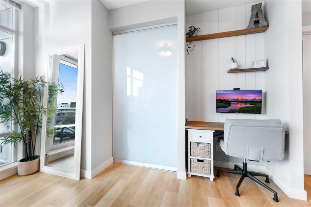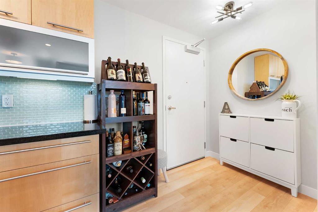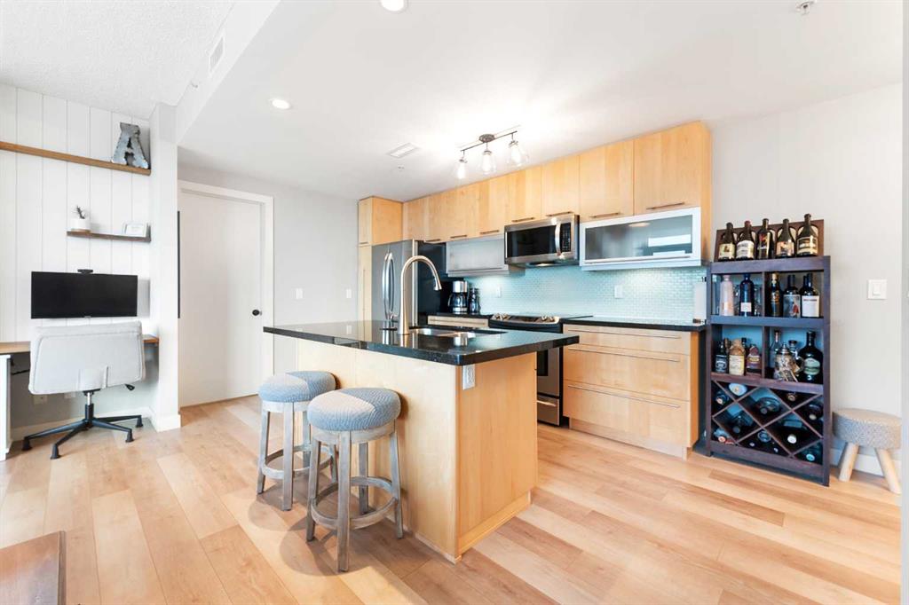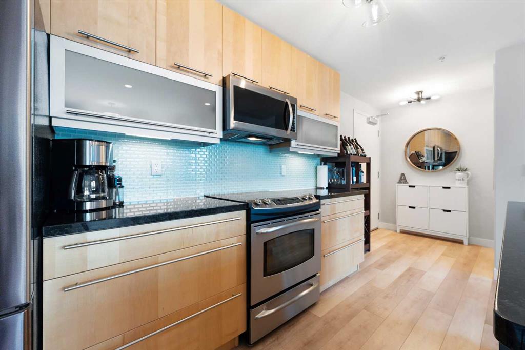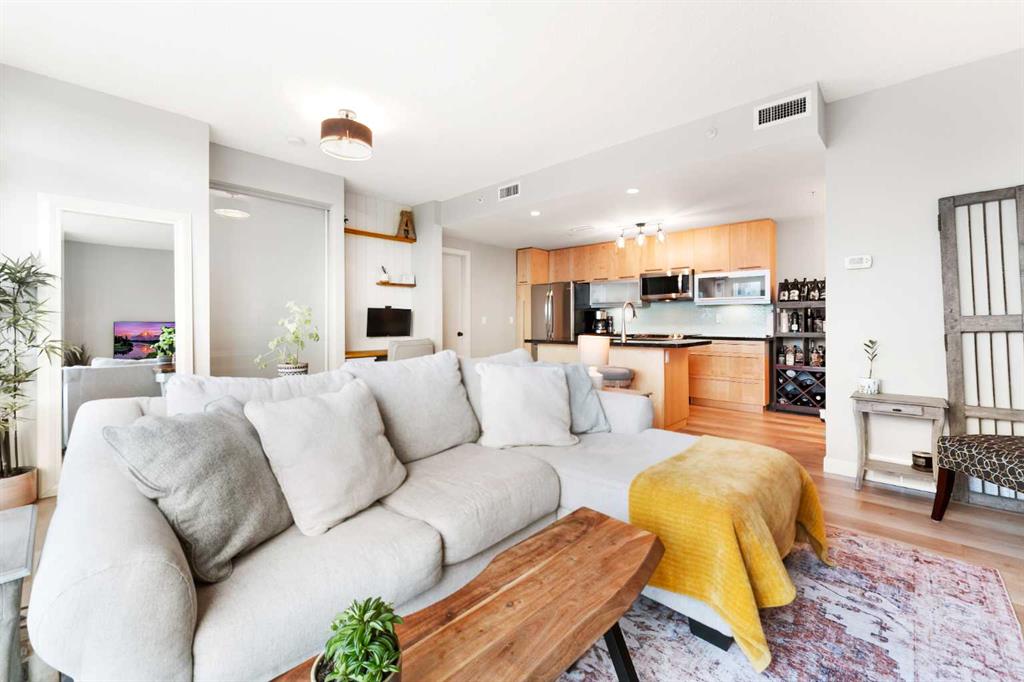 Experience vibrant inner-city living in this beautifully renovated 1 bedroom, 1 bathroom residence in Union Square, perfectly situated in Calgary’s sought-after Beltline. Offering a seamless blend of modern comfort and urban convenience, this west-facing unit showcases stunning park views and an unbeatable location backing directly onto Haultain Park—one of the few downtown residences to offer immediate access to green space and tennis courts. Recently refreshed with thoughtful upgrades throughout, the home features upgraded flooring, fresh contemporary paint, and stylish new lighting fixtures that create a bright and inviting atmosphere. The well-appointed kitchen is both functional and elegant, complete with sleek granite countertops, a spacious island, upgraded faucets, and a brand-new dishwasher—ideal for everyday living or entertaining guests. The open-concept layout flows effortlessly into the living area, where large windows fill the space with natural light and frame serene views of the park beyond. Designed with today’s lifestyle in mind, this unit includes a custom built-in workspace, perfect for working from home or staying organized. The bedroom offers comfort and practicality with upgraded closet doors and ample storage, while the bathroom has been enhanced with new faucets and updated fixtures, providing a clean, modern feel. Enjoy the convenience of in-suite laundry, adding ease to your daily routine. Step outside to your private balcony, finished with durable composite deck tiles, creating a welcoming outdoor retreat to relax and enjoy the west-facing exposure and peaceful surroundings. This exceptional offering also includes one titled underground parking stall and an assigned storage locker, ensuring secure parking and additional space for your belongings. Union Square is known for its contemporary design and unbeatable location above First Street Market, placing some of Calgary’s best dining, coffee shops, boutiques, and pubs right at your doorstep. Located on vibrant 1st Street SW, you’ll enjoy the energy of city living while still having direct access to green space just steps away. Whether you’re a professional, investor, or first-time buyer, this move-in-ready home delivers the perfect balance of style, comfort, and location in one of Calgary’s most dynamic communities. Don’t miss your opportunity to live in a beautifully updated unit with park-side living in the heart of the Beltline.