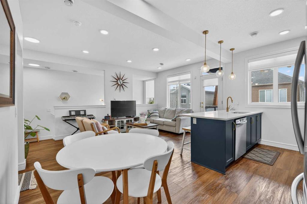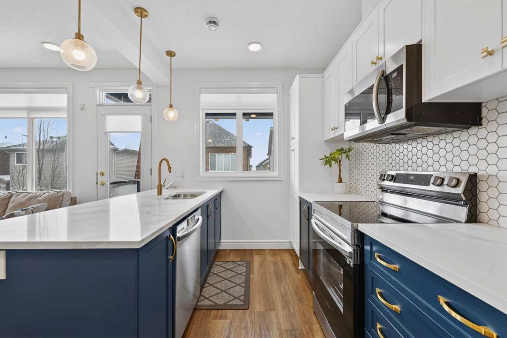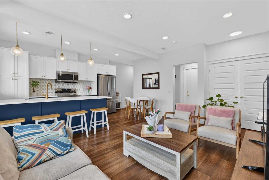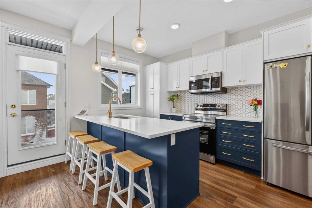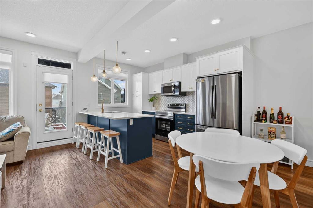 QUICK POSSESSION | THREE BEDROOMS | INDOOR PARKING – TWO BALCONIES This trendy and spacious three-storey townhome in the desirable community of Savanna offers outstanding value, a stylish modern design, and a convenient location close to transit, shopping, schools, walking paths, green spaces, dog parks, Metis Trail, Airport, and so much more. Designed for both comfort and functionality, this home is ideal for professionals, families, or investors looking for low-maintenance living in a vibrant urban setting. The entry-level welcomes you with a front foyer and important security with privacy. The upper main level features an open-concept living space with luxury vinyl plank flooring and abundant natural light, creating a warm and inviting atmosphere. The spacious living room flows seamlessly into the well-appointed kitchen and dining area, making this home perfect for relaxing evenings or entertaining guests. The kitchen is a true standout, featuring white with blue accent shaker-style cabinetry, quartz countertops, a stunning tile backsplash, upgraded stainless steel appliances, and a dramatic peninsula island with a flush eating bar and undermount sink. Just off the front living area, a sizeable east-facing balcony offers the ideal space for outdoor enjoyment with a covered area and peaceful prairie views. Upstairs, the home continues to impress with three generously sized bedrooms. The primary bedroom offers a private en-suite and oversized closet. The upper floor also features a laundry closet with a stacked washer and dryer. The main primary suite is thoughtfully designed and includes an upper east-facing balcony. This beautiful home combines contemporary aesthetics with everyday practicality, showcasing a modern décor palette, smart layout, and quality finishings throughout. With low-maintenance living, low condo fees of $208, thoughtful upgrades, and unbeatable convenience, this property offers a fantastic opportunity to move into a vibrant and growing community. Savanna is more than a neighbourhood—it’s a lifestyle. Live healthy and connected in a thriving, walkable community where you’re minutes from medical, green spaces, transit, and the upcoming LRT AIRPORT extension. Whether you’re commuting, working remotely, or enjoying your downtime, Savanna offers it all. A spring 2026 possession date is available—don’t miss your chance to make this stylish townhome your own. Contact your friendly REALTOR® today to arrange your private showing and experience all that this home has to offer!