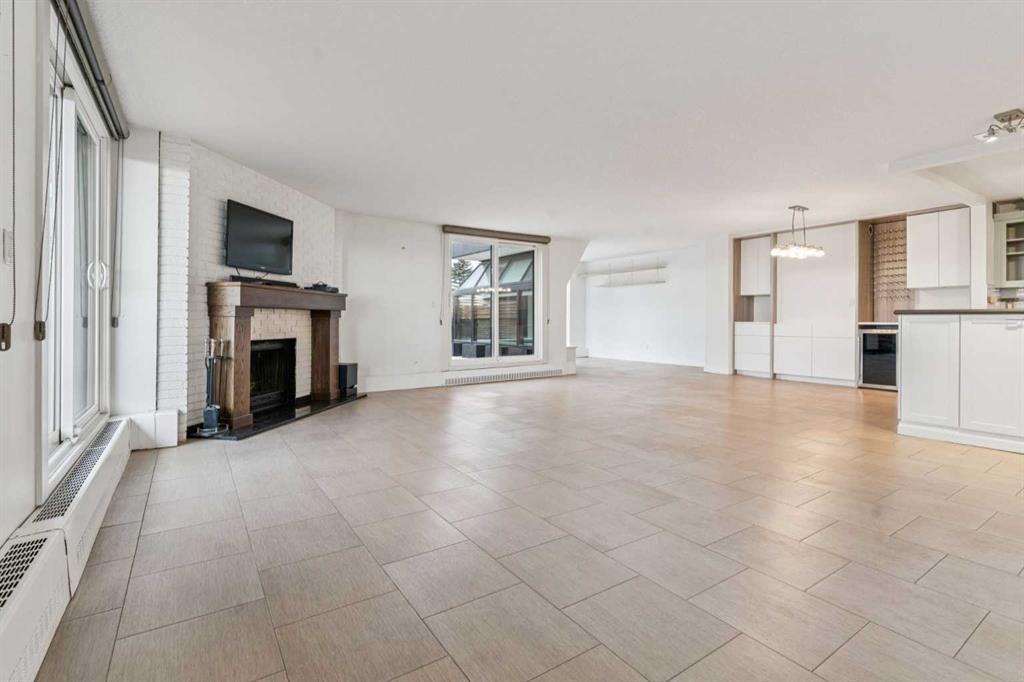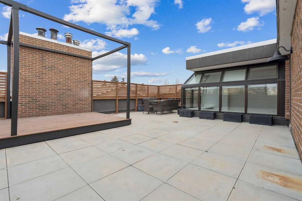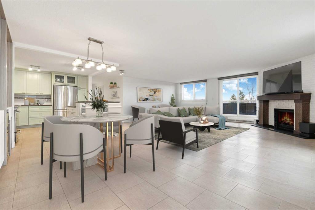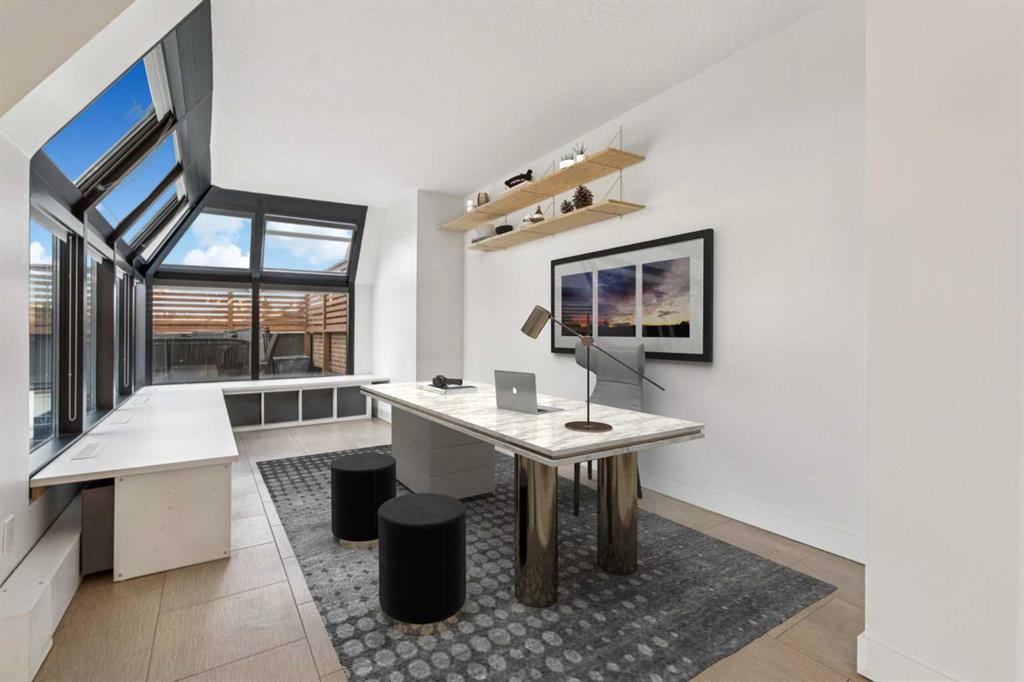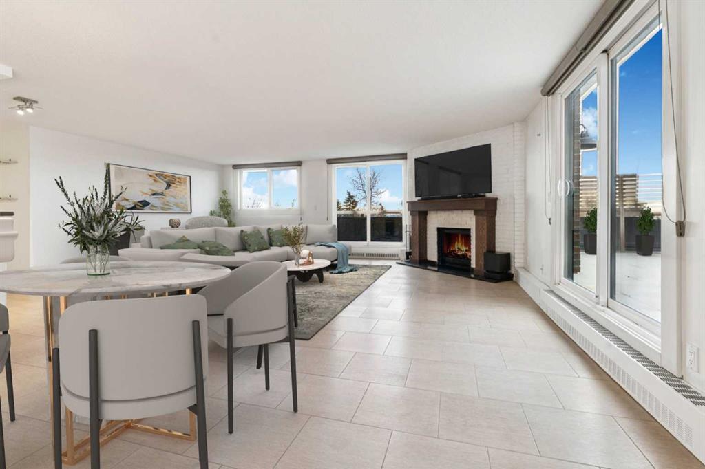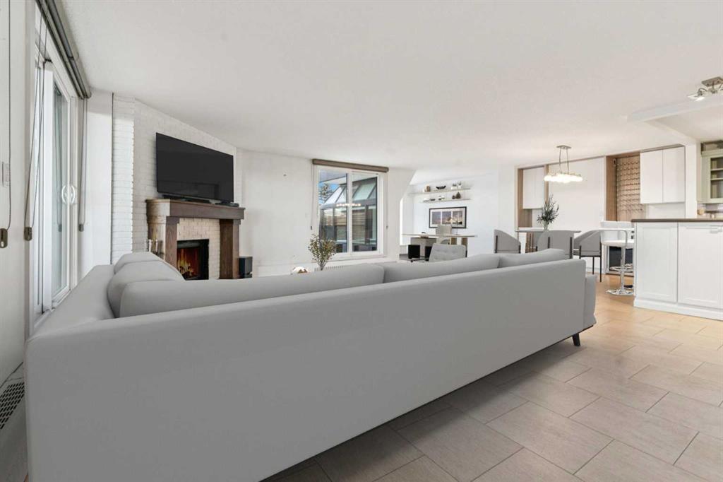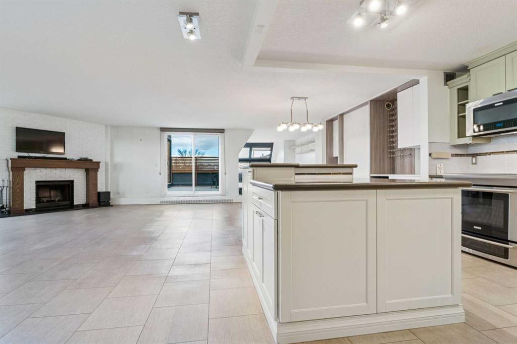 Welcome to an extraordinary top-floor retreat where refined indoor living meets unmatched outdoor space. Situated in a quiet concrete building, this impressive 1,500+ sq. ft. 2 bedroom, 2 bathroom home is finished to an exceptional standard throughout. The heart of the home is a custom Martha Stewart Living island kitchen, complete with stone countertops and premium Electrolux and Bosch appliances. It is very rare to find a custom kitchen of this size and quality! Beautiful appointed from top to bottom. It then flows seamlessly into a bright, open great room anchored by a cozy wood-burning fireplace. The space is very spacious with room for an additional library or seating area. Updated bathrooms, luxury vinyl tile and ceramic flooring, custom built-ins, double closets, and a large in-suite laundry room with abundant storage elevate everyday living. All of this as well as a very spacious office or studio space, solarium style with built-in, bench seating and a wall of windows. Mostly newer windows with custom blinds allow natural light to pour in from every angle. Step outside through two smooth-slide patio doors to a truly rare offering: a 700 sq. ft. penthouse-style wraparound rooftop patio. Designed for privacy and enjoyment, this outdoor oasis features a raised 24’ x 24’ deck with new wood feature walls. There is more unique spaces for dining, lounging or gardening! This patio is ideal for entertaining, BBQs, outdoor workouts, or simply relaxing while taking in sweeping southern sky views. Enjoy an easy-care executive lifestyle with two heated indoor parking stalls, a well-equipped fitness facility with sauna. Perfectly positioned on a peaceful, tree-lined street in the heart of revitalized Windsor Park, just steps to LRT, transit, Chinook Centre, shops, and restaurants. A short bike ride to Stanley Park, the Reservoir, and Elbow River pathways, and only 10 minutes to downtown. Condo fees include heat, water, and sewer. Immaculate, move-in ready, and truly one of a kind—this is elevated inner-city living at its finest.