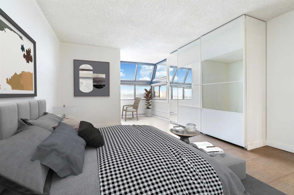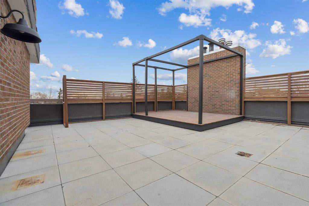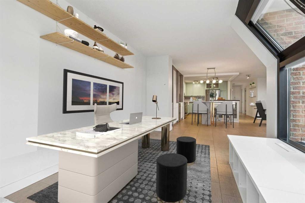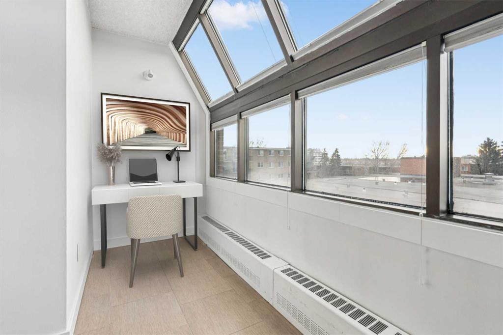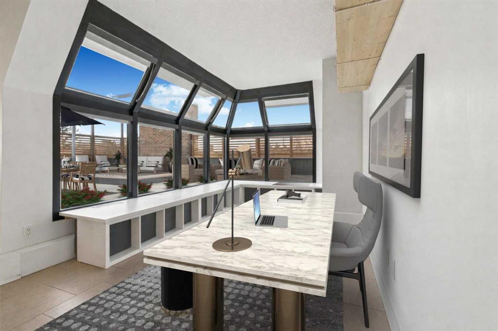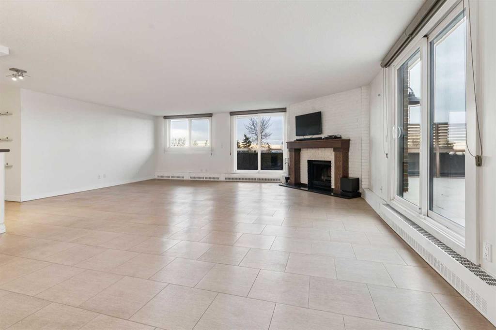 Welcome to an extraordinary top-floor retreat where refined indoor living meets unmatched outdoor space. Situated in a quiet concrete building, this impressive 1,500+ sq. ft. 2 bedroom, 2 bathroom home is finished to an exceptional standard throughout. The heart of the home is a custom Martha Stewart Living island kitchen, complete with stone countertops and premium Electrolux and Bosch appliances. It is very rare to find a custom kitchen of this size and quality! Beautiful appointed from top to bottom. It then flows seamlessly into a bright, open great room anchored by a cozy wood-burning fireplace. The space is very spacious with room for an additional library or seating area. Updated bathrooms, luxury vinyl tile and ceramic flooring, custom built-ins, double closets, and a large in-suite laundry room with abundant storage elevate everyday living. All of this as well as a very spacious office or studio space, solarium style with built-in, bench seating and a wall of windows. Mostly newer windows with custom blinds allow natural light to pour in from every angle. Step outside through two smooth-slide patio doors to a truly rare offering: a 700 sq. ft. penthouse-style wraparound rooftop patio. Designed for privacy and enjoyment, this outdoor oasis features a raised 24’ x 24’ deck with new wood feature walls. There is more unique spaces for dining, lounging or gardening! This patio is ideal for entertaining, BBQs, outdoor workouts, or simply relaxing while taking in sweeping southern sky views. Enjoy an easy-care executive lifestyle with two heated indoor parking stalls, a well-equipped fitness facility with sauna. Perfectly positioned on a peaceful, tree-lined street in the heart of revitalized Windsor Park, just steps to LRT, transit, Chinook Centre, shops, and restaurants. A short bike ride to Stanley Park, the Reservoir, and Elbow River pathways, and only 10 minutes to downtown. Condo fees include heat, water, and sewer. Immaculate, move-in ready, and truly one of a kind—this is elevated inner-city living at its finest.