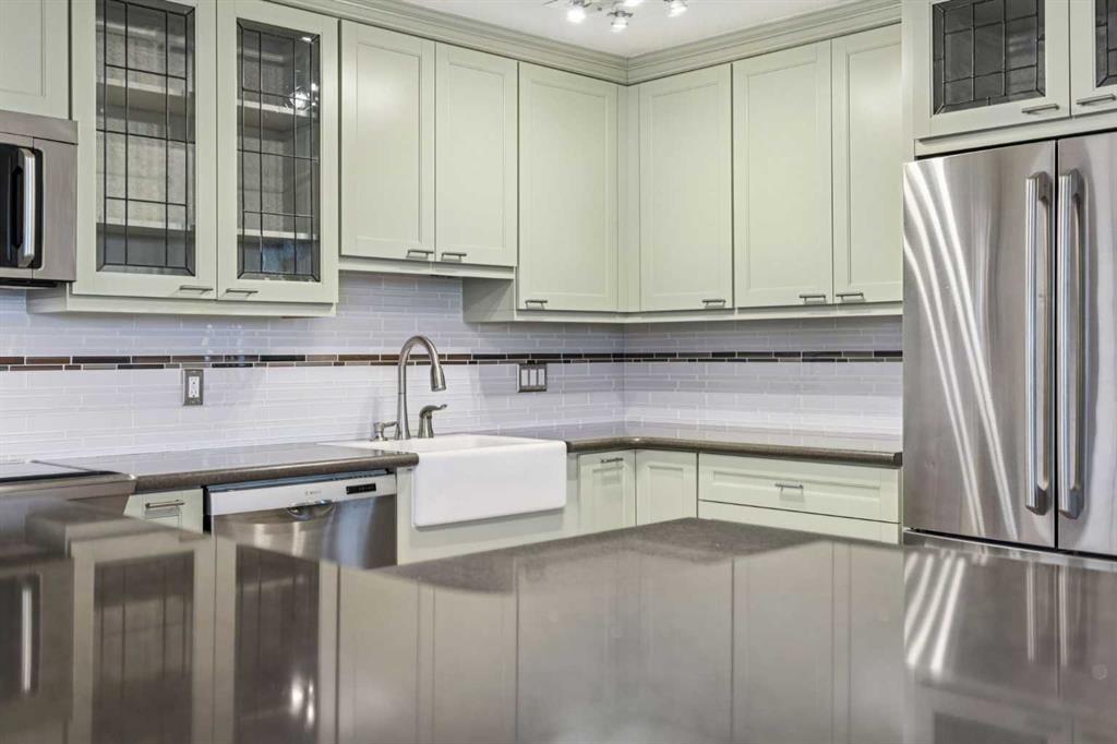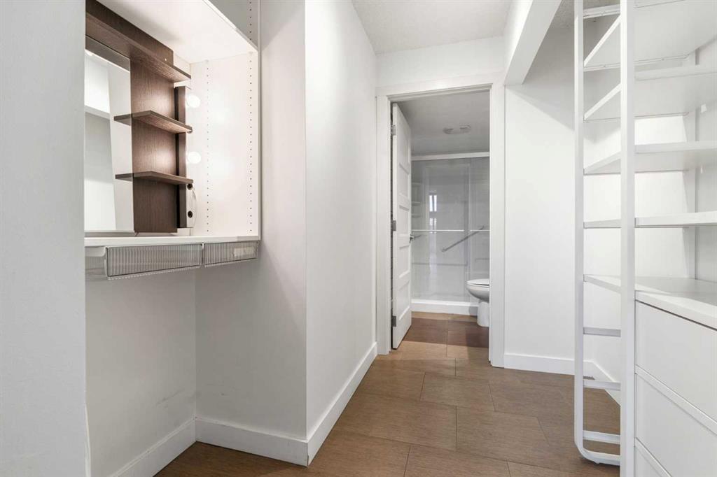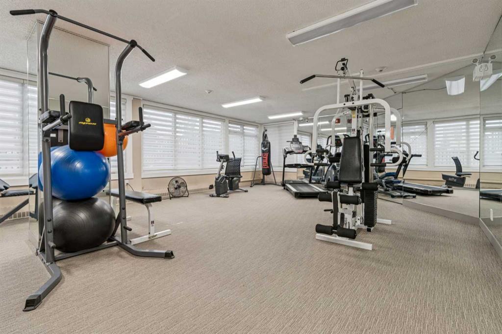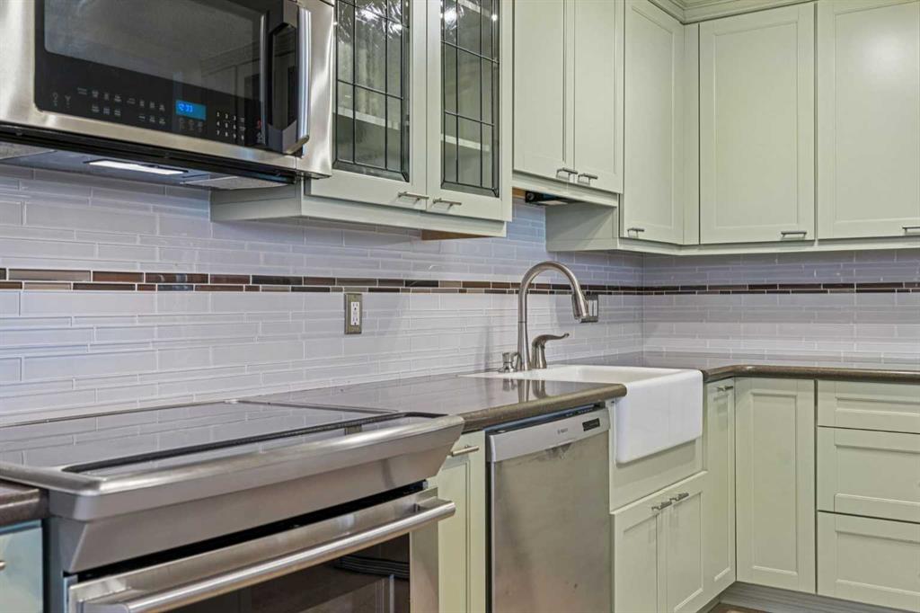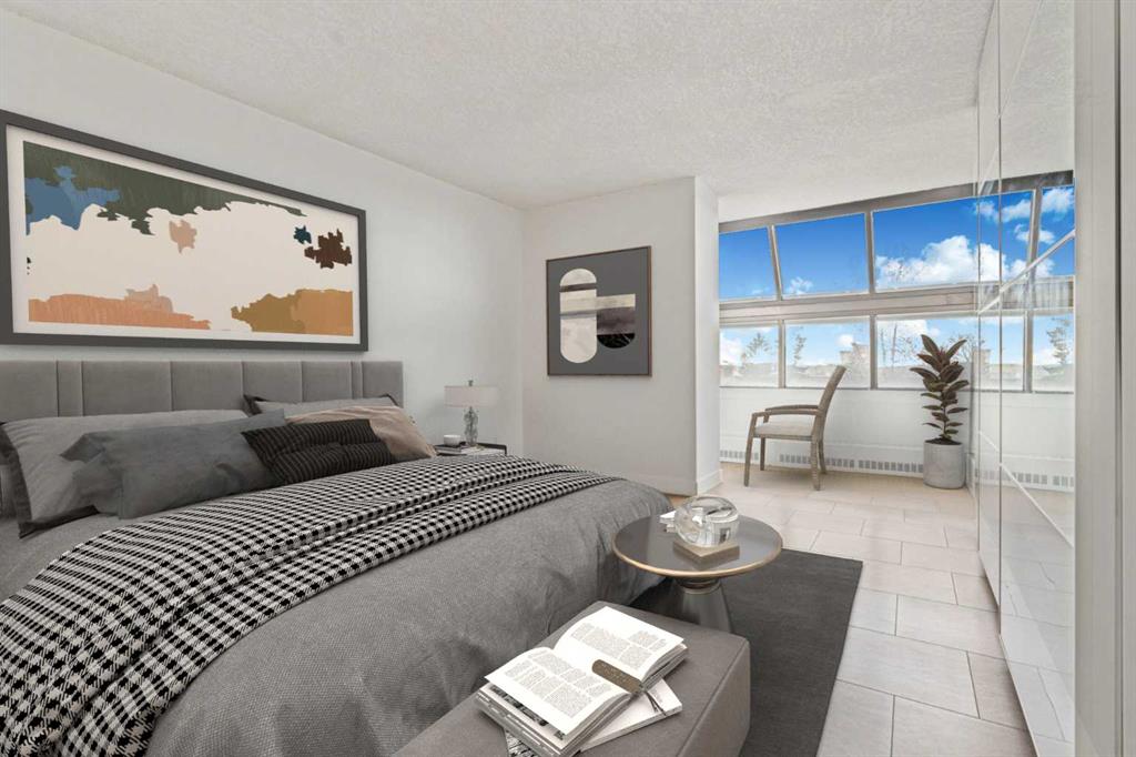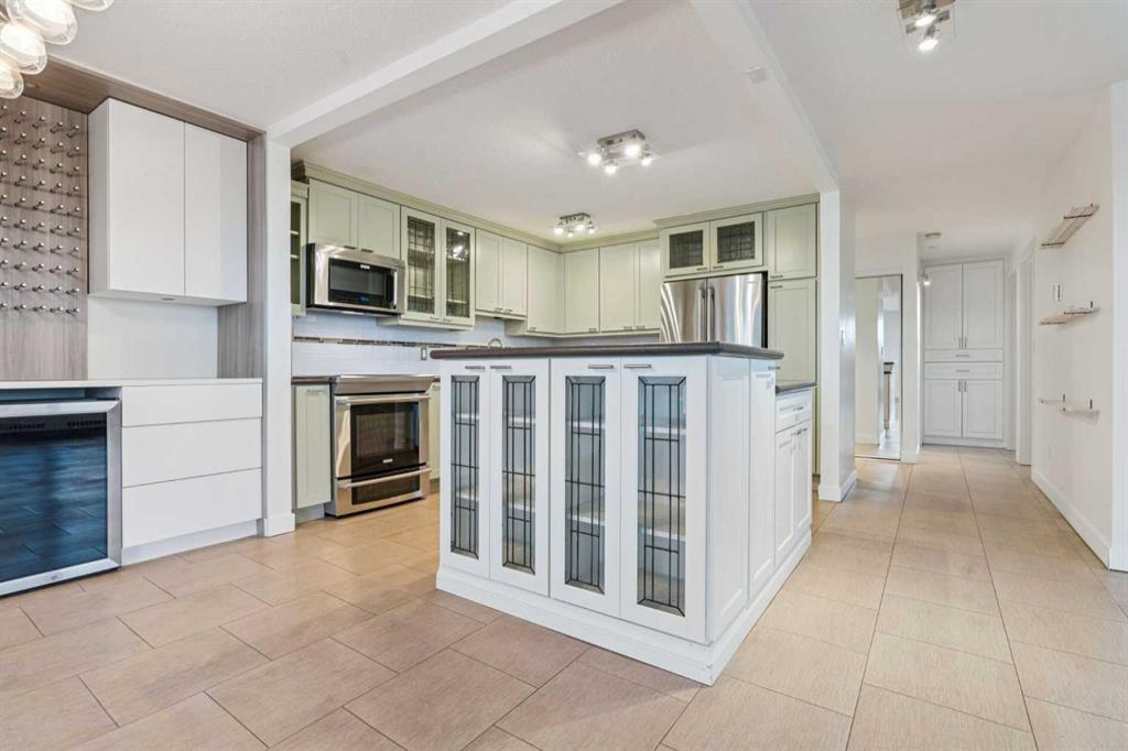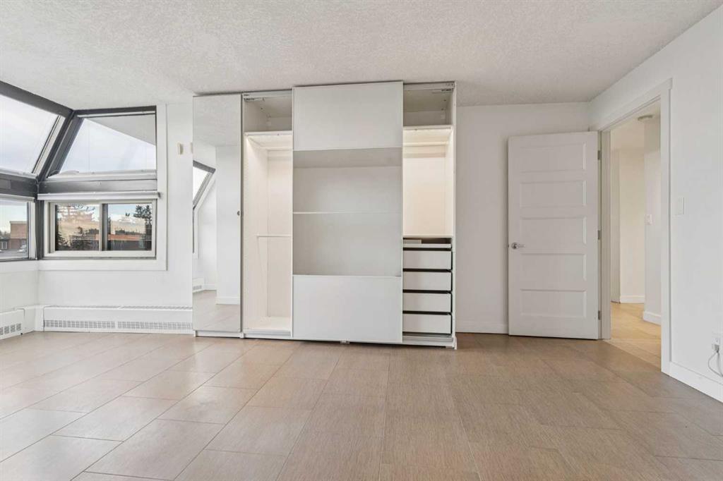 Welcome to an extraordinary top-floor retreat where refined indoor living meets unmatched outdoor space. Situated in a quiet concrete building, this impressive 1,500+ sq. ft. 2 bedroom, 2 bathroom home is finished to an exceptional standard throughout. The heart of the home is a custom Martha Stewart Living island kitchen, complete with stone countertops and premium Electrolux and Bosch appliances. It is very rare to find a custom kitchen of this size and quality! Beautiful appointed from top to bottom. It then flows seamlessly into a bright, open great room anchored by a cozy wood-burning fireplace. The space is very spacious with room for an additional library or seating area. Updated bathrooms, luxury vinyl tile and ceramic flooring, custom built-ins, double closets, and a large in-suite laundry room with abundant storage elevate everyday living. All of this as well as a very spacious office or studio space, solarium style with built-in, bench seating and a wall of windows. Mostly newer windows with custom blinds allow natural light to pour in from every angle. Step outside through two smooth-slide patio doors to a truly rare offering: a 700 sq. ft. penthouse-style wraparound rooftop patio. Designed for privacy and enjoyment, this outdoor oasis features a raised 24’ x 24’ deck with new wood feature walls. There is more unique spaces for dining, lounging or gardening! This patio is ideal for entertaining, BBQs, outdoor workouts, or simply relaxing while taking in sweeping southern sky views. Enjoy an easy-care executive lifestyle with two heated indoor parking stalls, a well-equipped fitness facility with sauna. Perfectly positioned on a peaceful, tree-lined street in the heart of revitalized Windsor Park, just steps to LRT, transit, Chinook Centre, shops, and restaurants. A short bike ride to Stanley Park, the Reservoir, and Elbow River pathways, and only 10 minutes to downtown. Condo fees include heat, water, and sewer. Immaculate, move-in ready, and truly one of a kind—this is elevated inner-city living at its finest.