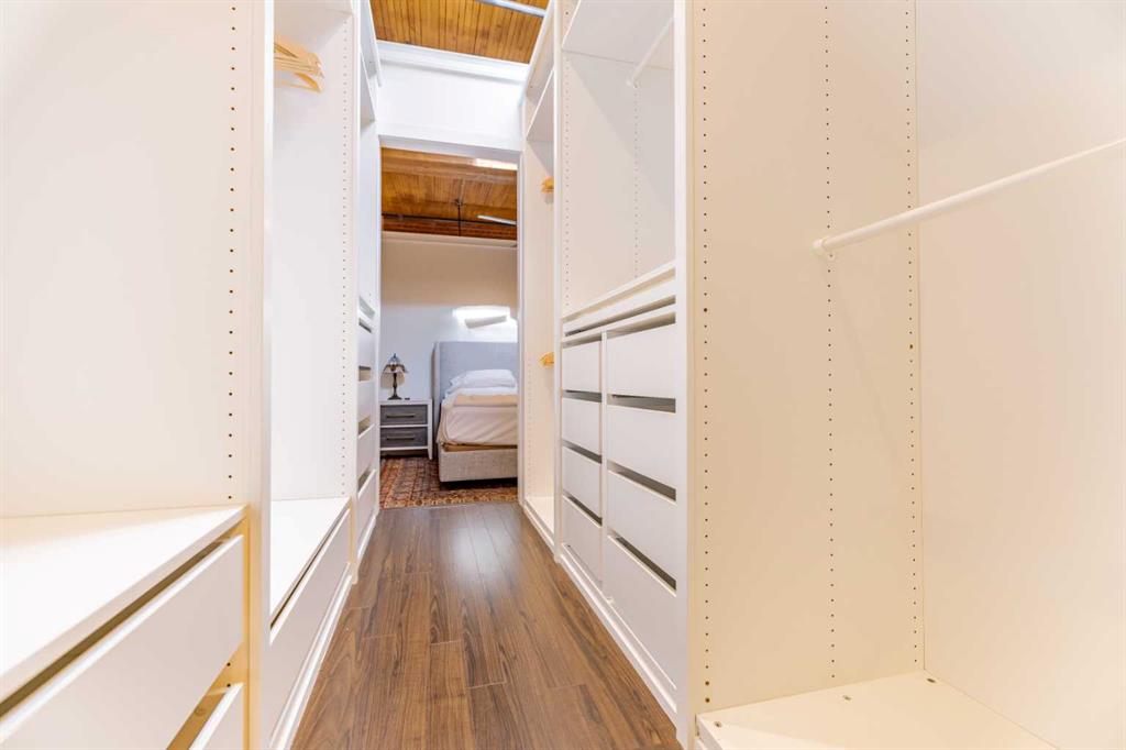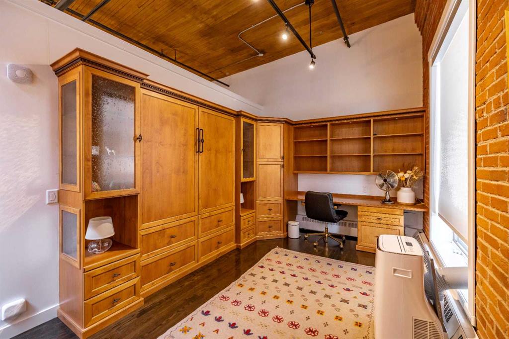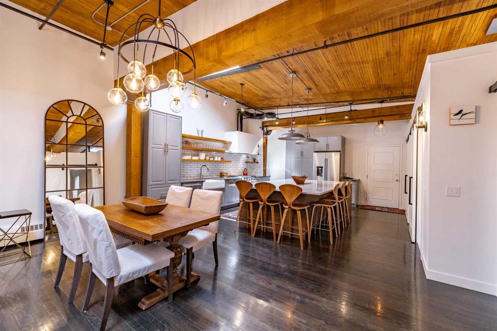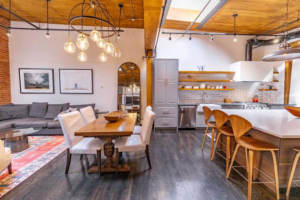 within the storied walls of the Historic Hudson, this extraordinary loft penthouse is where century-old character meets exquisite modern luxury. Built in 1909 and reborn for the discerning urban dweller, this residence is a testament to timeless craftsmanship and visionary design. Sunlight pours through skylights that crown soaring ceilings, illuminating a space that feels both expansive and intimate. Every detail has been curated with care—but the heart of this home is its unforgettable chef’s kitchen. A monumental island commands attention, inviting gatherings, creativity, and conversation. With high-end appliances and a 6-burner gas stove, it’s a culinary sanctuary worthy of your finest creations. The living area flows gracefully toward a serene, enclosed primary bedroom—a rare luxury in a loft-style home. Beyond the bedroom lies a remarkable and unexpected indulgence: a spacious custom walk-through closet, designed with tailored storage and thoughtful organization. Continue through and you’ll discover a full-size laundry room, beautifully integrated and exceptionally functional. This thoughtful sequence—bedroom to boutique-style closet to dedicated laundry—creates a private, elevated retreat rarely seen in loft living. The spa-level bathroom is equally spectacular, featuring a sculptural Victoria + Albert tub, heated floors, and a double shower enclosed in crystal-clear glass. Rich oak hardwood floors, a double-sided fireplace, and bespoke built-ins enhance the home’s warmth and sophistication. The elegant den, complete with custom cabinetry and a concealed Murphy bed, offers versatility for guests or an inspiring workspace. Located in Calgary’s vibrant Beltline, this home places you moments from world-class dining, boutique shopping, and cultural experiences. With titled underground parking and the exclusivity of a low-traffic, mixed-use heritage building, this is urban living at its most refined. A rare offering. A historic treasure. A loft unlike any other in the city.