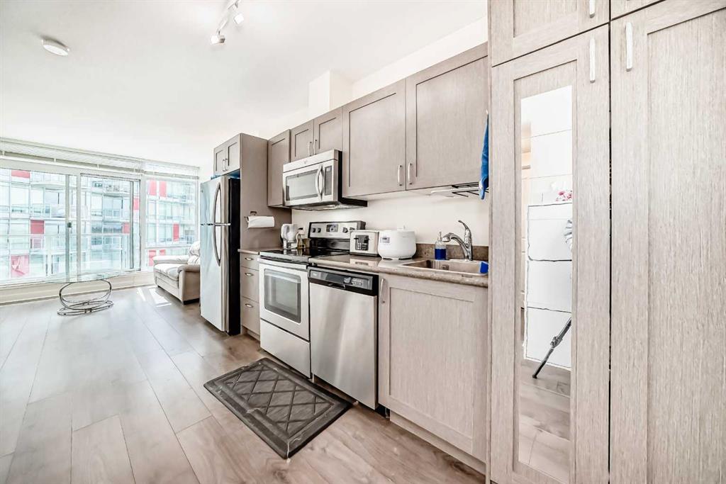 cabinets and a fridge. The stacked laundry unit right off the entry adds for extra convenience while there is ample storage off the entryway,