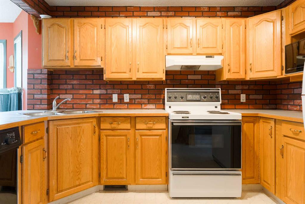 The main floor features a generous living room with a cozy fireplace and direct access to the back deck, offering a simple outdoor space to enjoy during the warmer months. A convenient 2 piece bathroom and a spacious country style kitchen with oak cabinets, ample counter space, and a bayed dining nook complete the main level. The finishes reflect an earlier era in a functional and comfortable layout.
