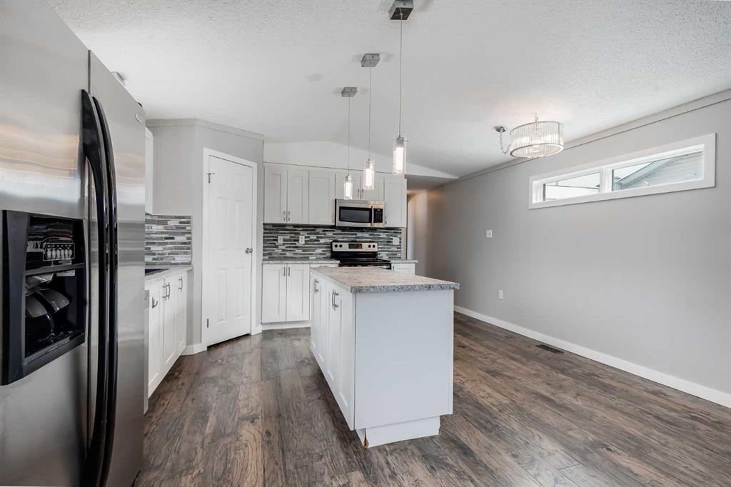 white cabinetry, stainless steel appliances, a large island and a good sized eating area. The primary bedroom is generously sized and includes a 4 piece ensuite. Two additional bedrooms and another full bathroom provide plenty of space for family or guests. A separate laundry room adds convenience and provides access to the second deck. The exterior features low maintenance vinyl siding and a private fenced yard. The park is well managed and features a clubhouse that offers a variety of activities throughout
