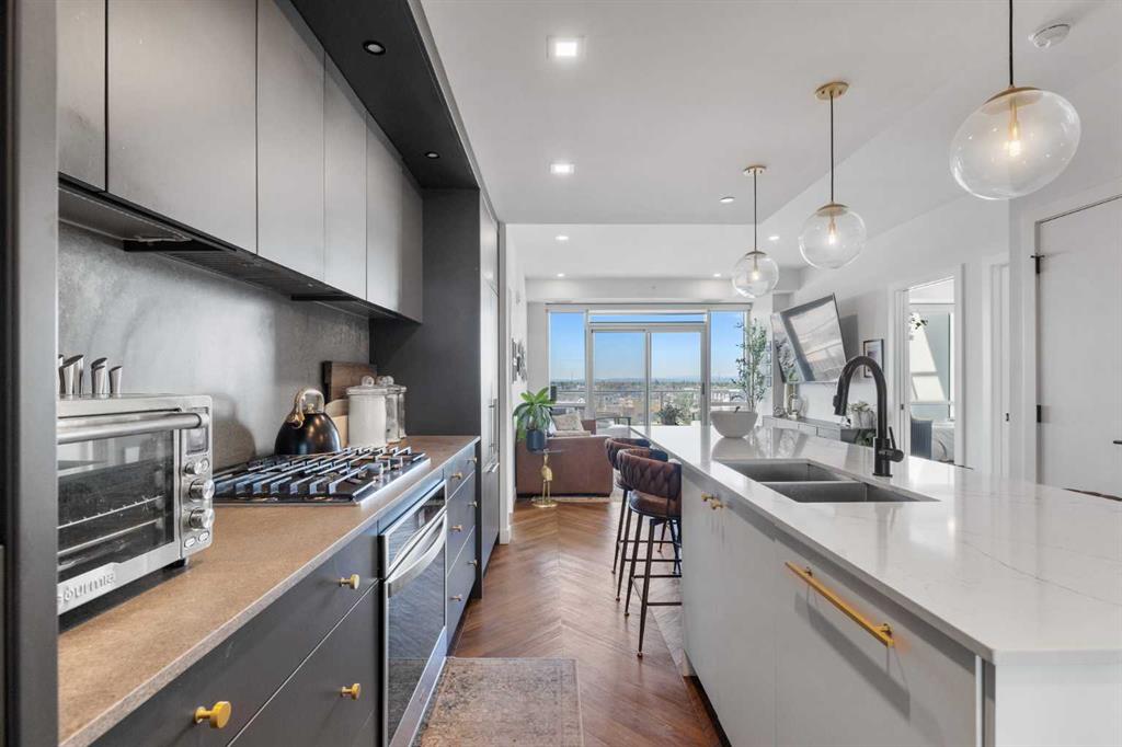 Discover sophisticated living in this upscale 2-bedroom, 2 bathroom condo nestled in the heart of West Springs. Perfect for professionals or downsizers, this concrete-built, low-maintenance residence offers quiet comfort, durability, and a prime location in a vibrant, walkable community. Step through the generous foyer into a sun-drenched open-concept layout featuring expansive windows and sliding glass doors that flood the space with natural light and showcase breathtaking views, including the mountains. The spacious living area opens seamlessly to a large balcony (one of the few private ones in the building), ideal for morning coffee or evening relaxation. The chef-inspired kitchen impresses with integrated stainless steel appliances, a gas range, and a large eat-up island—perfect for entertaining. The adjacent dining room is both generous in size and versatile enough to serve as a home office or library. Retreat to the primary suite offering a large walk-in closet and a spa-like 4-piece ensuite with dual vanities and a walk-in shower. A second bedroom and a stylish 4-piece bath with deep soaker tub provide flexibility for guests or family. The flexibility of the bedrooms and bathrooms in this unit would also lend itself to two adults easily sharing the space. You’ll also appreciate the in-suite laundry and flooring with acoustic underlay throughout. Additional features include: air conditioning, 1 titled underground parking stall, EV charging stations & bike storage, owner’s lounge on same level, lobby concierge, ground-level restaurants, shops, wellness studios, community gardens. Just minutes from Calgary French & International School, Webber Academy, Rundle College, and Ernest Manning High School, and quick access to Stoney Trail for weekend getaways. This quiet unit is extremely well-maintained and move-in ready, and combines luxury, lifestyle, and location into one exceptional offering.
