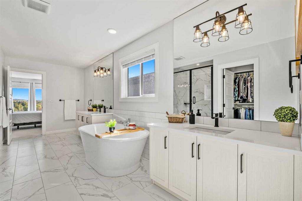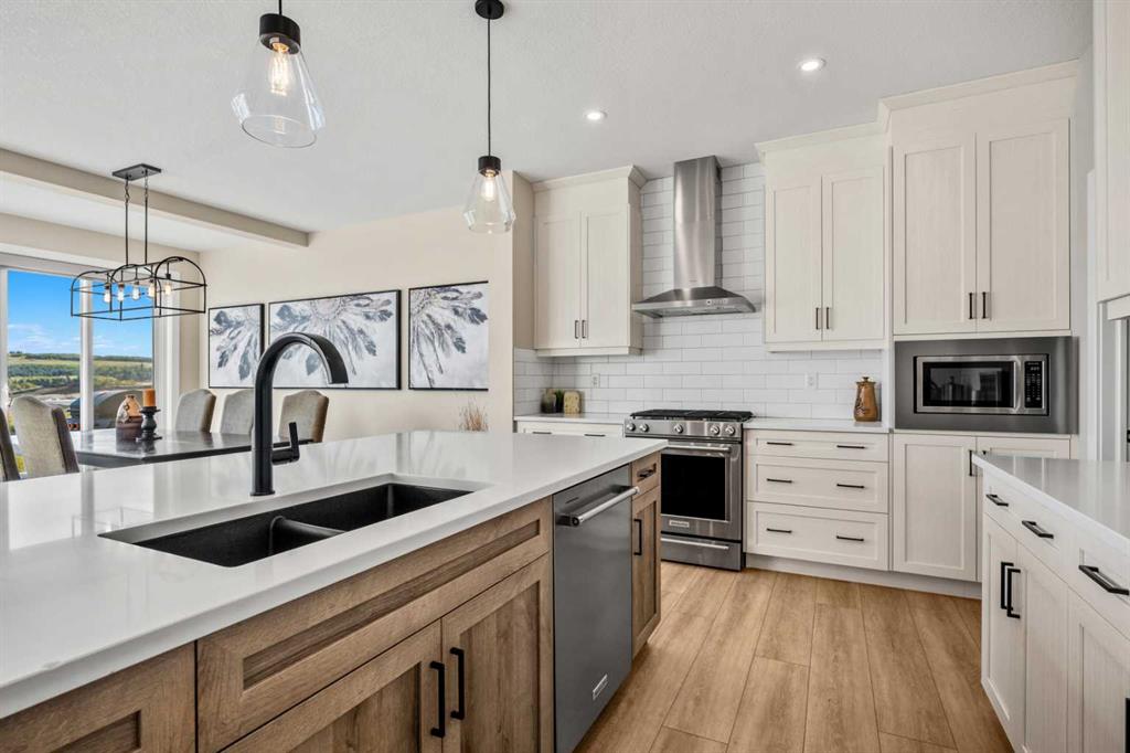 The One You’ve Been Waiting For – A Rare Find in Hudson at Pine Creek. Some homes check boxes – this one stops you in your tracks! A fully finished 2-storey walk-out in Hudson at Pine Creek, crafted for those waiting for the perfect home. With 2,600+ sq. ft. above grade and a beautifully developed lower level for 3,700+ sq. ft. total, it delivers lifestyle and setting. Towering windows frame rolling Foothills views, endless south/west skies, and trails steps from your back gate – a backdrop you won’t find again. Inside, every detail feels elevated yet inviting. The gourmet kitchen commands attention with its oversized island, gas range, full coffee bar and walk-through Butler’s pantry with custom live-edge countertop – ideal for daily living and stylish hosting. The open layout flows across wide-plank blond LVP floors under a soaring staircase that floods the entry with drama and light. Off the main living area, a massive deck with gas BBQ hookup and updated Tuff deck finish spans the back. Function meets polish with a spacious double garage leading to a mudroom with custom built ins. A main floor office/library/playroom adds versatility. Upstairs, the private primary retreat impresses with double walk-in closets, spa-like en-suite, and elevated views. The bonus room showcases panoramas, while two more large bedrooms (both with walk-ins) sit nearby. A dream laundry and well-planned bath make the upper floor both practical and stylish. The finished walk-out basement sets this home apart. With its own kitchen, oversized bedroom, bright living space, and abundant natural light, it’s perfect for multi-generational living or adult kids needing independence. Not using the illegal suite? Imagine the ultimate games room, home theatre, or an epic bar—this level adapts to your vision. Step outside to a maintenance-free yard with premium artificial turf and direct trail access. A large playground across the street offers open space for games and gatherings. Extras push this home over the top: exterior wrapped lighting (no more Christmas lights), programable motorized blinds that let in light while blocking heat, custom built-ins, upgraded powder room vanity, AC, and dual-zoned HVAC. Even the exterior is fully finished for pure, no-maintenance enjoyment. If you’ve been waiting for a home that stands out—a rare blend of style, function, and setting—this is it! Move-in ready, unforgettable, and truly one-of-a-kind.