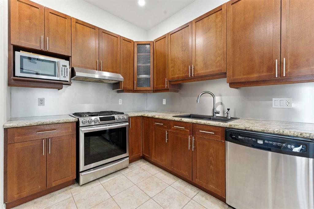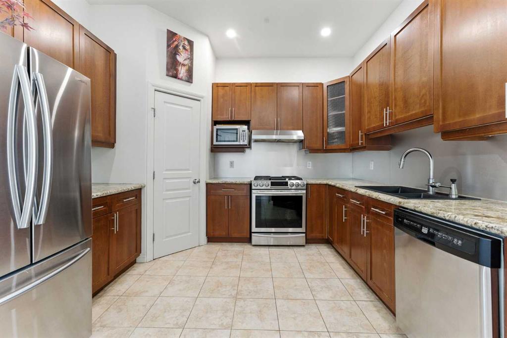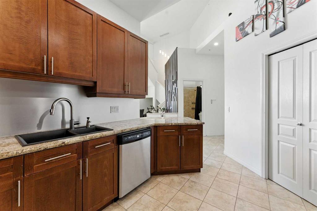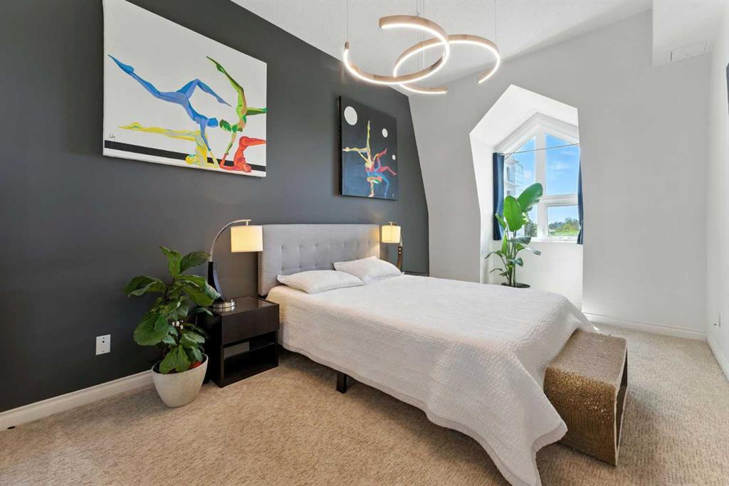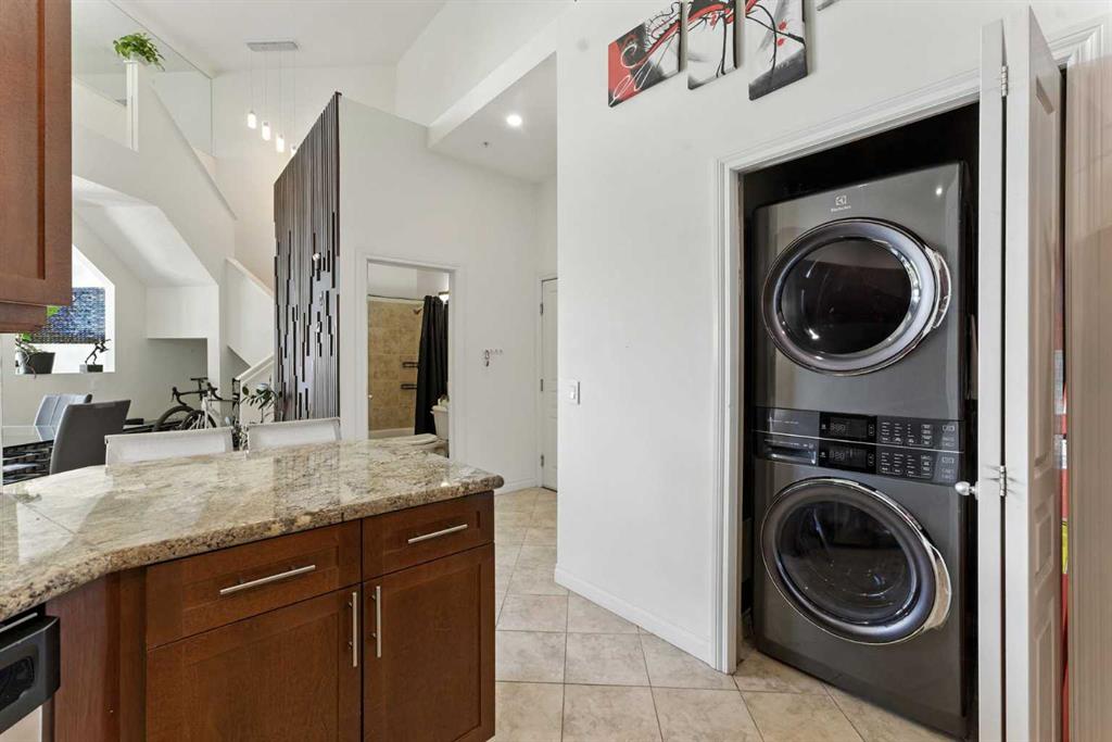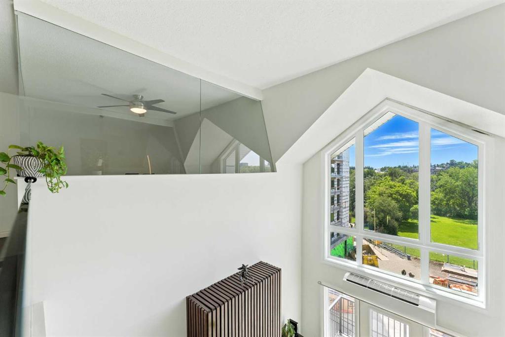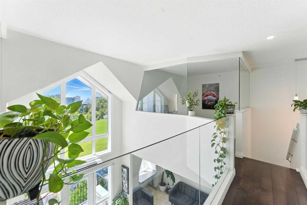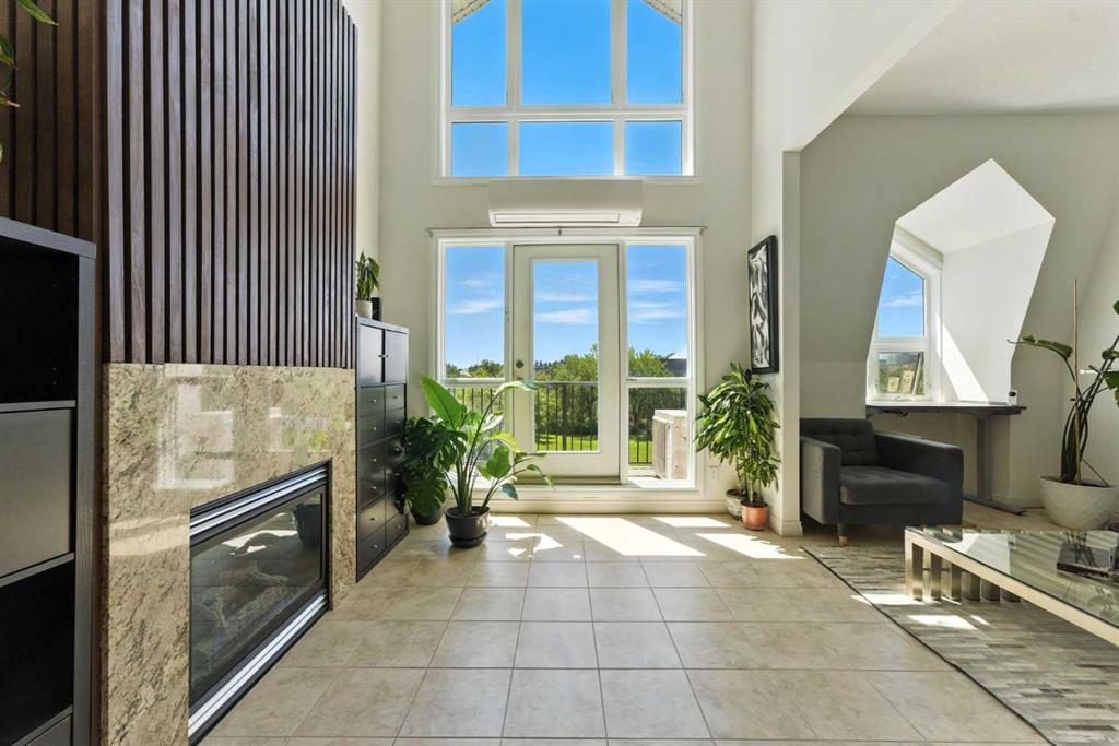 Experience elevated urban living in this stunning penthouse loft with 1585 sqft, 2 bedrooms + Den, 2.5 bathrooms, perfectly positioned to offer both serenity and excitement. Overlooking a quiet, south-facing park and just moments from the vibrant energy of 17th Avenue, this exceptional residence blends tranquility with the convenience of city life. As you enter, you’re welcomed by soaring 20-foot vaulted ceilings, dramatic architectural lines, and an abundance of natural light streaming through expansive vaulted windows. The heart of the home is a thoughtfully designed kitchen, featuring heated floors, sleek maple cabinetry, stainless steel appliances, and a gas stove—ideal for both everyday cooking and gourmet entertaining. The main floor features a spacious primary bedroom with a spa-inspired ensuite and access to a private balcony, perfect for enjoying peaceful morning views or evening sunsets. A cozy fireplace anchors the inviting living area, making it an ideal space for relaxing or hosting guests. A second full bathroom on this level adds everyday convenience. Upstairs, you’ll find a generous 2nd bedroom, a large bonus room, and a versatile den or office space that could easily serve as a 3rd bedroom or creative studio. Elegant glass railings enhance the open-concept design, creating a light and airy ambiance throughout the upper level. Additional features include a titled heated underground parking stall and a secure assigned storage locker, providing everything you need for a comfortable and effortless urban lifestyle. Don’t miss your chance to call this remarkable penthouse loft home—discover a perfect blend of sophistication, space, and city convenience.