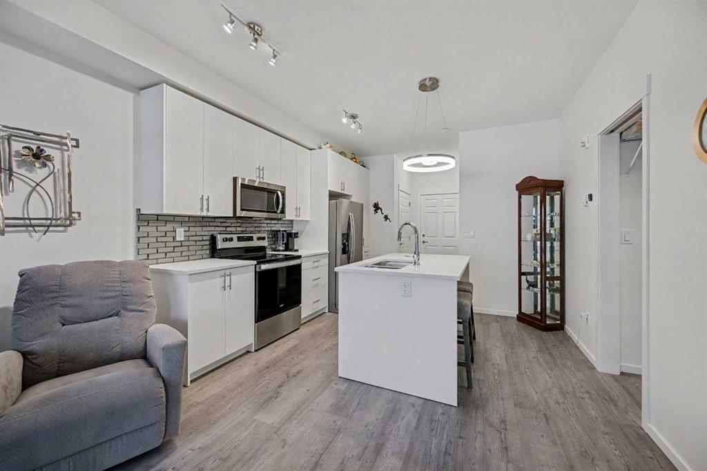 Welcome home to your beautifully UPGRADED MODERN two bedroom plus den/storage condo featuring 9 ft ceilings, LUXURY VINYL PLANK flooring throughout, CENTRAL AC, and more. The spacious kitchen offers QUARTZ countertops, full height cabinets, STAINLESS STEEL appliances, and a large ISLAND overlooking the dining and living areas, perfect for everyday living and entertaining. This ground floor unit features a large FENCED PATIO and is located in a PET FRIENDLY building. The primary bedroom includes a walki-n closet and a cheater ENSUITE. There is INSUITE laundry and storage, as well as a titled UNDERGROUND PARKING stall and assigned storage locker. Located in popular Legacy, close to walking paths, playgrounds, and nearby shopping. Exceptional value! Don’t miss out on this fantastic condo.