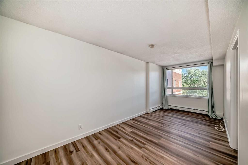 Welcome to this top floor Broadview Garden 1 bedroom apartment unit with underground parking ($38,000 if sold separately) located in the heart of Calgary’s Chinatown. This top floor unit features newer vinyl plank flooring and paint throughout (both updated in 2024), offering an inviting Bow River view. It has a great open floorplan with spacious living room. One of the standout features is the stunning open view of the historic Lions on Centre Street bridge crossing the Bow River leading up to Crescent Heights so enjoyable to your daily living. Monthly condo fee include electricity, heat and water. Walking distance to public transportation. Easily accessible to vibrant shopping, restaurants, and all other amenities the downtown has to offer. Don’t miss the opportunity to own this unit with its combination of upgrades and beautiful views. The recently announced special assessment responsible to pay by the seller will bring refurbishment to the building towards a more contemporary standard. Current tenancy agreements expire June 30, 2026. Tenants’ right apply.