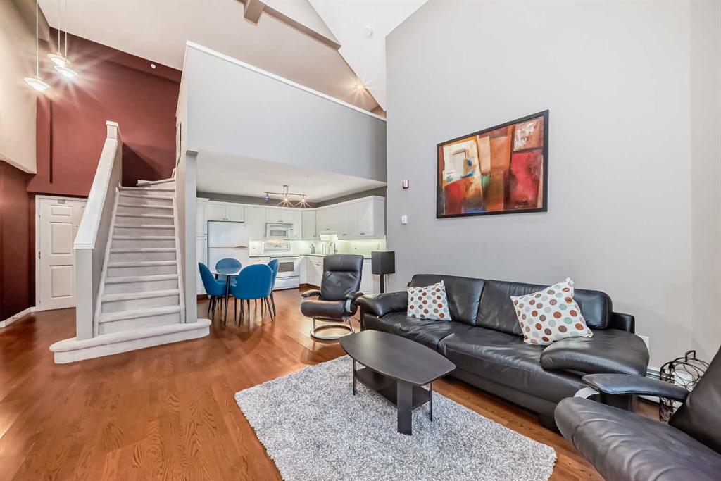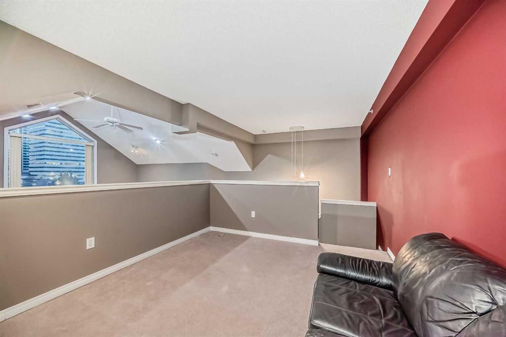 Here’s the rare opportunity to own a PENTHOUSE unit with a SECOND FLOOR LOFT a mere 2 blocks away from the gorgeous pathways and serene views of the Bow river and pathways of Prince’s Island park! Located on the edge of Calgary’s famous Eau Claire neighbourhood, this area provides all the conveniences of downtown living but in a noticeably less busy and peaceful area, removed from the hustle of the downtown core. Tired of constantly looking at units that face directly into the sides of buildings? Unit 514 boasts an unobstructed BRIGHT AND SUNNY view to the SOUTH, looking out into downtown and over the Historic 118-year old Mcdougall Centre with its beautiful park space next to it. But don’t just look at it, the HUGE 14×8 balcony lets you completely immerse yourself and lounge in your surroundings and Calgary’s famous year-round sunlight (note the natural gas hookup for BBQ or Patio heater!). This unit features a wonderful layout that truly makes sense, offering a bedroom and bathroom on each side, with the living room and kitchen located centrally, ensuring privacy for occupants at all times. The living room boasts unbelievable 18.5-foot high vaulted ceilings, something only a true penthouse can offer, with a massive window above the sliding glass door that completely fills the living space with natural light.