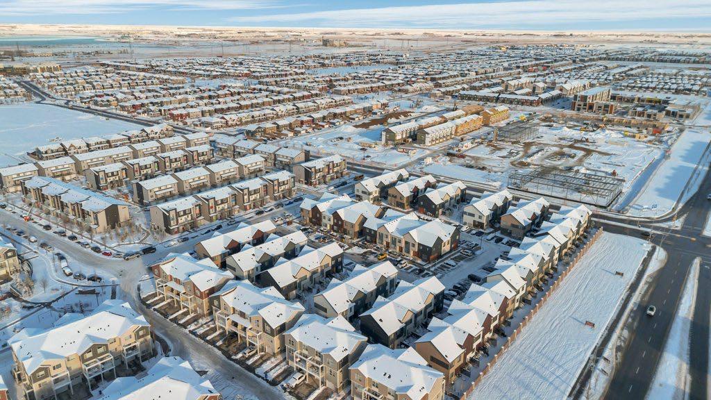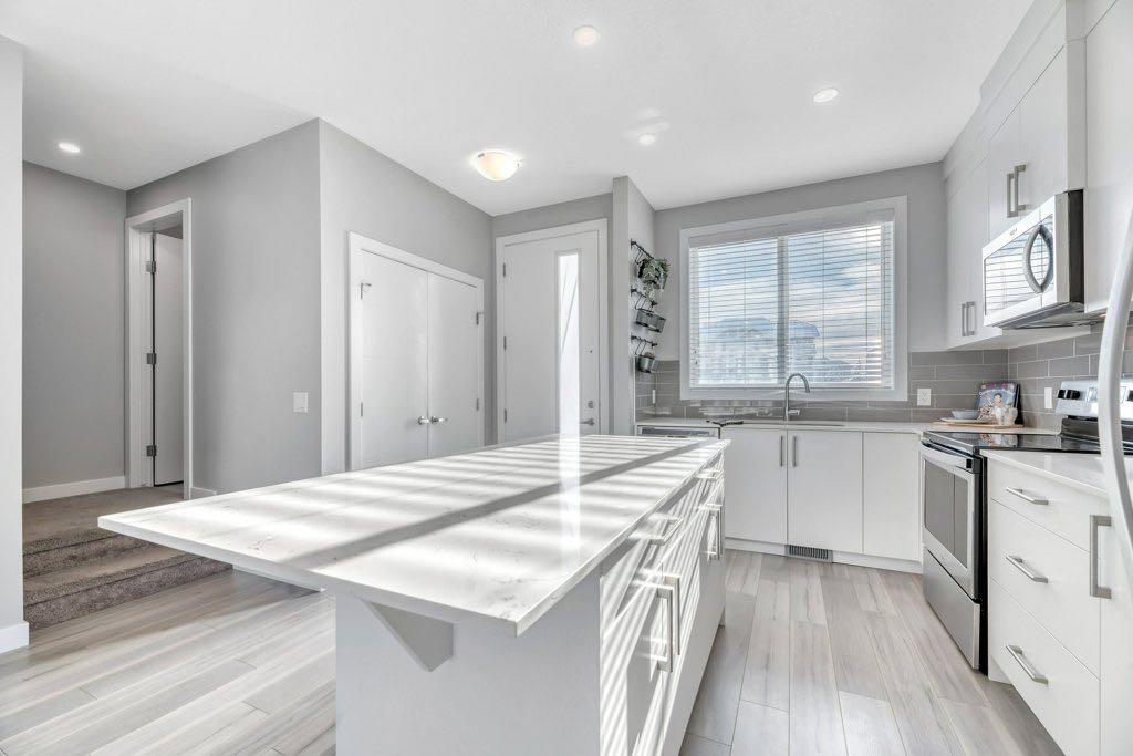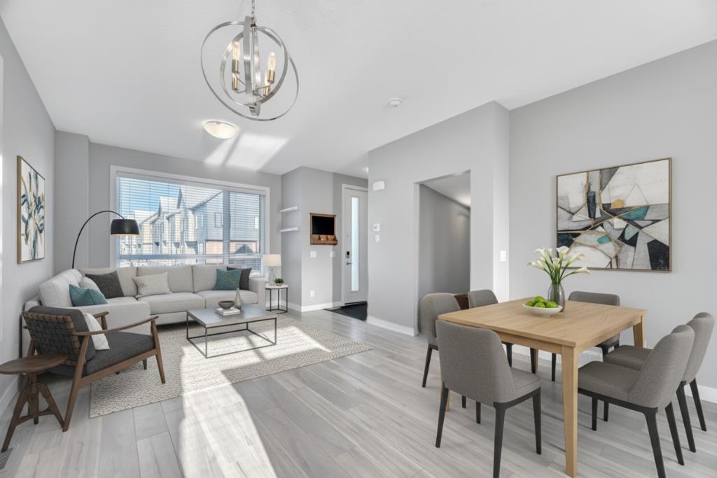 Your new home awaits in arrive at Redstone Way. This gorgeous end unit townhome will blow you away with its sleek, modern finishes and thoughtful design throughout. And with 1,880 sq ft of developed living space this home also offers amazing value. Located in the vibrant community of Redstone you’ll enjoy a growing number of local amenities. Stepping into the front door you’ll appreciate the spacious entryway with built-in hooks for hanging outerwear plus a great size closet. You’ll immediately be wowed by the open concept design enhanced by 9’ ceilings and tons of natural light flooding in from the big windows including an extra side one thanks to it being an end unit. A soothing grey and white colour palate will allow you to easily customize the space with your own decor. The space flows seamlessly from the front living area to the rear kitchen with a nice sized dining area in between. You are going to fall in love with this kitchen and its sleek white cabinetry, gleaming stainless steel appliances, oversized subway tile backsplash, granite counters and centre island with seating. Luxurious Vinyl Plank flooring throughout is both beautiful and durable. A back door allows easy access to your back patio and shared lawn space for outdoor living. A 2 pc powder room is discreetly located up a couple of steps for privacy. Upstairs you’ll find 3 bedrooms including the primary with its own 4 pc ensuite. The other 2 bedrooms share the other 4 pc bath. And you’re going to love the convenience of upstairs laundry and ample storage space. The fully finished basement is the perfect space for your teenager, guests or extended family members to call their own. They’ll enjoy a nice sized living area, a large 4th bedroom and full bath plus you still have ample room for storage. This terrific home comes complete with 2 dedicated parking stalls close by as well as EV charging stations for residents. This unit has rough in for central air conditioning. Pets are welcome in this complex with some restrictions but don’t worry about bringing your lawn mower or snow shovel as common area maintenance and snow removal are included. The master planned community of Redstone offers 2 new schools sites, well-maintained green spaces, scenic walking trails, a variety of parks & playgrounds as well as close proximity to shopping, medical clinics, restaurants and the Calgary airport. With easy access to transit and both Stoney & Deerfoot Trails you are well connected to the rest of Calgary. Your are going to love living here!