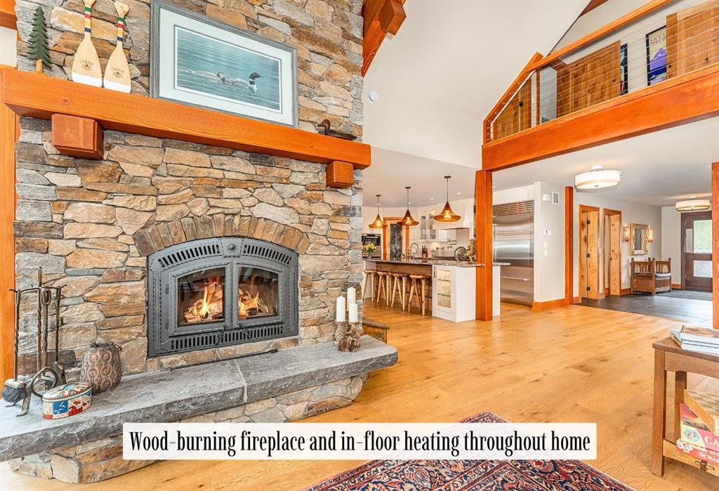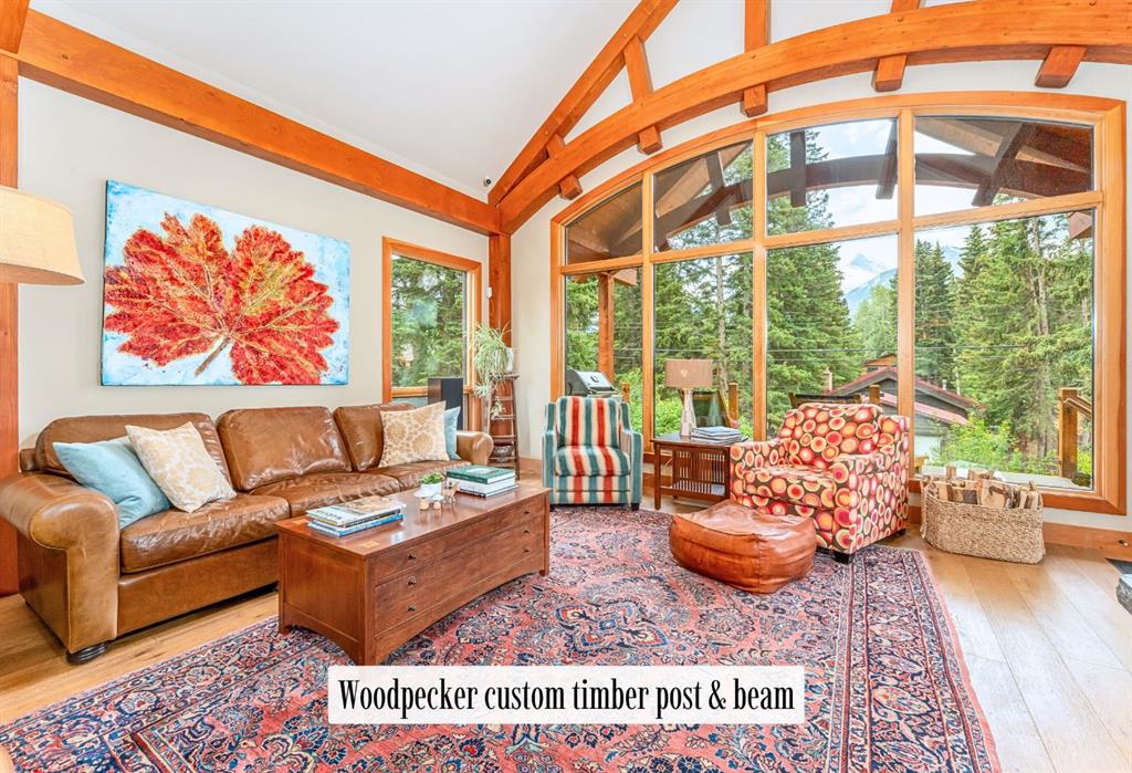 The heart of the home unfolds in the breathtaking great room. A dramatic floor-to-ceiling wood-burning fireplace anchors the space, inviting cozy evenings as snow falls softly outside. Vaulted ceilings soar overhead, accentuated by curved timber beams that draw your eye upward—and outward—to the iconic Three Sisters. Walls of glass blur the boundary between indoors and out, filling the room with sunlight and ever-changing mountain moods.
