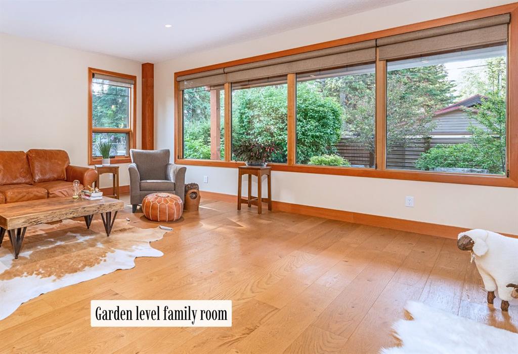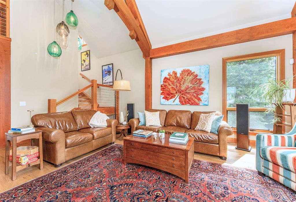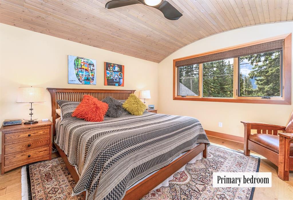 Downstairs, the second living room is bright and welcoming, with high ceilings and a wall of windows looking out over the charming fenced yard where mature and younger trees create layered privacy. Get used to gathering around the firepit under a canopy of stars, or enjoy quiet mornings surrounded by birdsongs. The large front deck captures warm afternoon and evening sun, offering sweeping views across the valley to the Cascade and Lady McDonald ranges—an ever-changing landscape of light, shadow, and alpen glow.