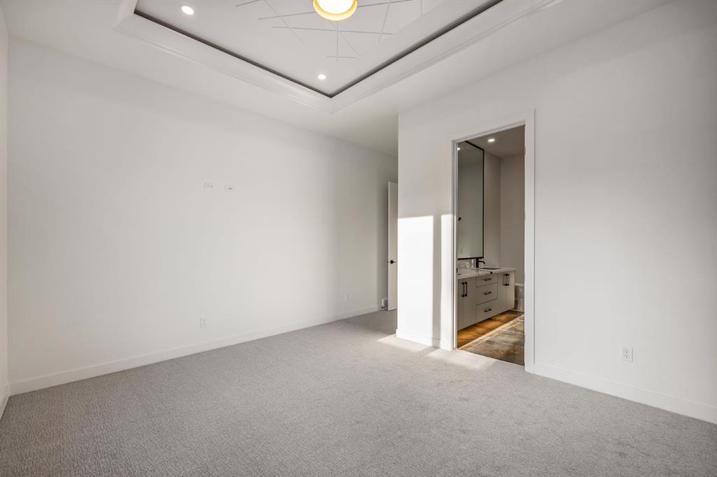 The main floor includes two bedrooms and two full bathrooms, including a primary retreat with tray ceiling and a spa-inspired ensuite featuring a double vanity, a full-width countertop-to-ceiling mirror, oversized tile flooring, soaker tub, tiled shower, and a walk-in closet with custom built-ins. Undermount lighting in the bathrooms adds a refined touch. The second bedroom is bright and spacious for family or guests.