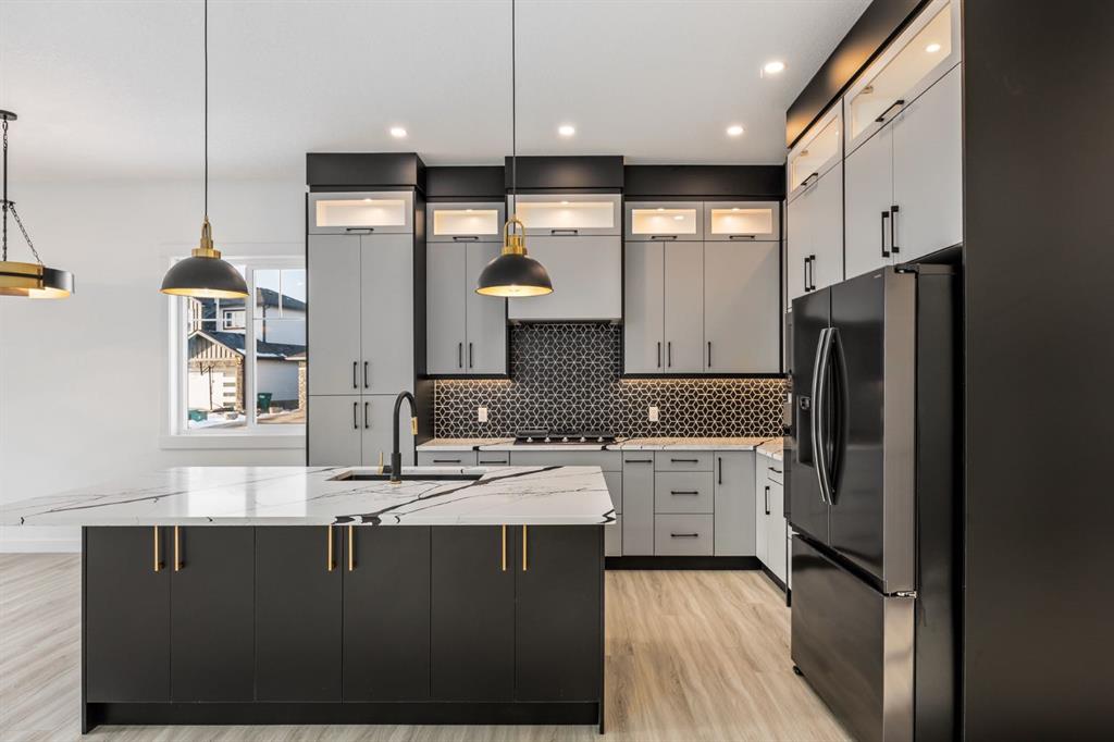 The designer kitchen offers quartz countertops, a spacious central island designed for gathering and hosting, black stainless steel appliances including a gas cooktop, built-in wall oven and microwave, custom cabinetry with built-in lighting, and exceptional storage.