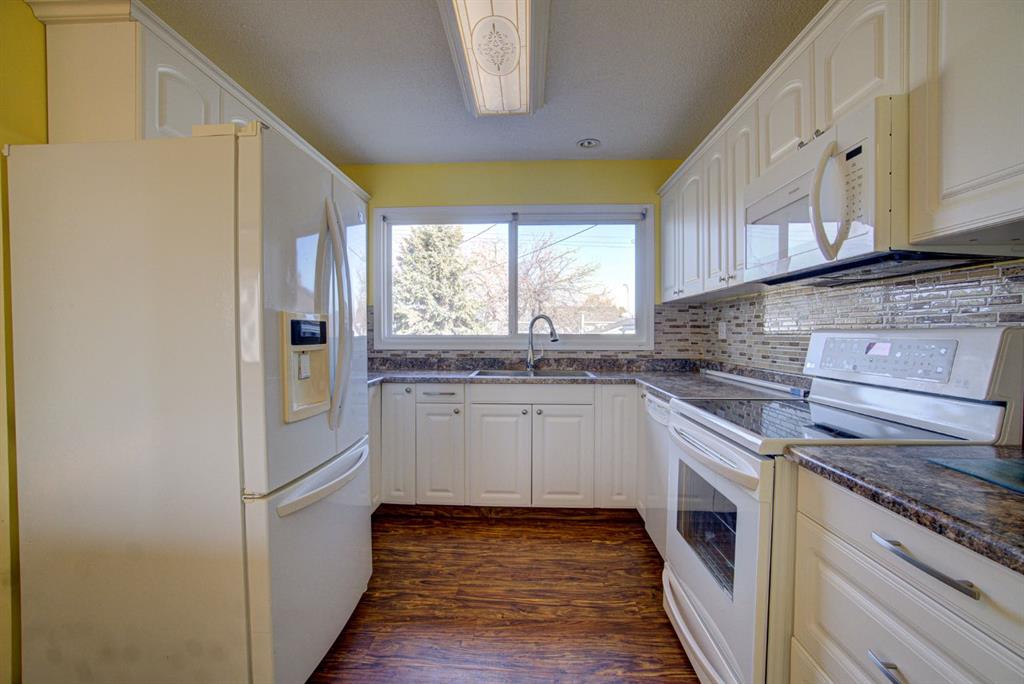 Welcome to your ideal bungalow, centrally located close to downtown, parks, walking paths, and schools. This well-maintained home features a spacious living room with large south-facing windows that flood the space with natural light. The cute and functional kitchen offers updated cabinetry, countertops, and backsplash, with a sink overlooking the backyard. A movable island and a window opening to the living room enhance the sense of space and flow. The separate dining room is highlighted by a large picture window, perfect for everyday meals or entertaining. Two bedrooms are located on the main floor, including a generously sized primary that easily accommodates a king-size bed. Both bedrooms feature full-height closets for excellent storage. A 3-piece main bathroom with a walk-in shower completes the main level. A rear entrance leads directly to your ground-level patio and fully fenced backyard. Downstairs, the basement offers a nostalgic feel with a family room, games room complete with a wet bar, an additional bedroom (see remarks), and a 2-piece bathroom with a shower conveniently located nearby. The property also features back alley access, a large side driveway, and a detached heated garage—ideal for parking, storage, or a workshop. Many perennials throughout the yard as well as raspberry bushes and a raised garden bed. Immediate possession is available, making this a fantastic opportunity to move right in.