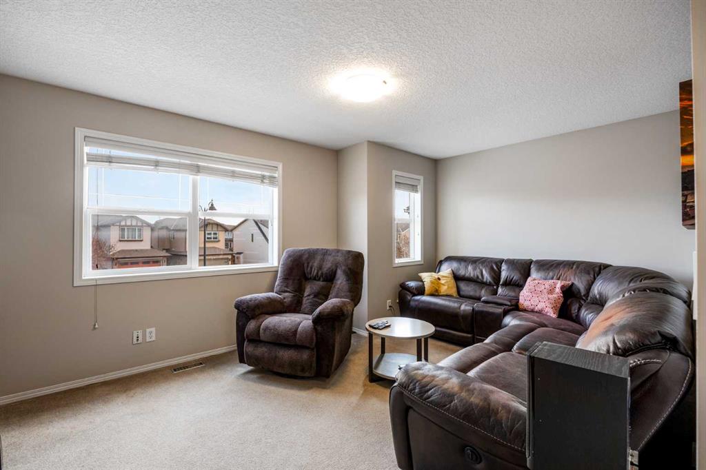 Do not miss this fantastic prospect in Calgary’s deep SE community of New Brighton. A move-in ready gem – two-storey, 2,100 sq. ft. of living space with 3 bedrooms, 3.5 baths, a front-facing, double, attached garage and tons of parking room for the family fleet. Lots of curb appeal because of the tasteful, well-maintained front and back lawns and mature bushes. The main level is open concept highlighting 9-foot ceilings and warm hardwood floors throughout. Massive windows flood the whole area in warm natural light. The living room is made even more inviting with a tiled gas fireplace. Patio doors in the dining room provide access to the deck and backyard. Sleek, modern, dark brown cabinets are featured in the kitchen along with stainless appliances, a corner pantry, granite countertops, tiled backsplash and a breakfast bar/island with deep under counter mounted double sinks. The main level is completed with a 2-pc. bath adjacent to a convenient laundry room. Up to the carpeted second floor, the primary bedroom is its own sanctuary with a 3-pc. walk through ensuite and substantial walk-in closet. Two additional bedrooms share a tiled 4-pc. bath. The finishing touch is a bonus, well-windowed room which could be utilized as a family room or home office. The lower carpeted level is fully developed with a rec room for family enjoyment, a 4-pc. bath and a utility/storage room. A gigantic south-west facing backyard is fully fenced to give you your own private outdoor retreat. A railed wooden deck allows you to expand your summer entertainment area. The yard would be a delight for gardeners and hobbyists with a green thumb. Location here is key with quick access to Deerfoot and Stoney Trails, 52nd Street SE and a Walmart Supercentre, additional shopping and restaurants on 130th Avenue SE, schools (public and Catholic), child care, playgrounds, transit, New Brighton Resident Association, New Brighton Central Park and the South Campus Health Centre. Don’t let this opportunity pass you by.