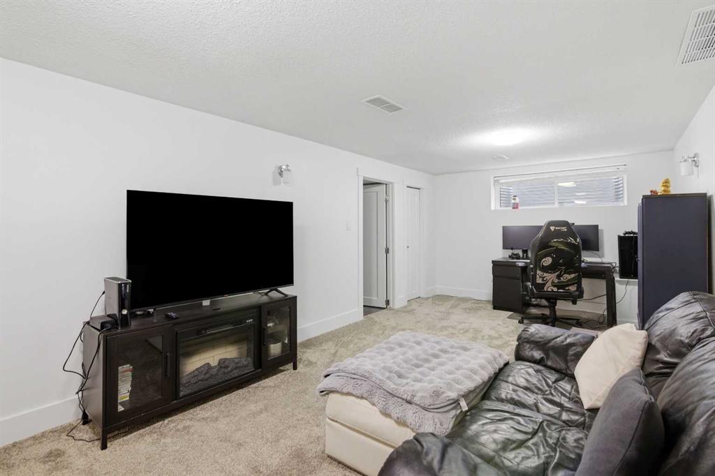 Downstairs there’s a cozy carpeted area with an additional bedroom, a big family room, and a fantastic bathroom featuring a double soaker tub and a glass shower with jet spray nozzles.
